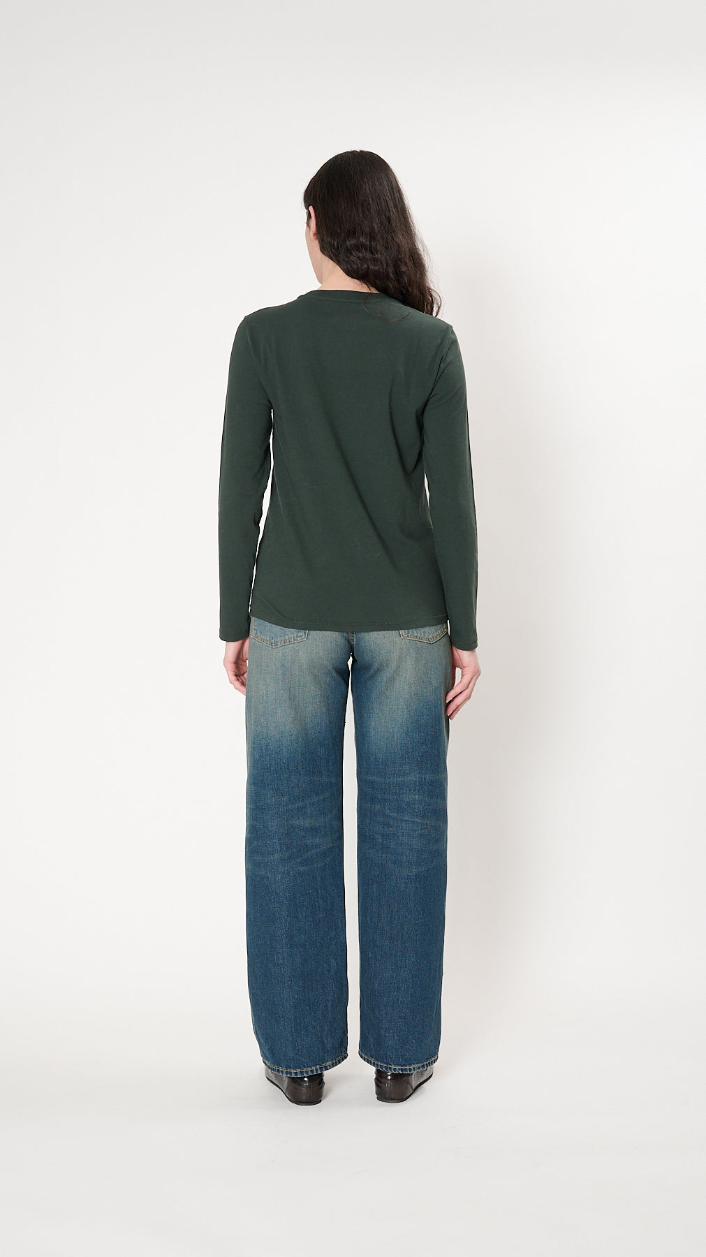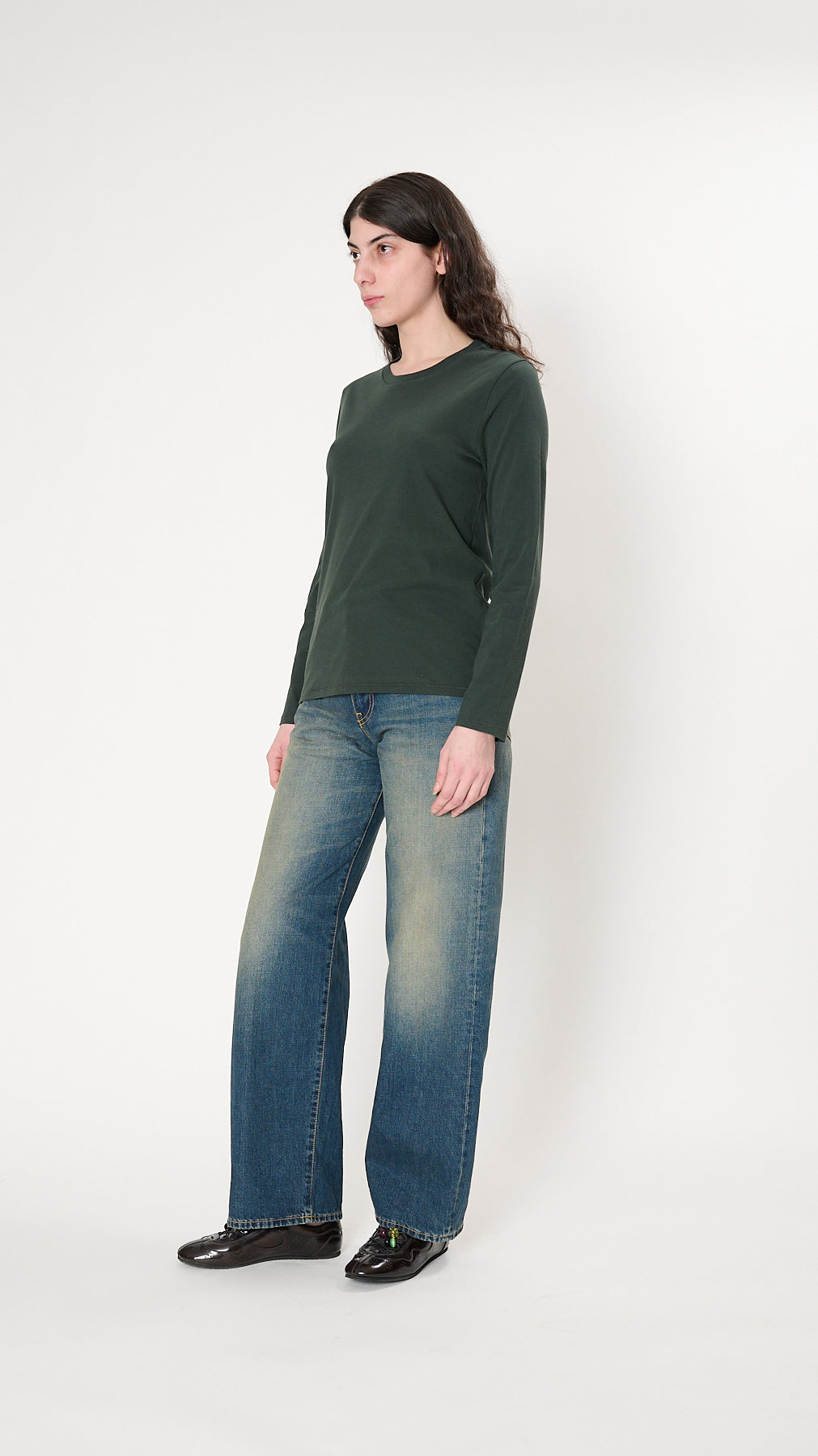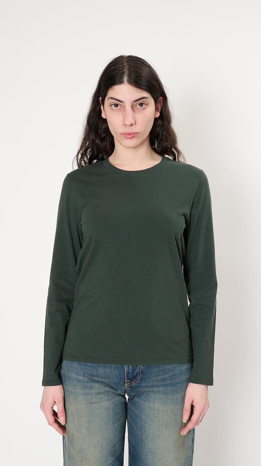 The Long Sleeve Mini Boy T has a relaxed silhouette made of soft, washed cotton jersey. It features a ribbed crew neckline and a shrunken body.