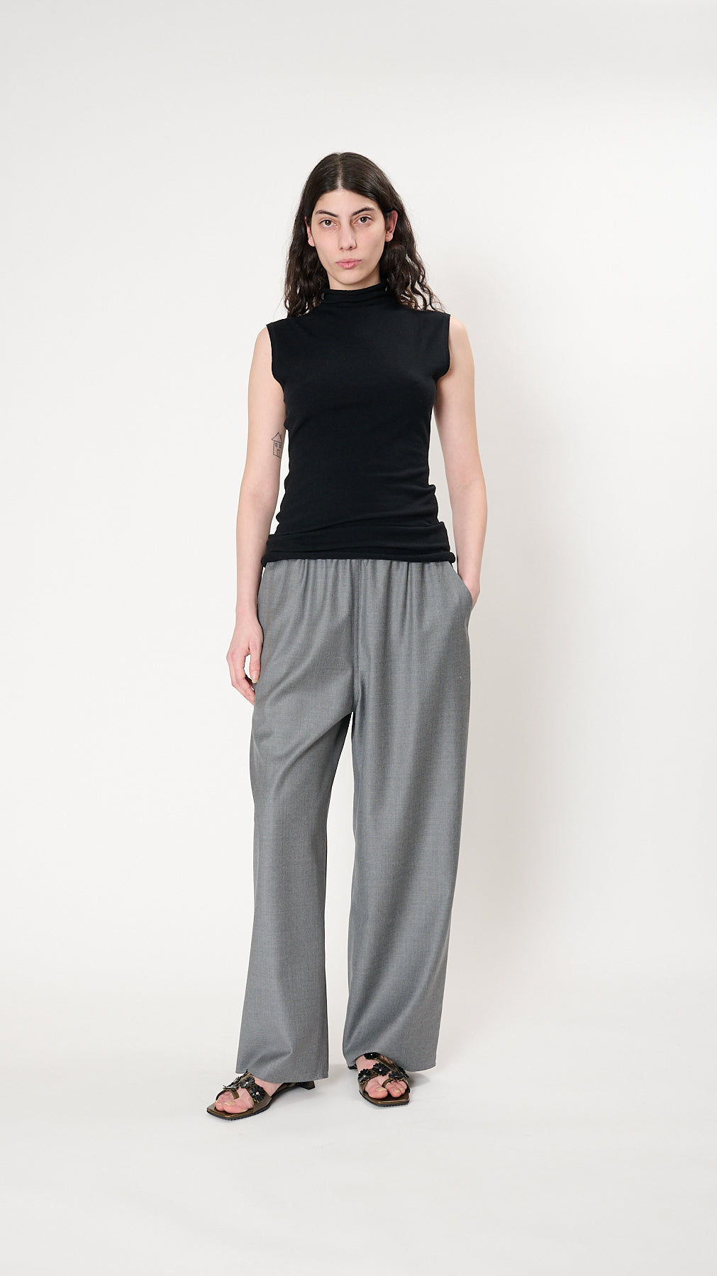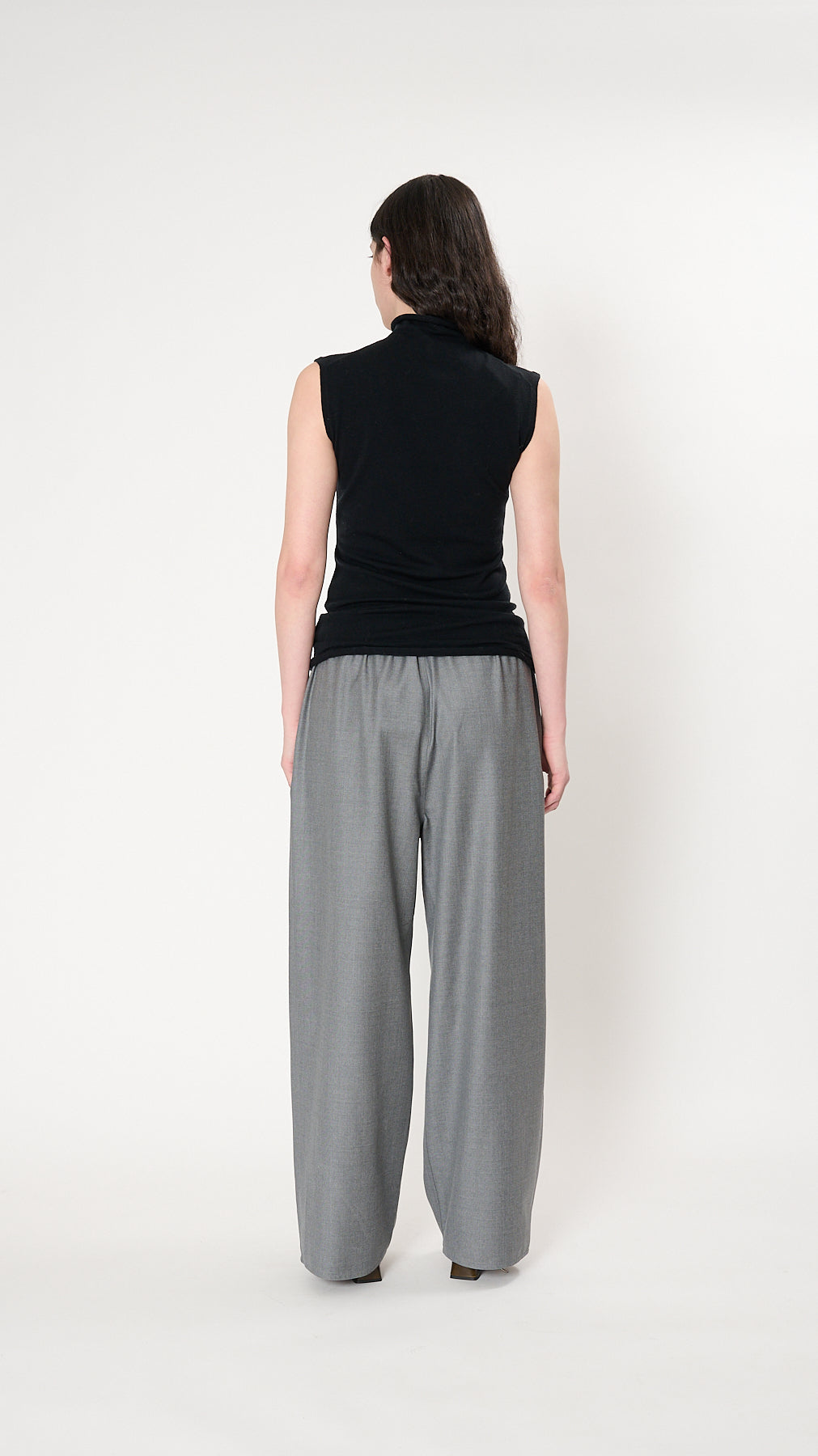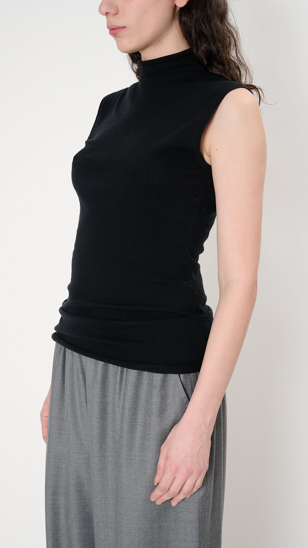 The Roll Neck Tank has a fitted silhouette made of a lightweight merino yarn. It features a rollneck and sleeveless design.
