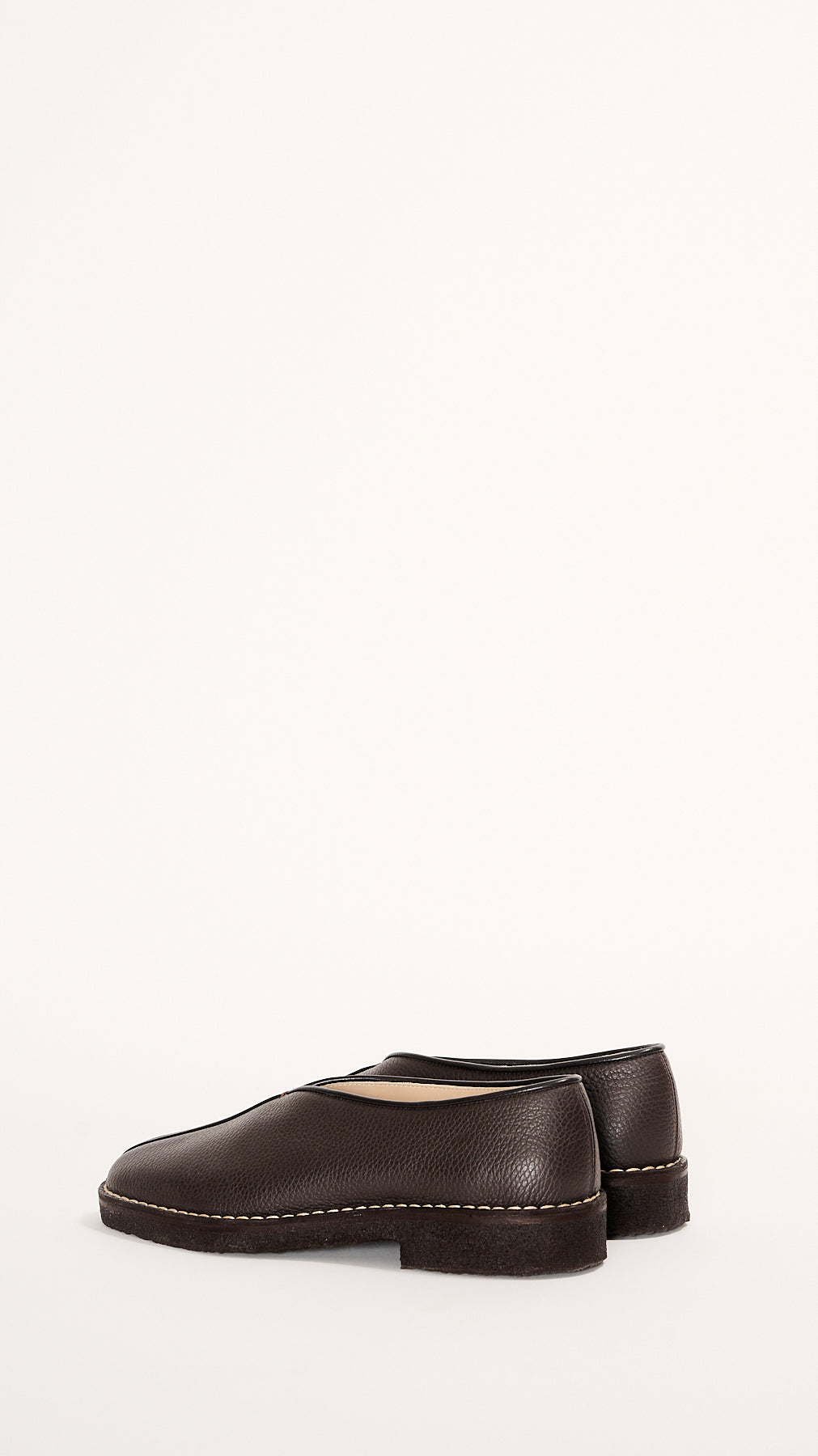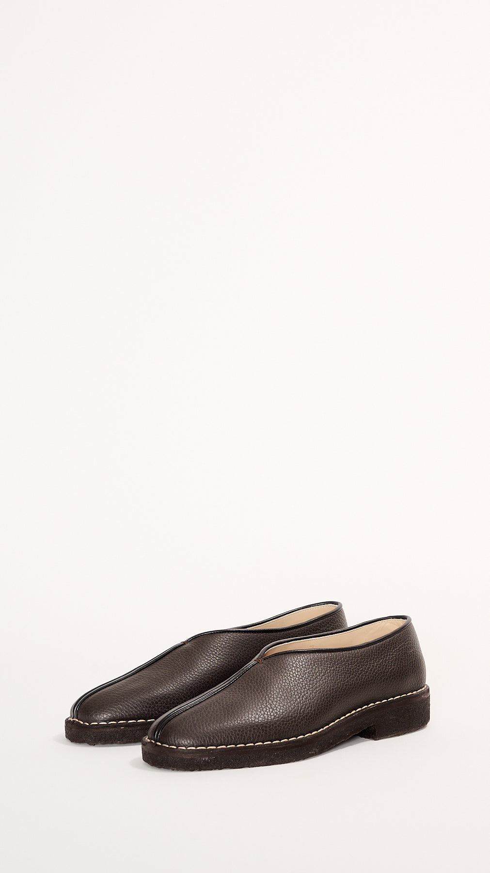 The Piped Crepe Slippers are a classic Lemaire shoe made in a simple construction of two pieces of leather that are sewn together on the front. They feature a square toe and crepe sole with piping details.