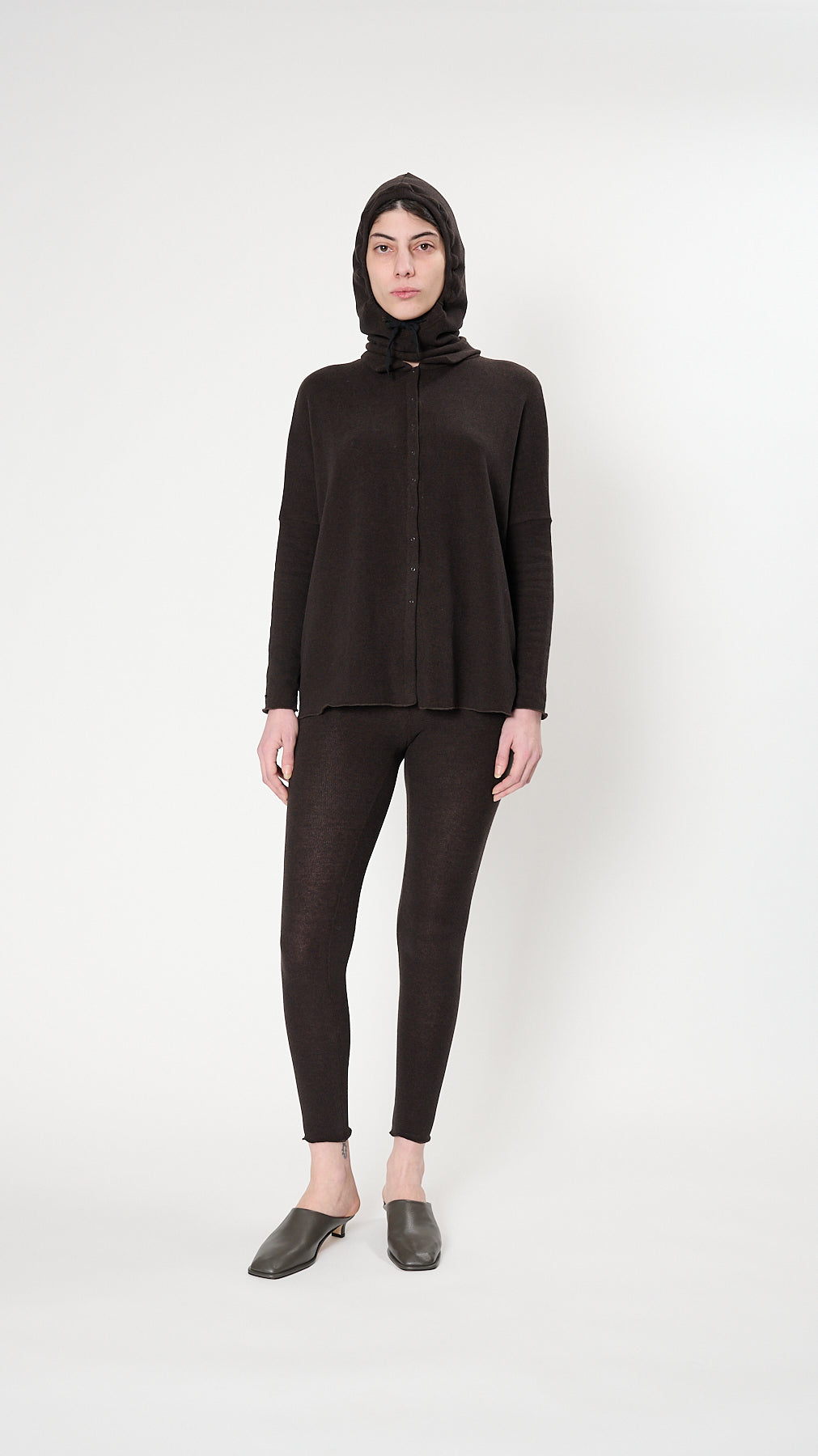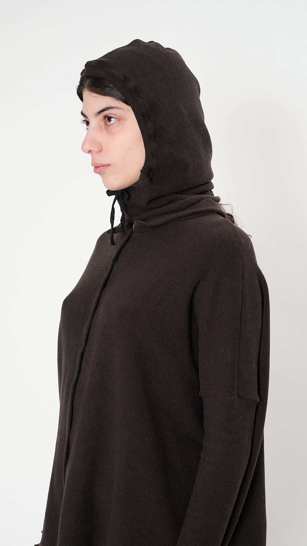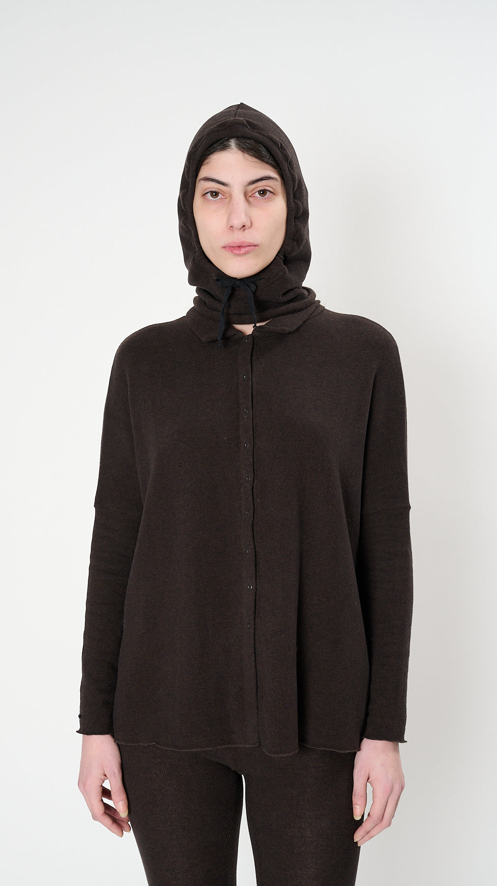 The Cagoule JP is a balaclava-style hood made of their signature cozy cotton-blend JP fabric and features adjustable draw strings.