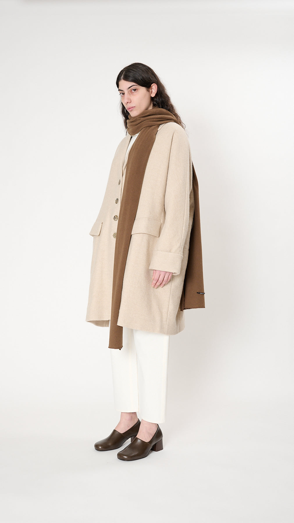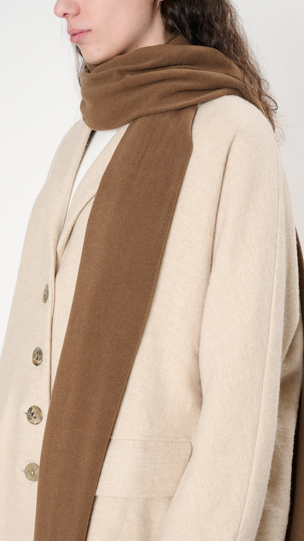 The Sciarpone JP is a wide-knit scarf made of their signature cozy cotton-bend JP fabric.