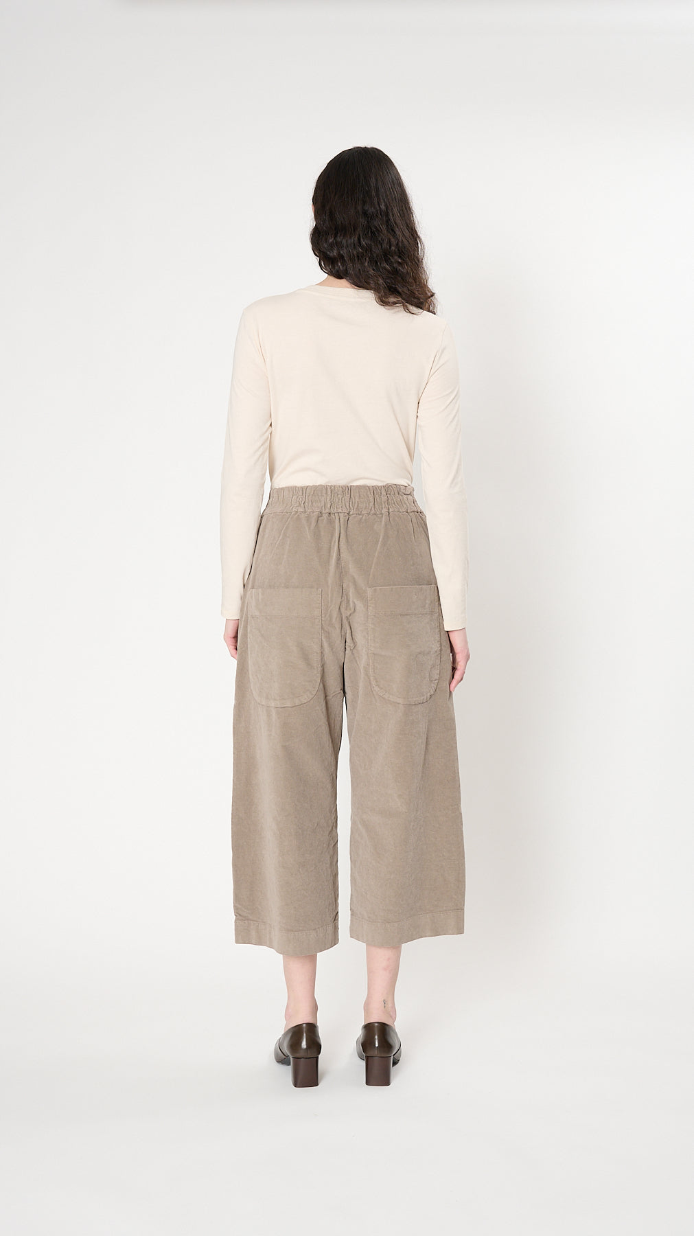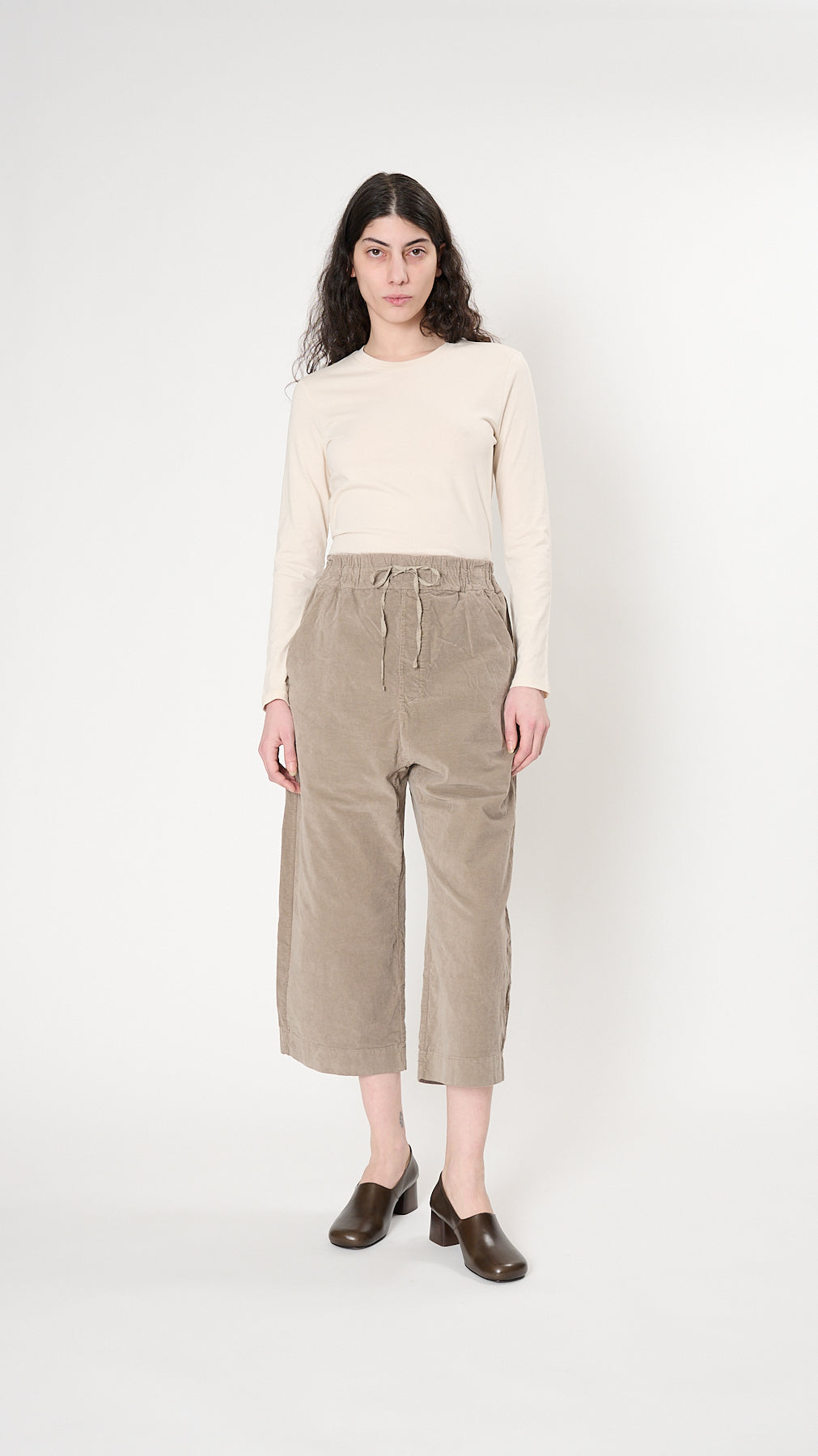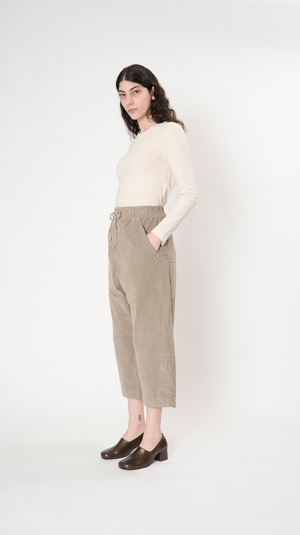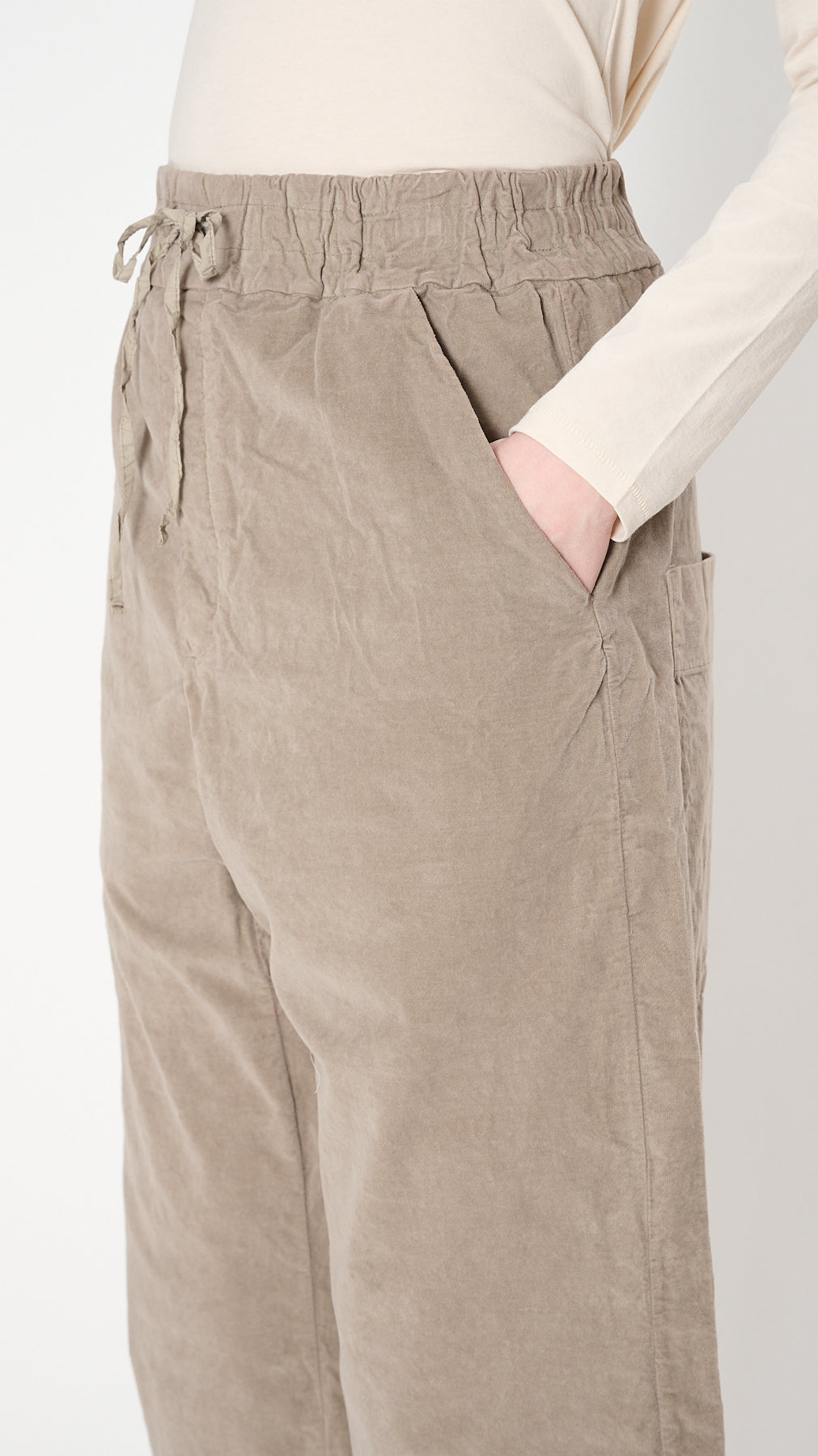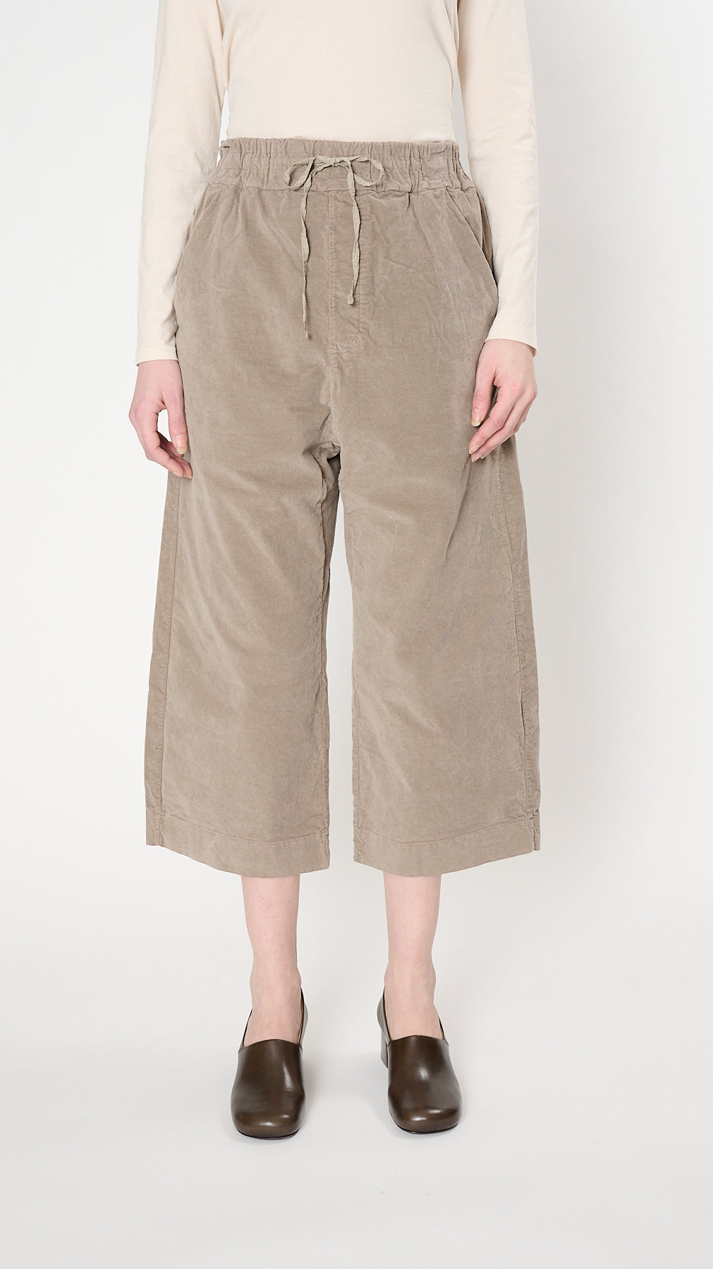 The Wide & Short Trousers Velvet have a relaxed fit with a wide, cropped leg crafted of cotton velvet. They feature an elasticized waistband with a self-tie drawcord, dropped crotch, side pockets, and low back patch pockets.