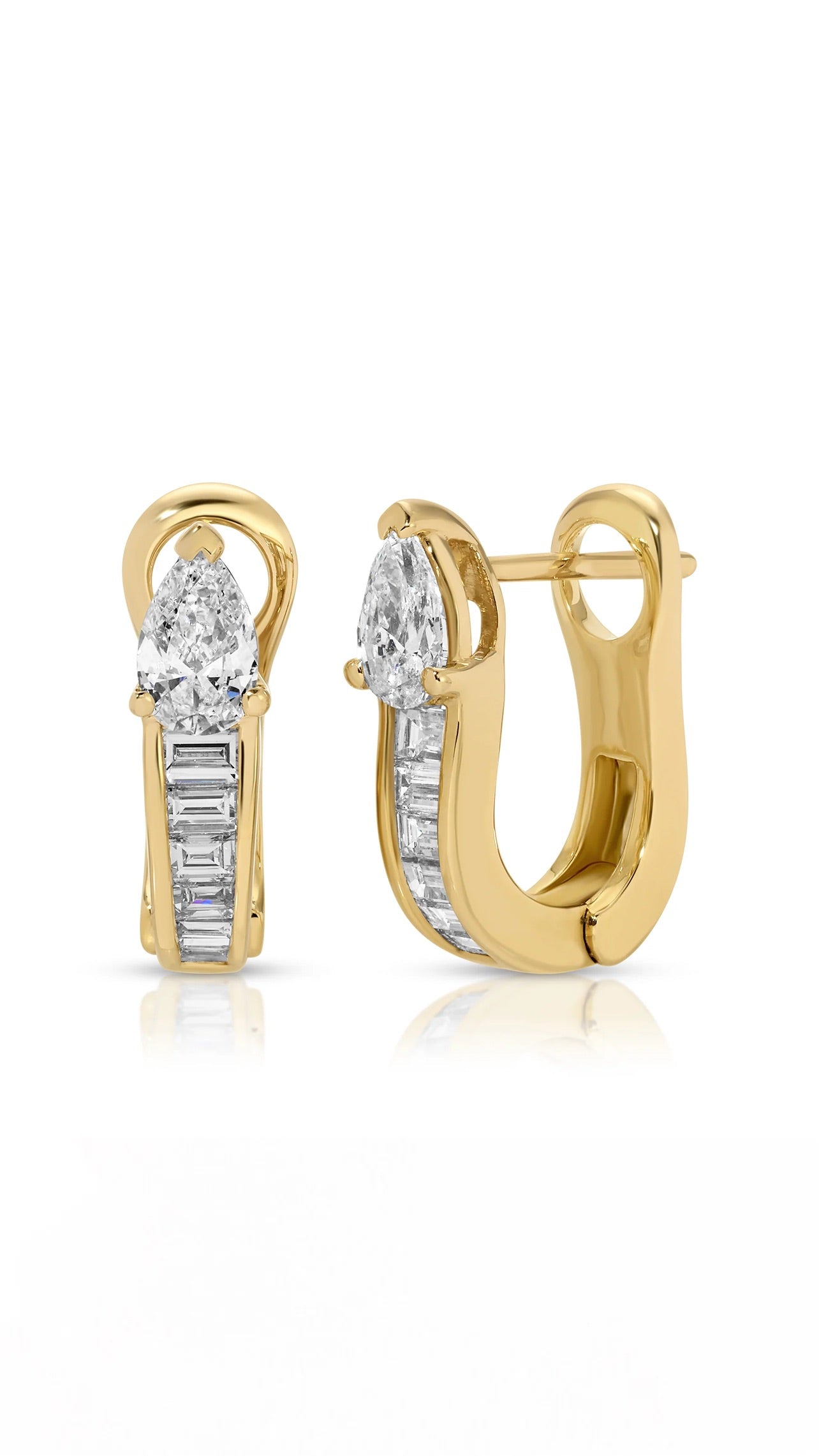 The Saturn Huggies are made of 18k yellow gold and have a pear-shaped top diamond with baguette diamonds running down the front channel. These have a hinge-pin fastening and are sold as a pair.