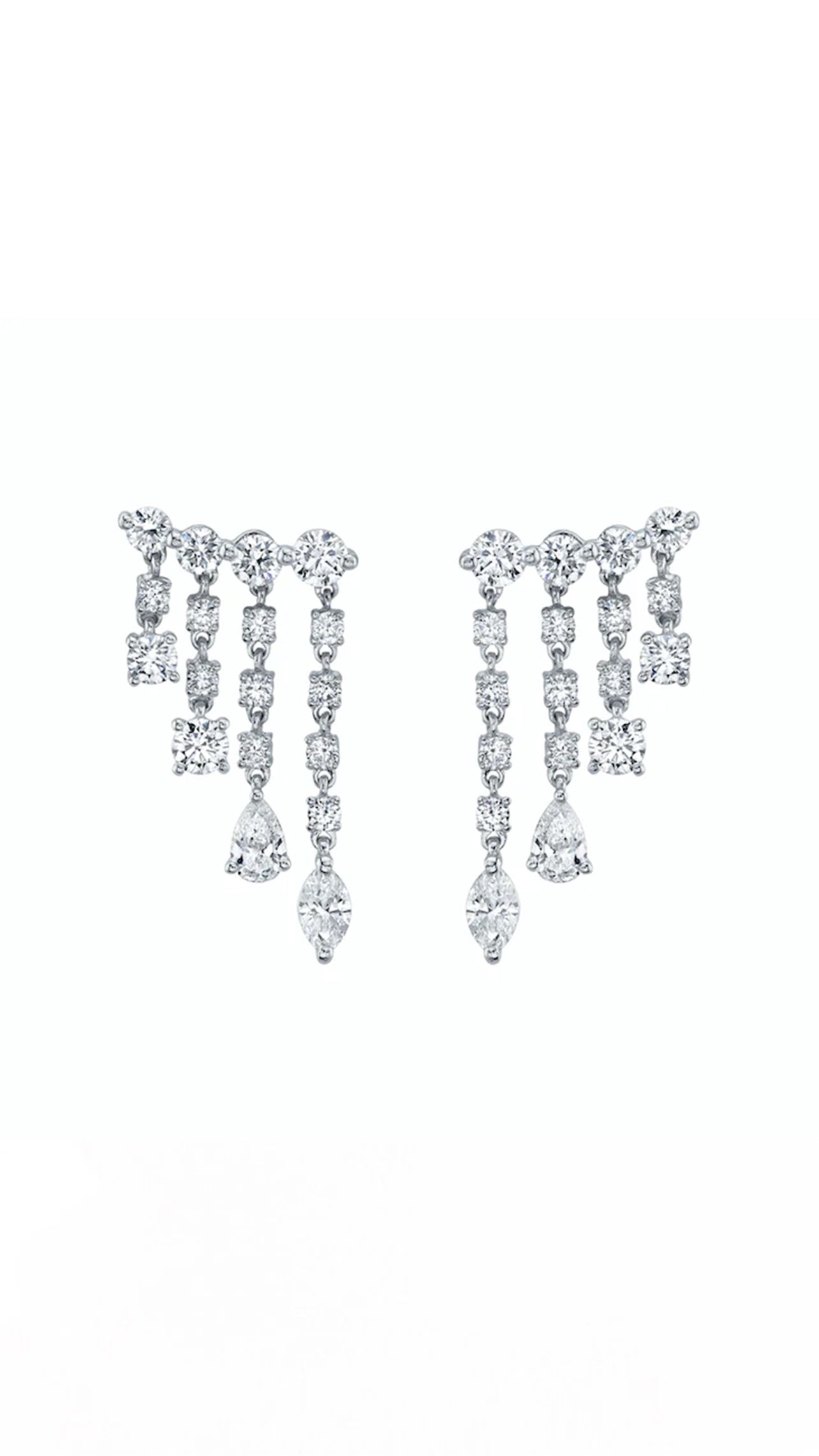 The Small Diamond Raindrop Earrings are made of 18k white gold lined with four rows of cascading diamonds, showcasing different cuts. Finished with a post and butterfly back and sold as a pair.