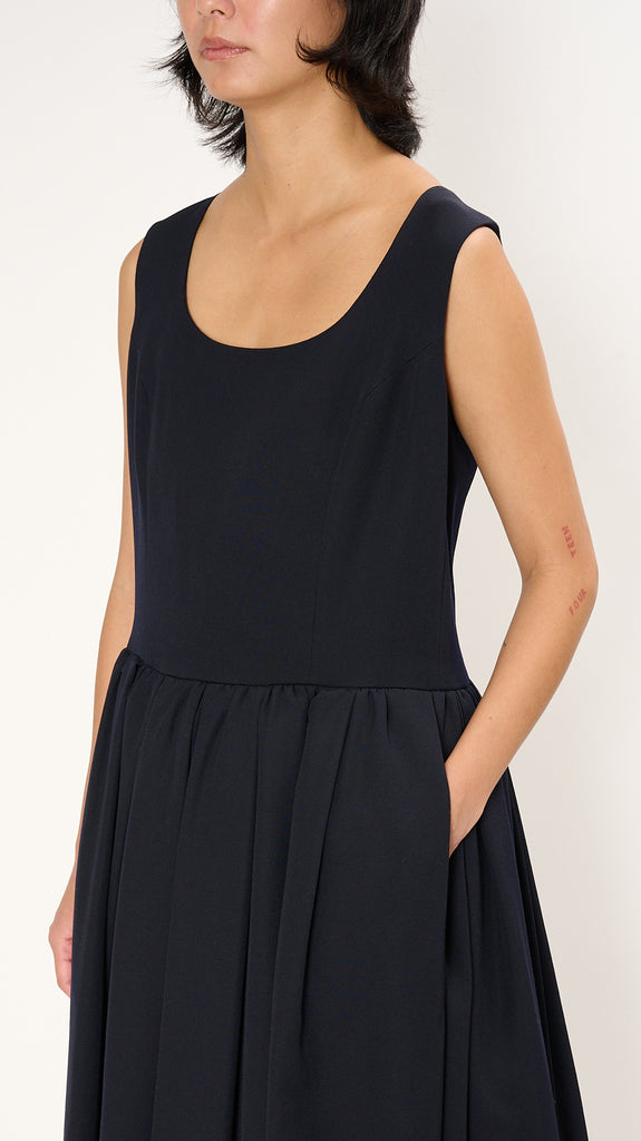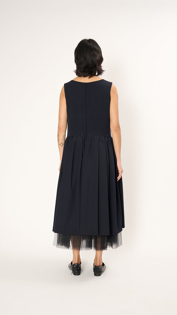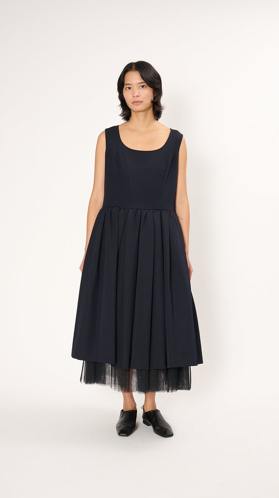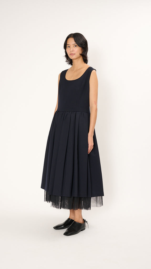 The Wool Tulle Layer Dress has a sleeveless, ankle-length silhouette made of a fine wool with a tulle underlayer. It features a scoop neckline, sleeveless styling, drop gathered waist, side seam pockets, and a back zip closure.