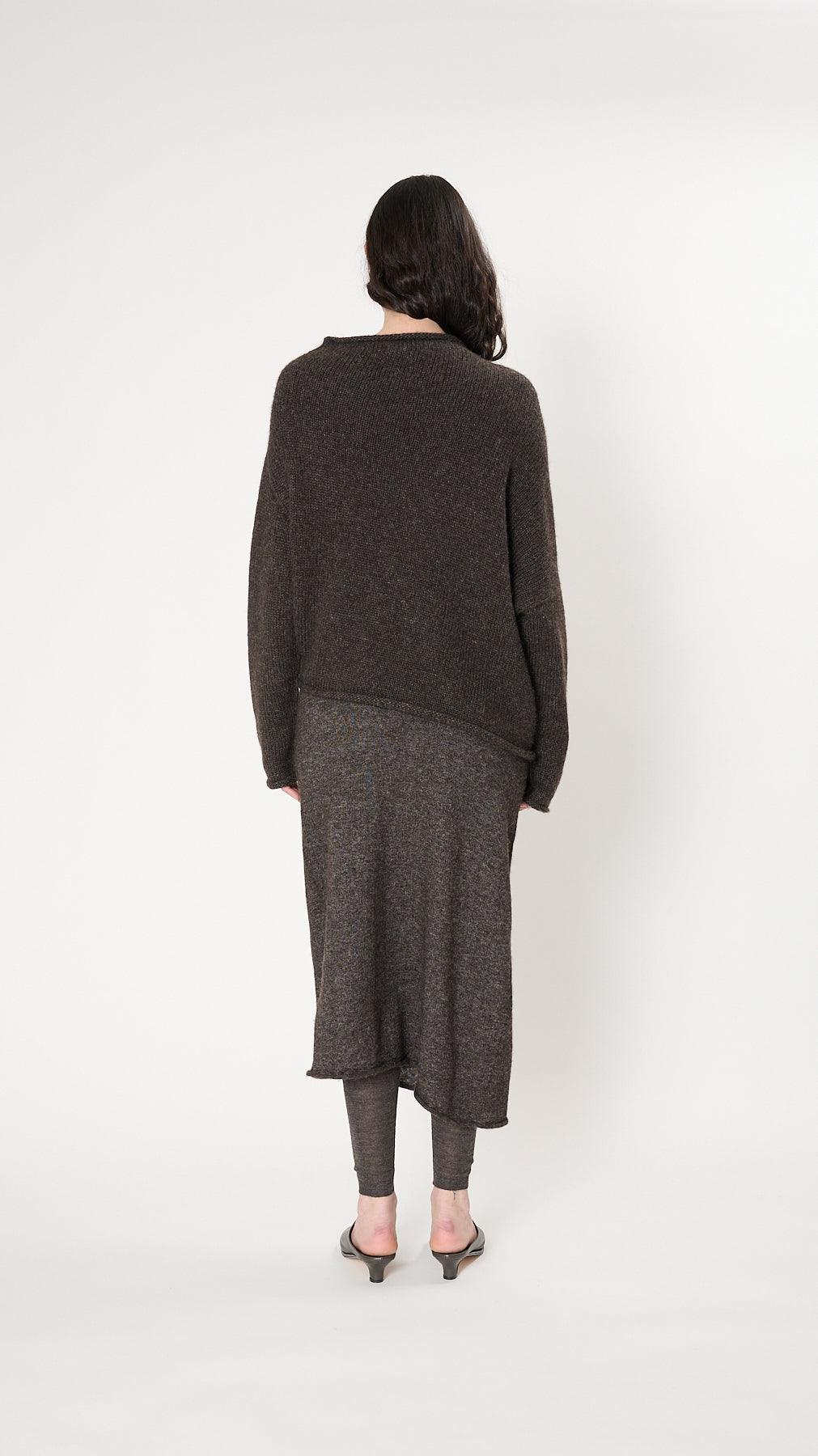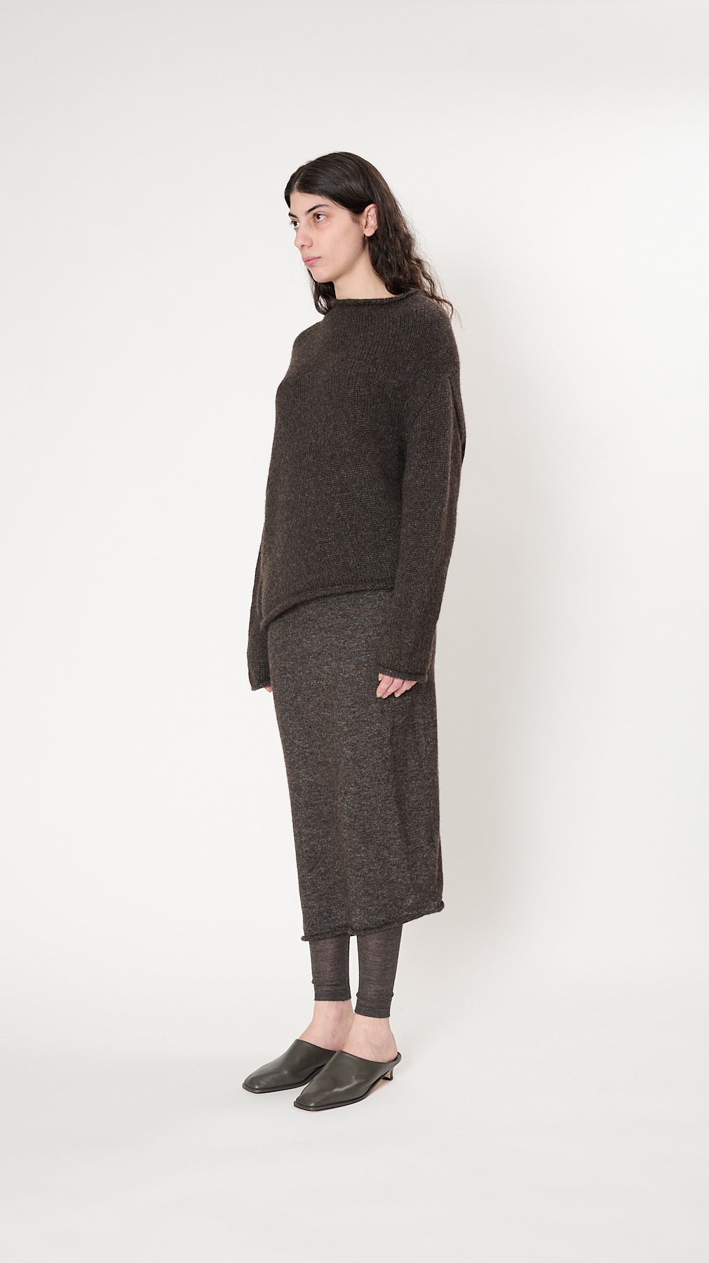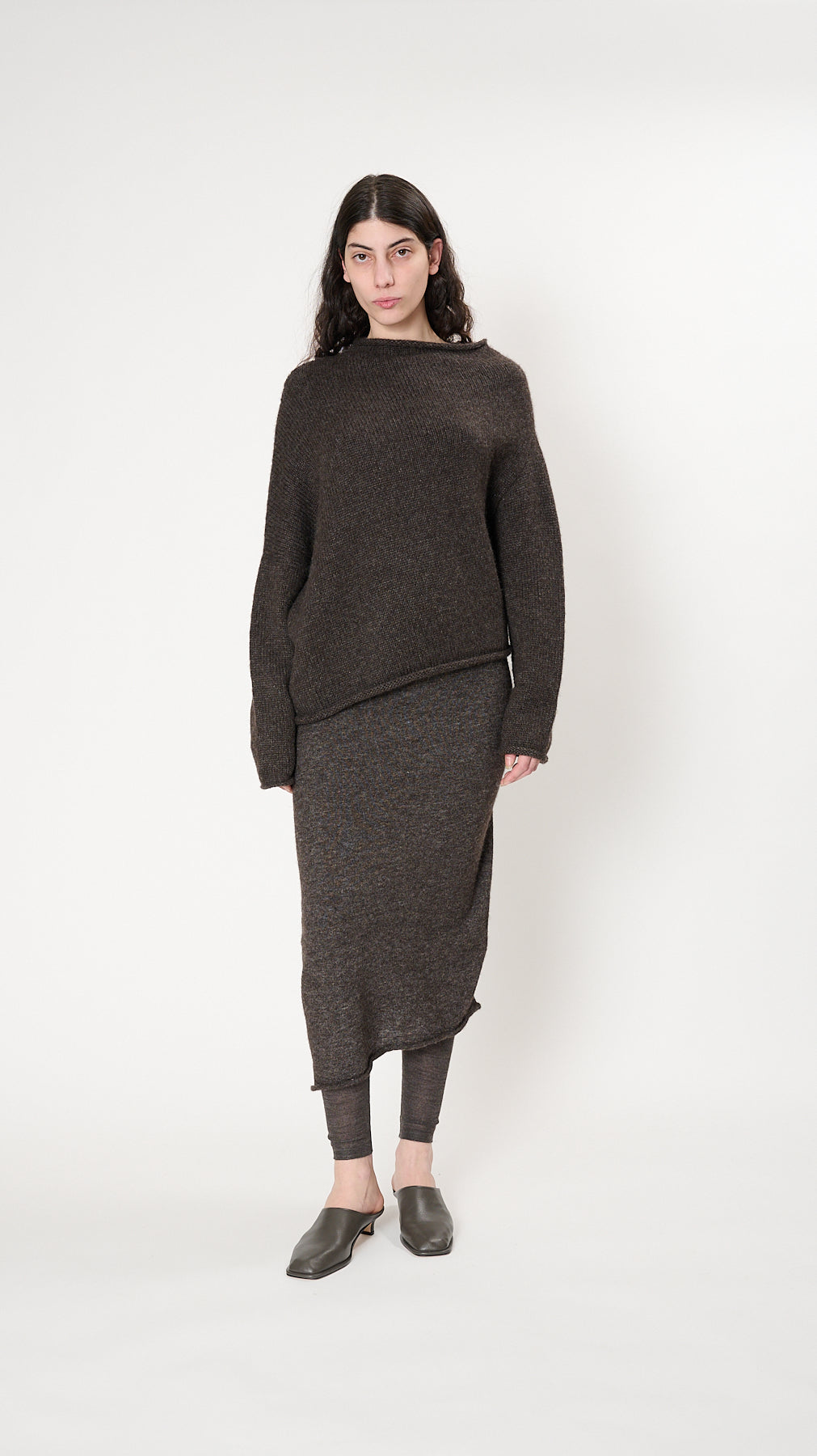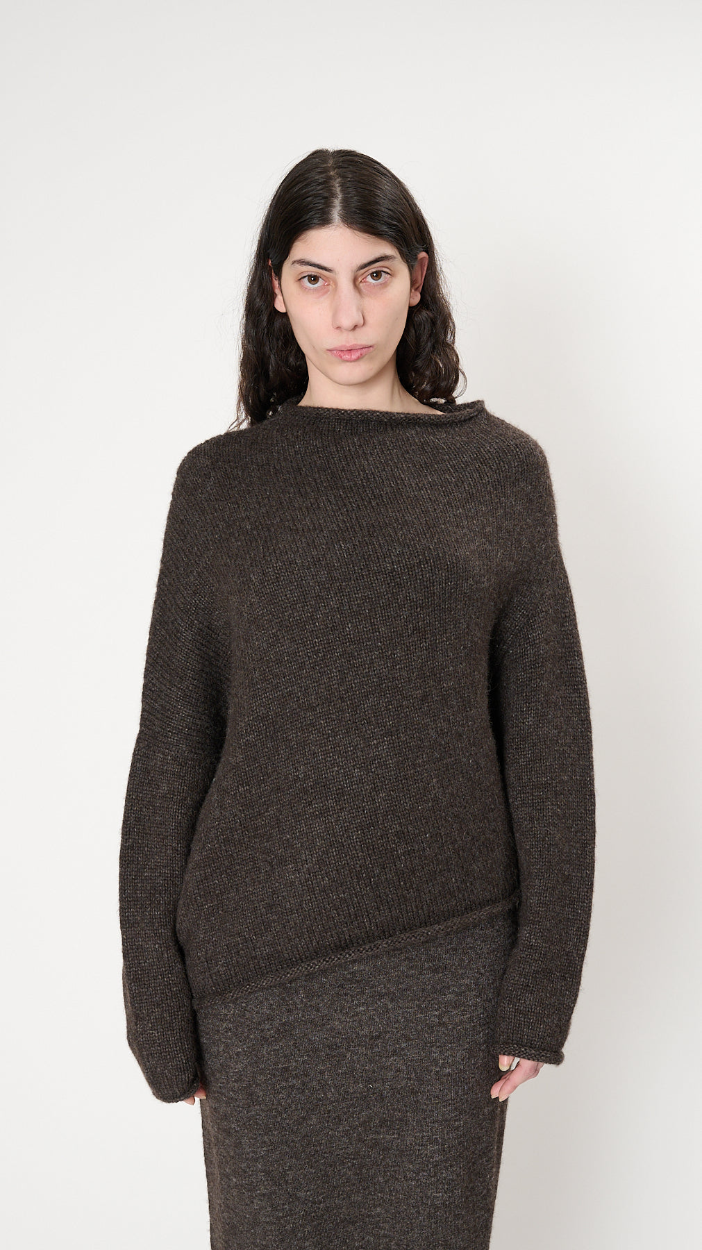The Askew Pullover has a relaxed silhouette knit of fine, fuzzy alpaca-blend. It features a circular seamless construction, asymmetric hem, and rolled edges.