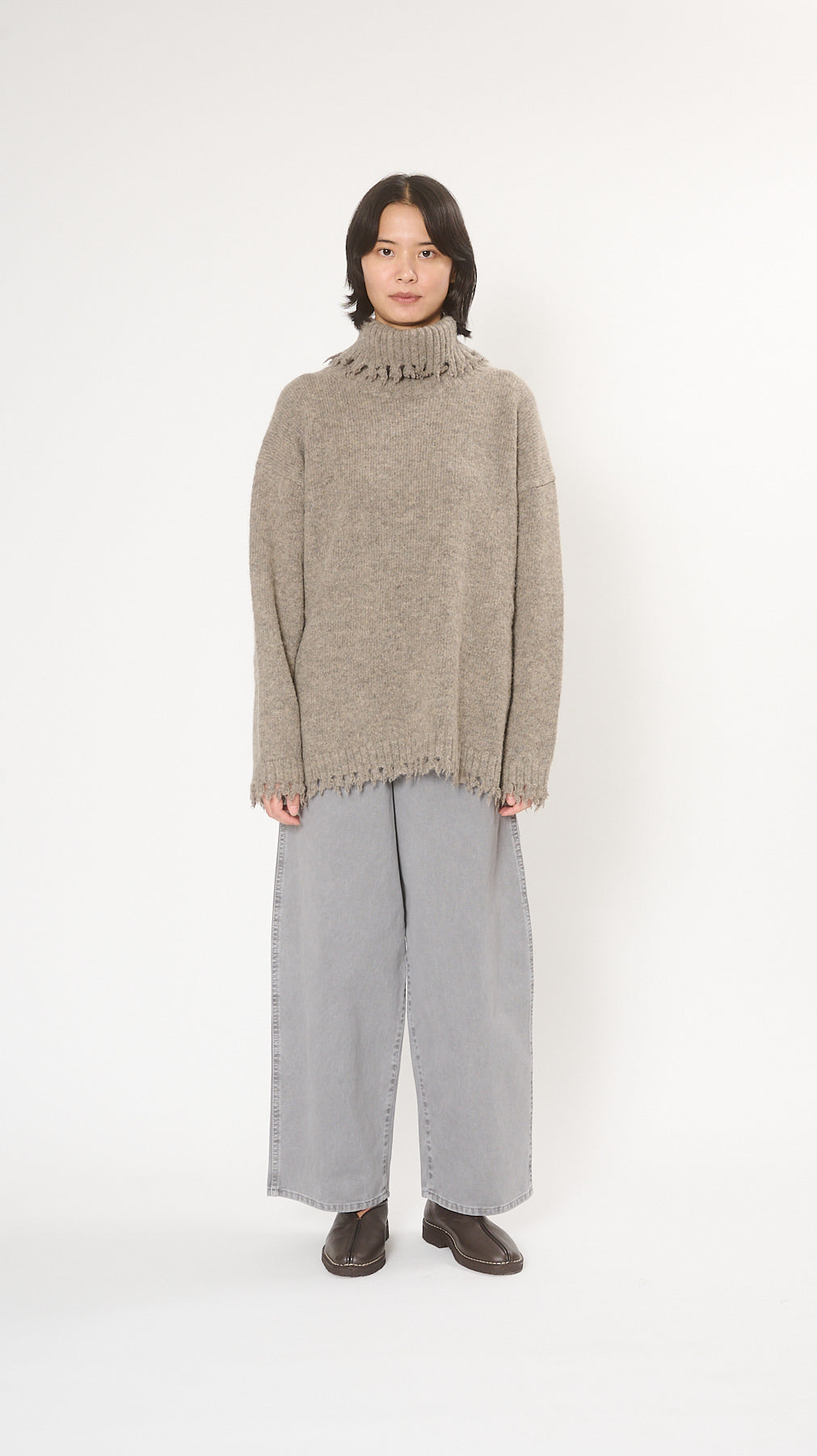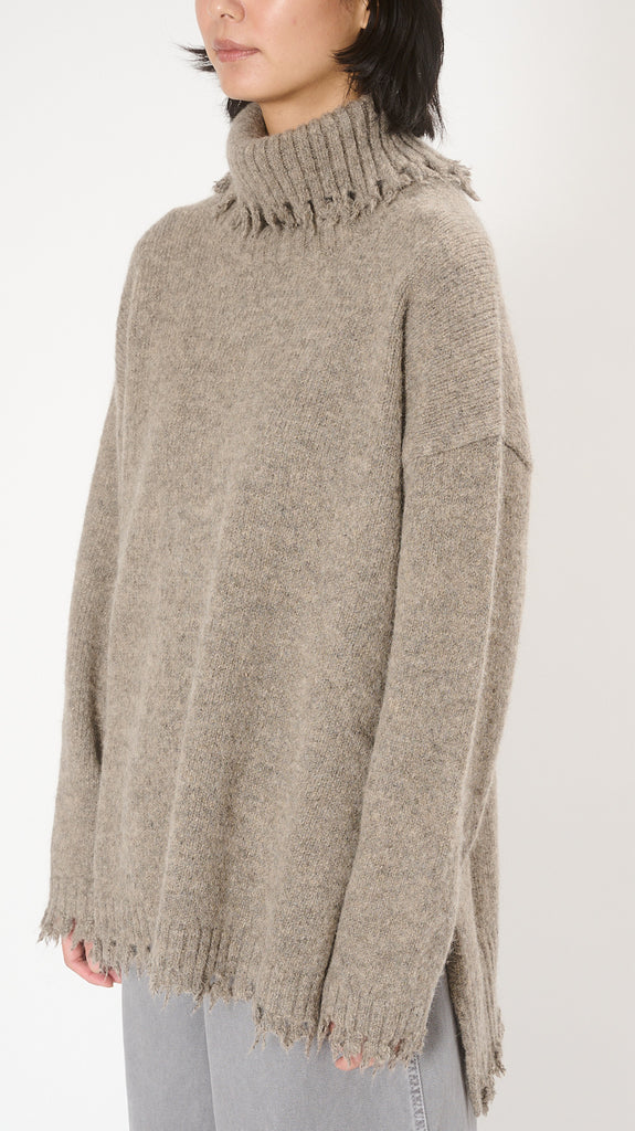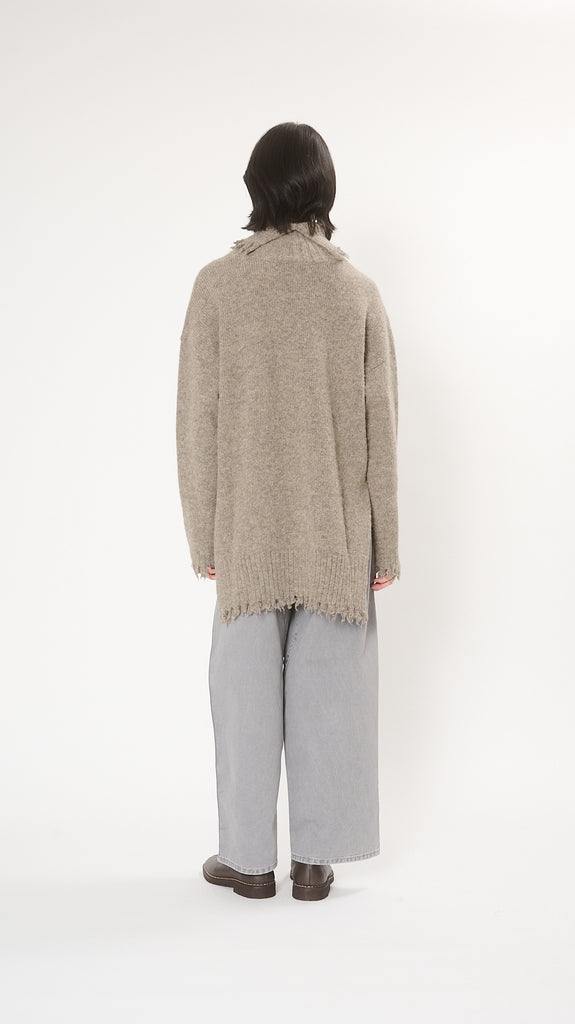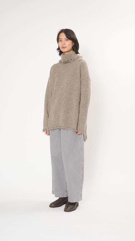 The Fray Turtleneck has an oversized silhouette made of a soft, baby alpaca-merino blend. It features a ribbed turtleneck, hem, and sleeve cuffs with intentionally frayed edges.
