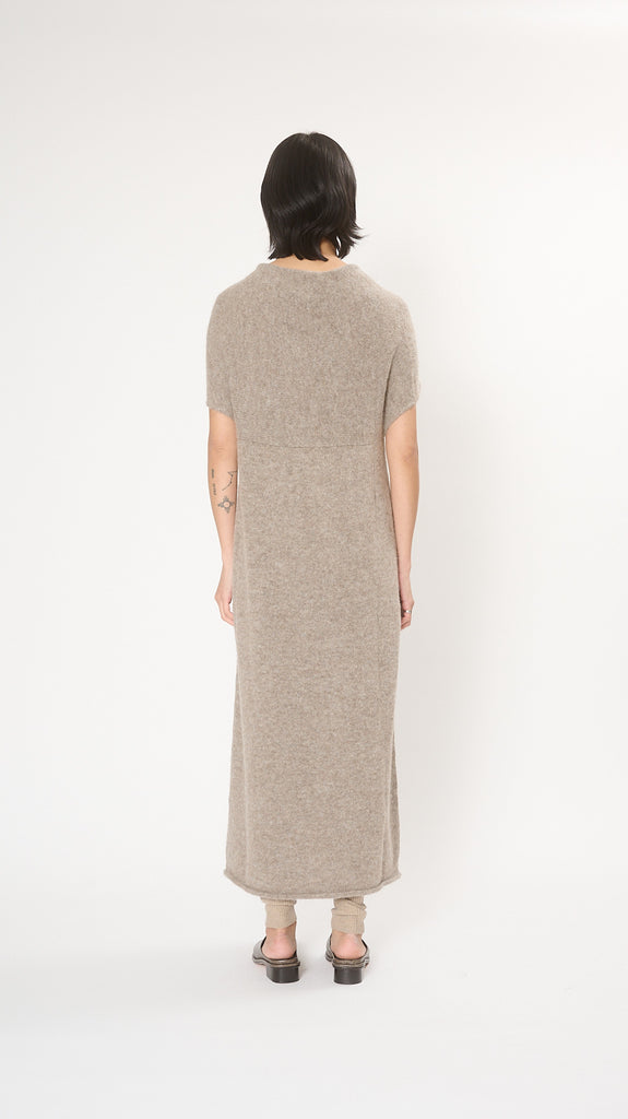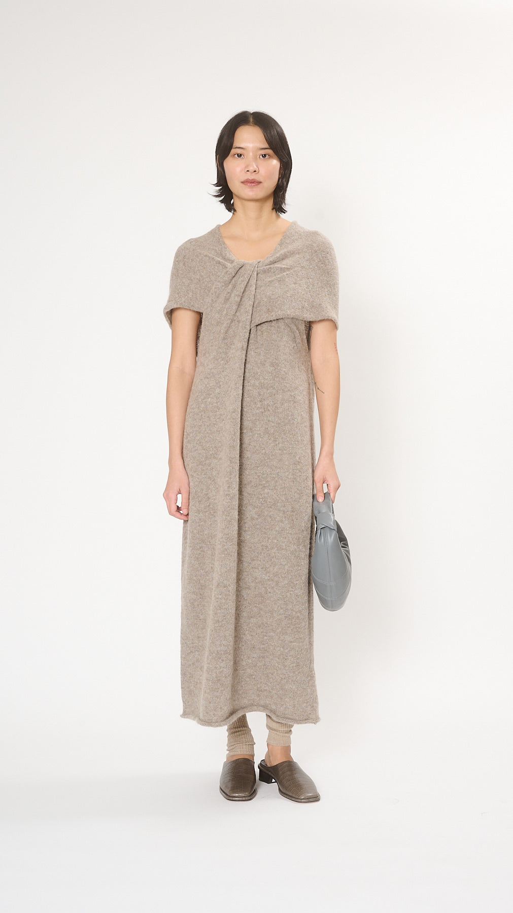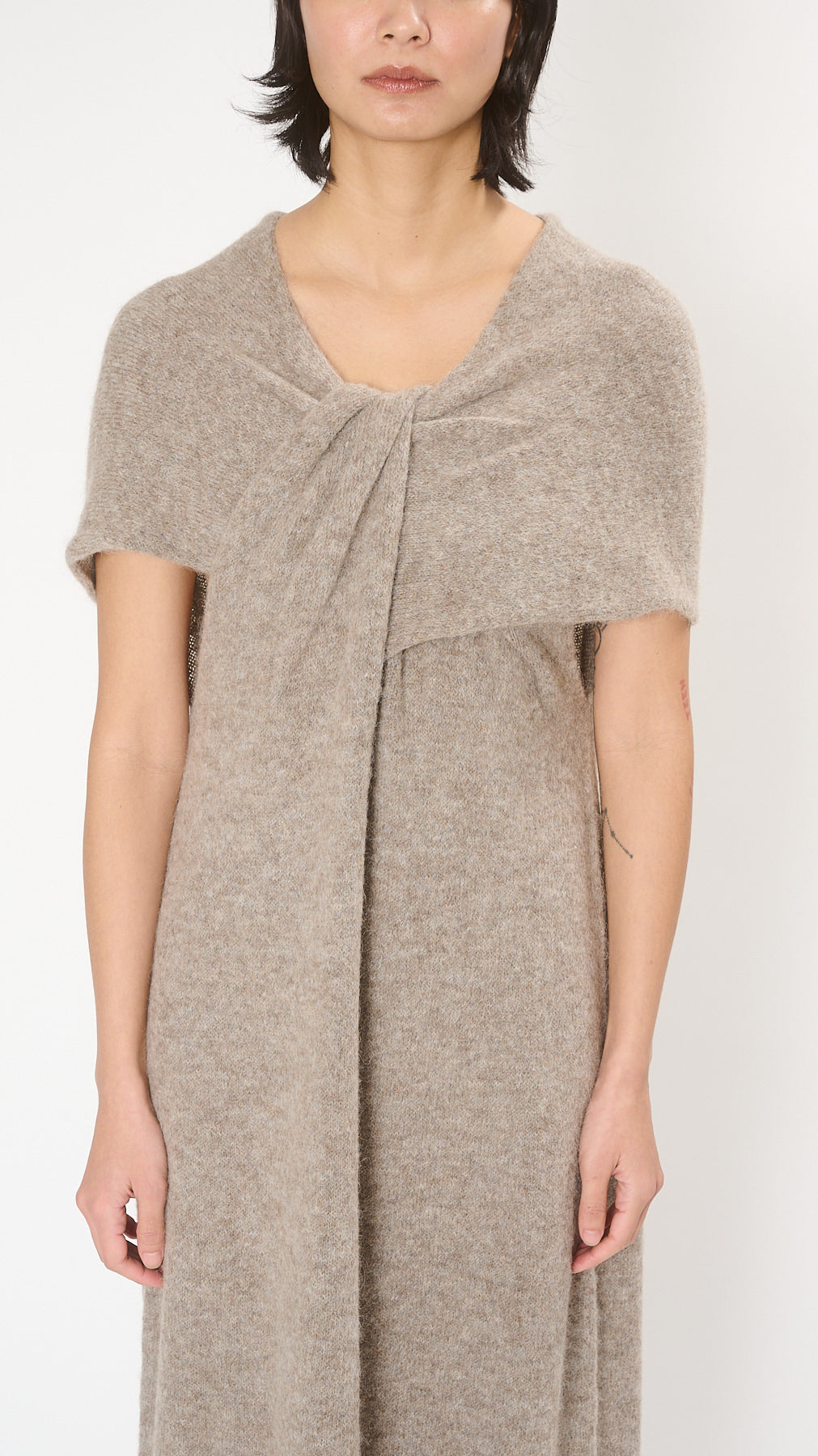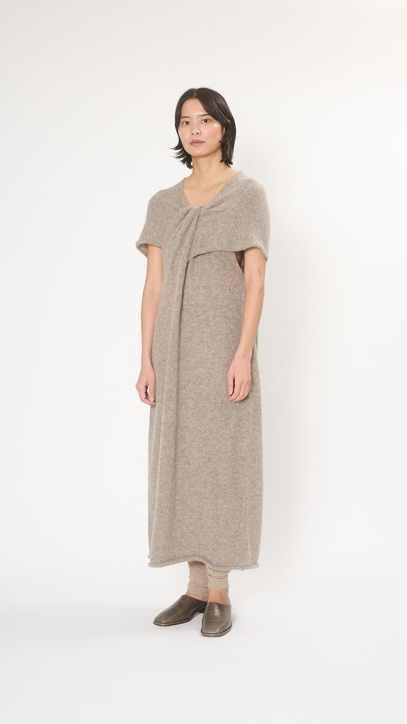 The Knot Dress has a relaxed, full-length silhouette made of a soft, handloomed suri alpaca-blend. It features asymmetric shawl shoulders, with knotted drape detail, and a back hem slit.