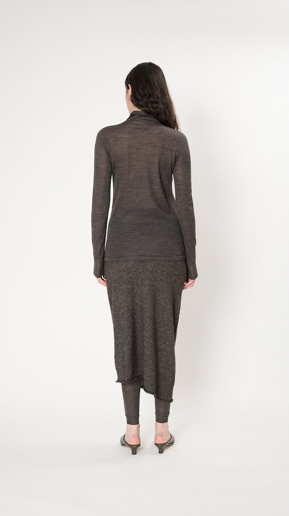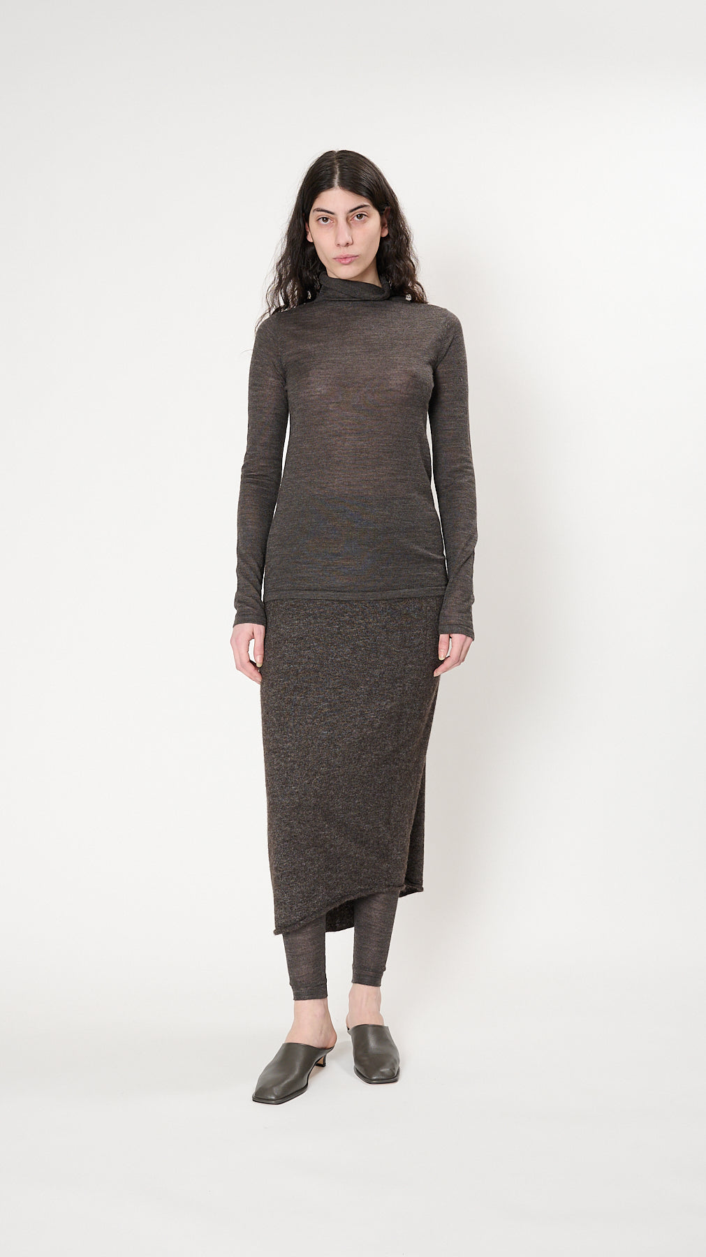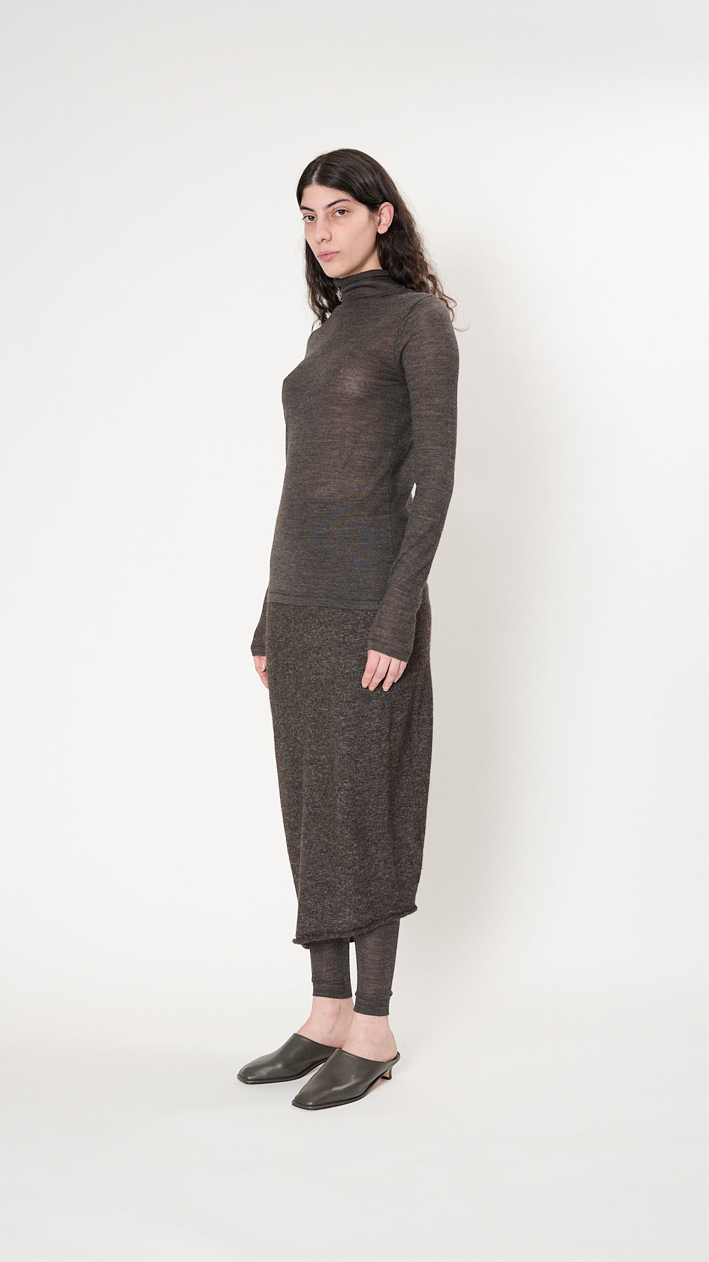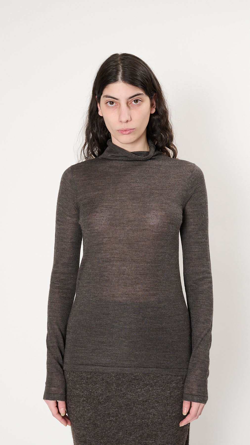 The Super Fine Funnel has a fitted silhouette with a high neckline and full-length sleeves. It's knit of fine high-gauge alpaca-silk-merino blend yarn and has a clean self finish.