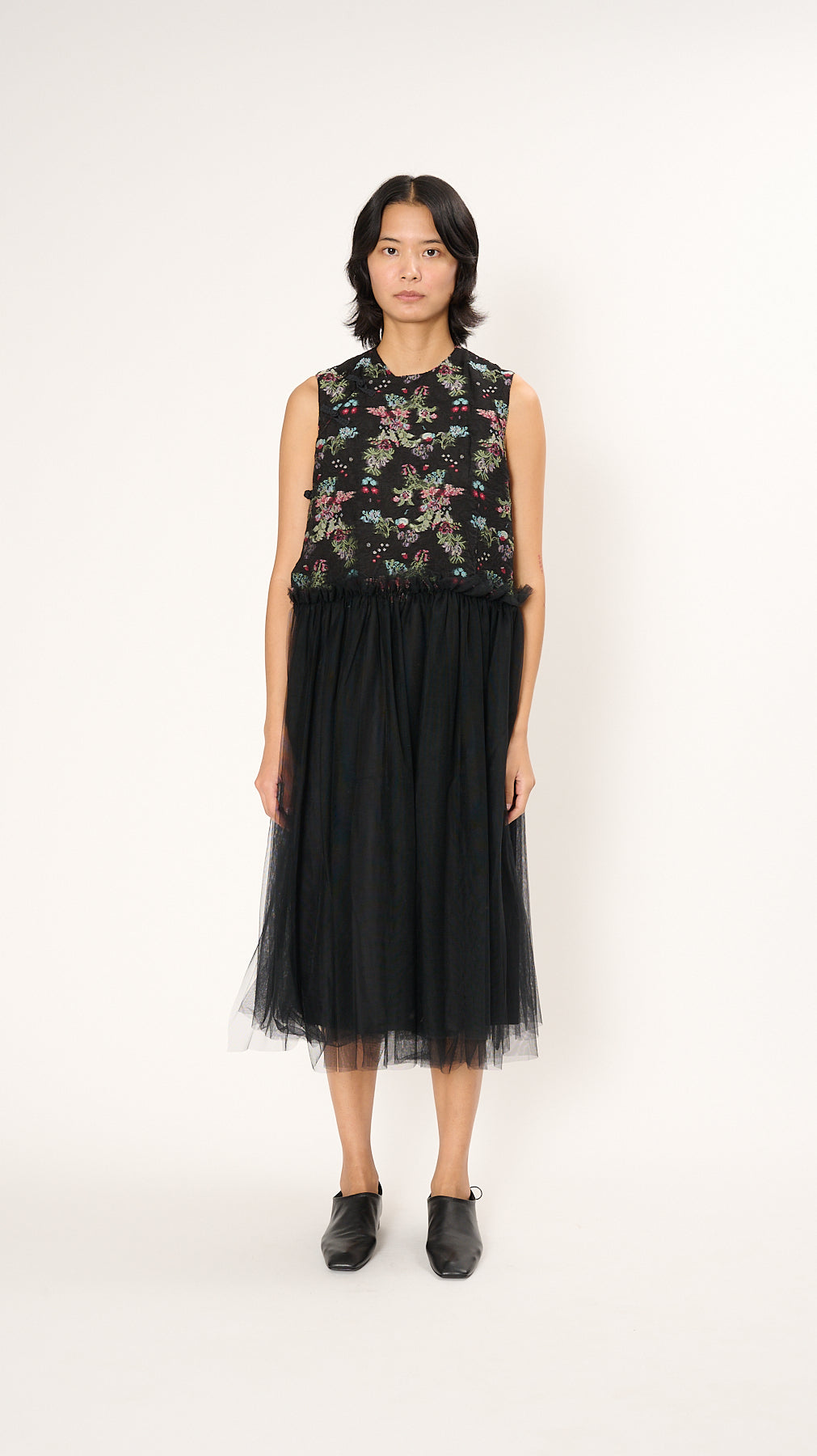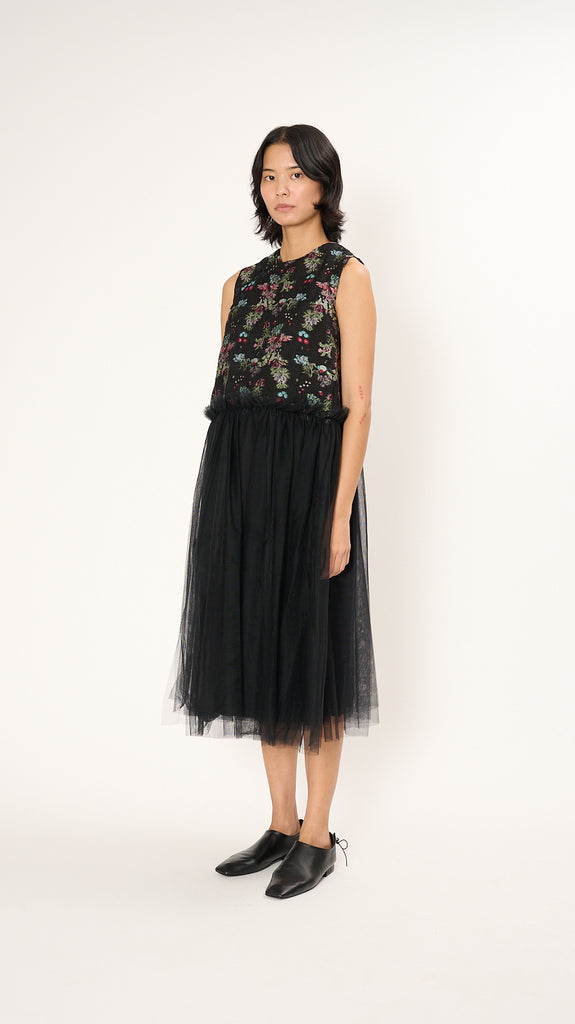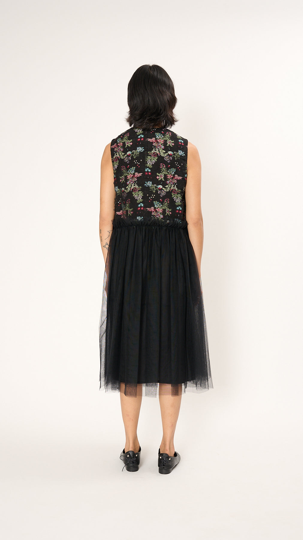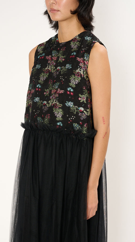 The Floral Jacquard Dress has a relaxed, mid-length silhouette. It features a floral jacquard bodice and a gathered tulle skirt.
