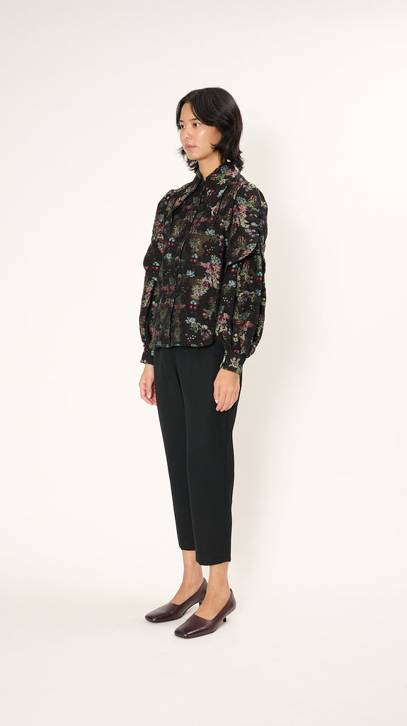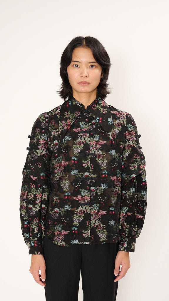 The Floral Jacquard Blouse has a relaxed silhouette made of semi-sheer floral jacquard. It features an exaggerated, pointed collar, button front, voluminous sleeves with knot button fasteners at the upper arms.