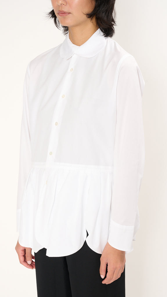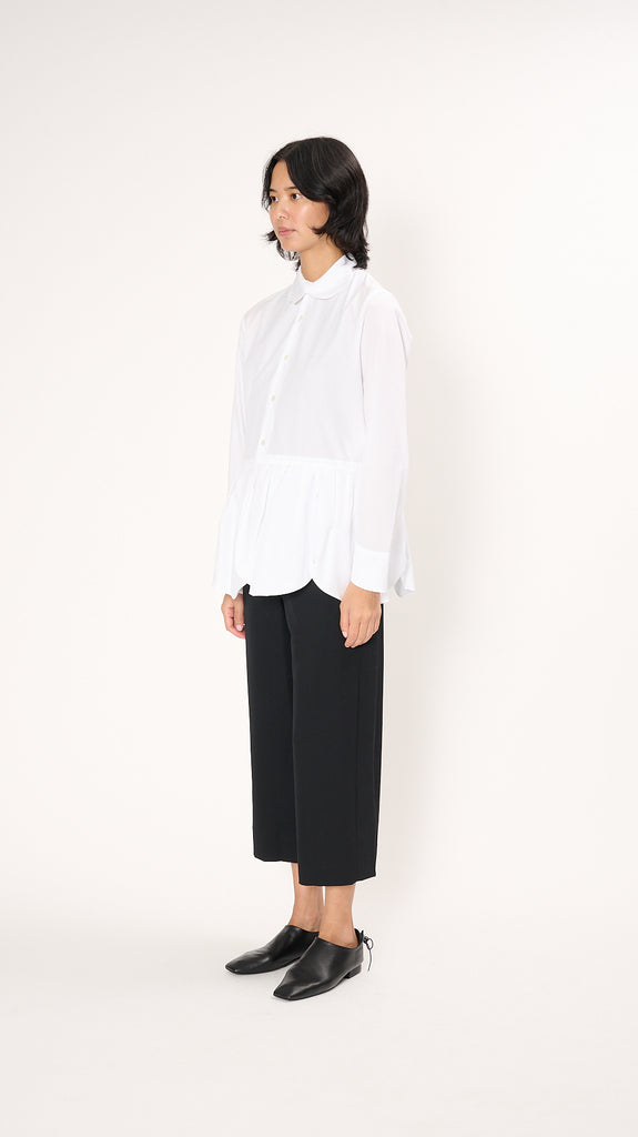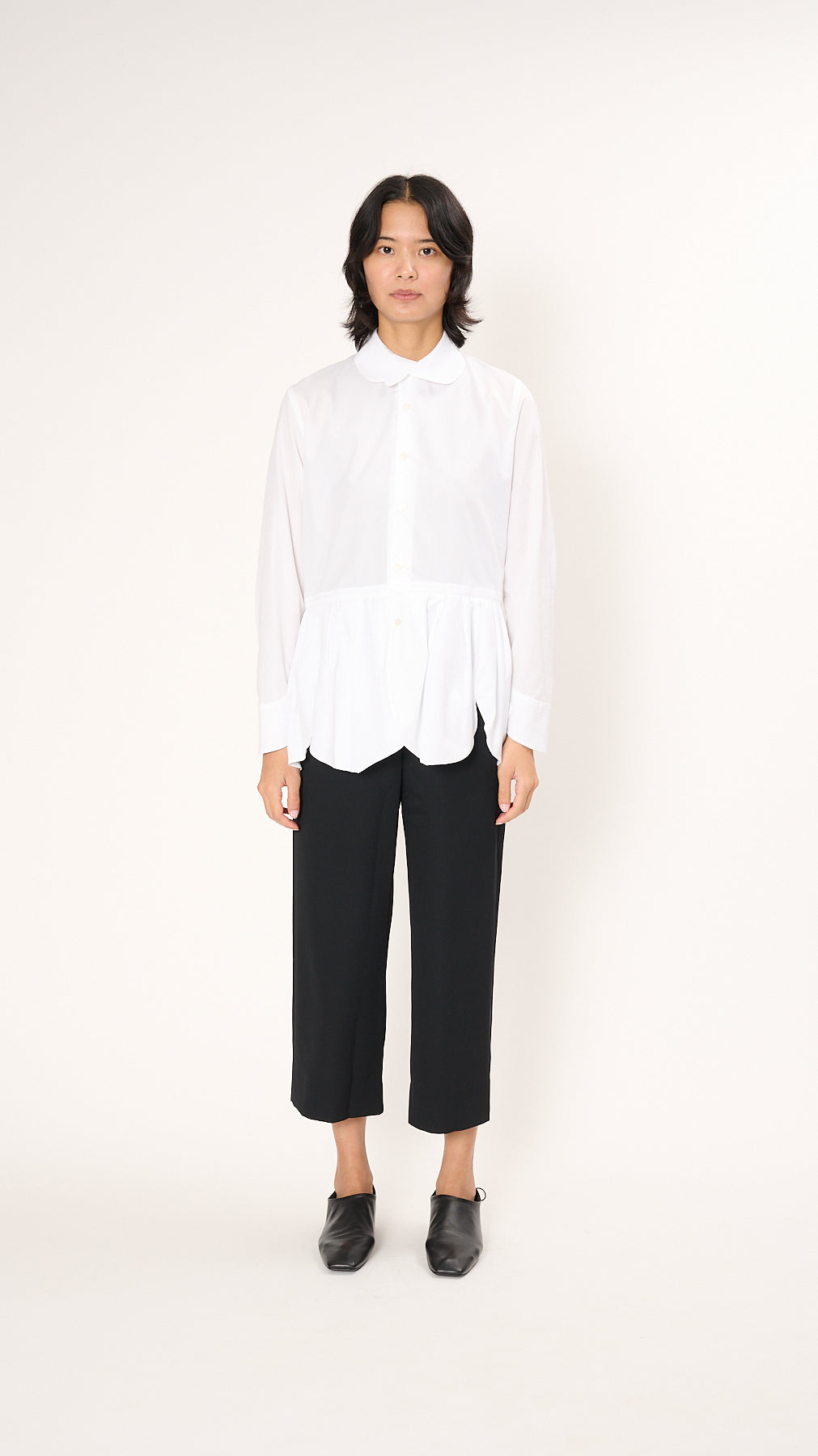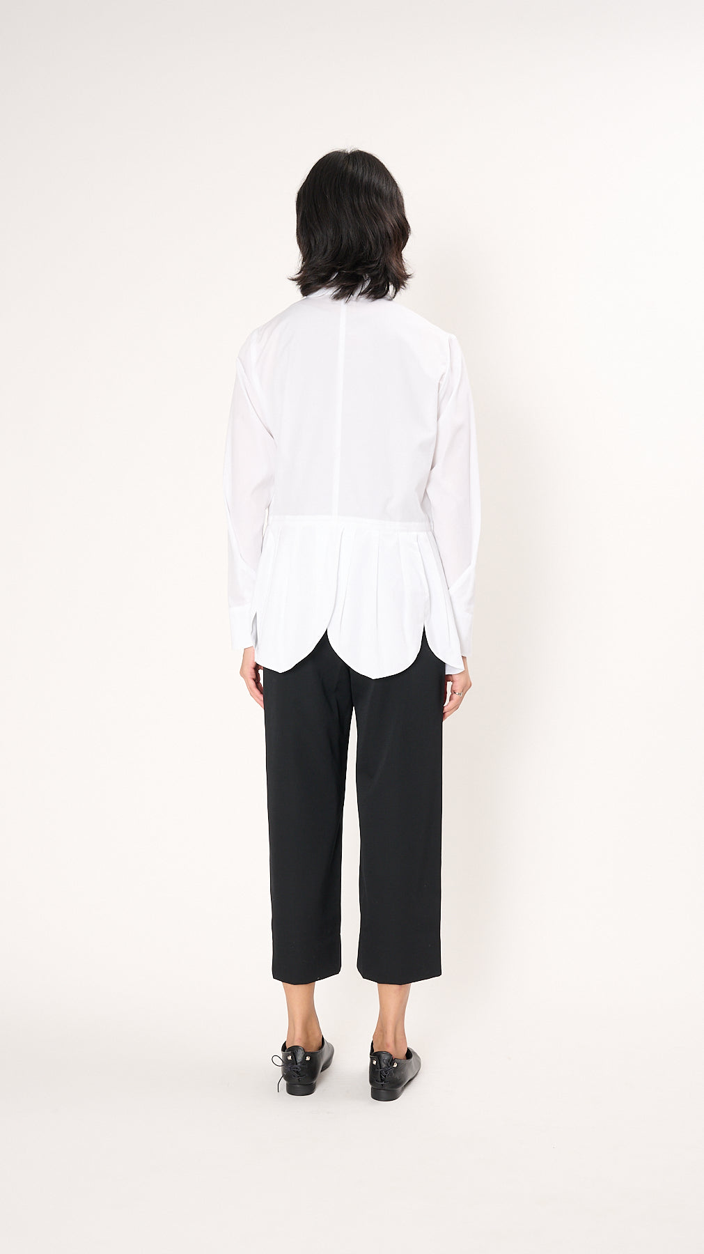 The Petal Blouse has a relaxed silhouette crafted from crisp cotton. It features an asymmetrical petal-like collar, button front, curved sleeve cuffs, and sculptural petal-like peplum hem.