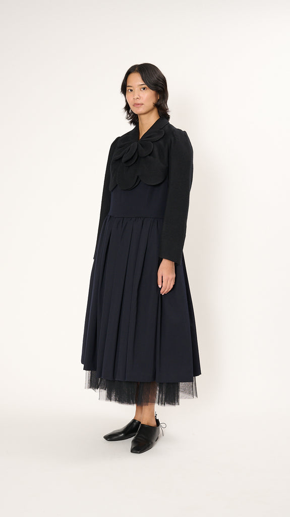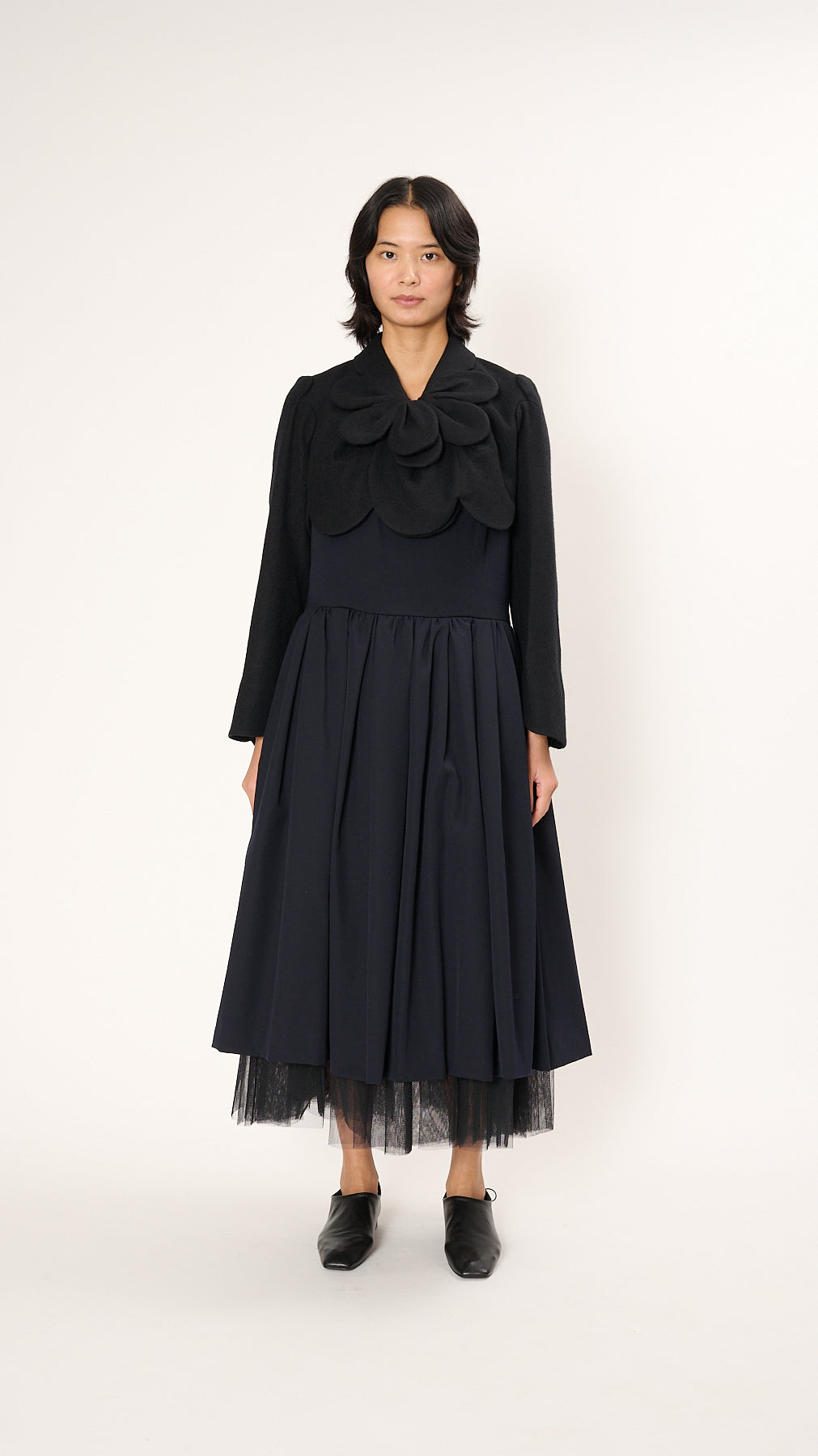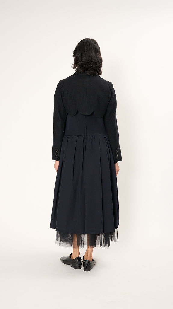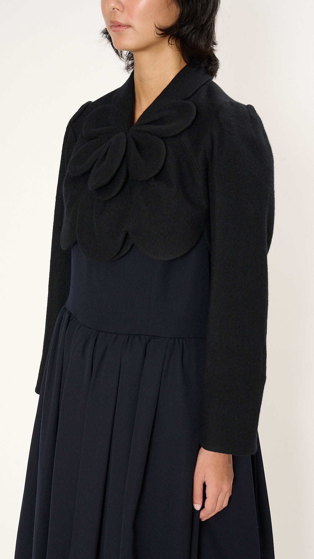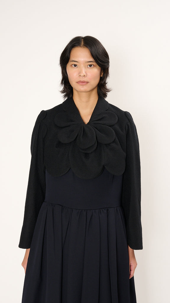 The Petal Jacket has a cropped, bolero silhouette crafted from structured wool. It features a sculptural petal-like lapel, hook eye fastening, button cuff sleeves, scalloped edge hem, and is fully lined.