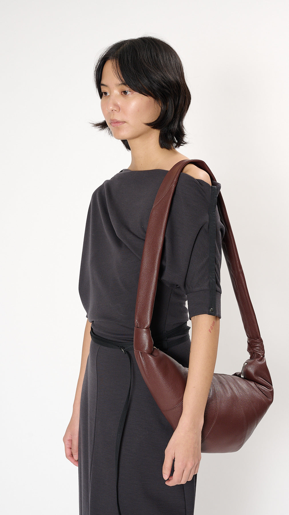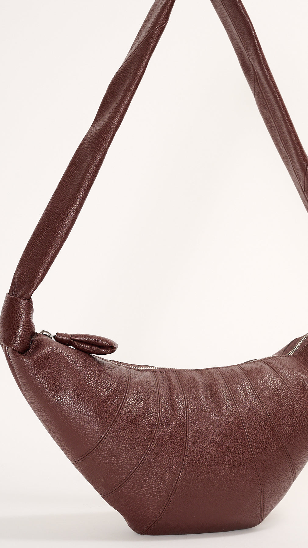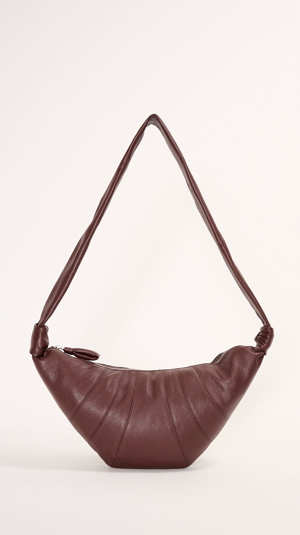 The Medium Croissant Bag is a staple style with Lemaire. It is inspired by croissant pastries, and that look is created by topstitched cutouts. Made of soft-grained leather, it features a metal zipper, side knots, and a side zip pocket. It can be worn slung across the body or on the shoulder. It measures approximately 47cm L x 23cm W x 7cm D with a 96cm strap.