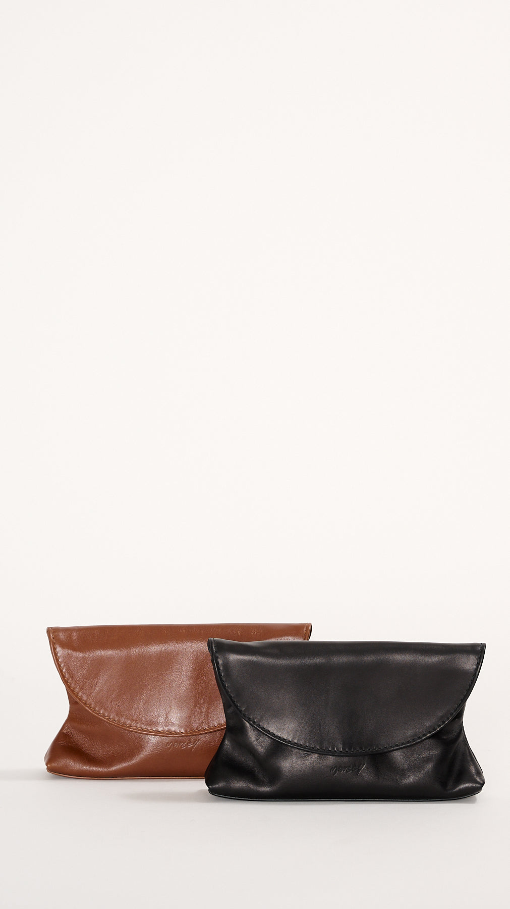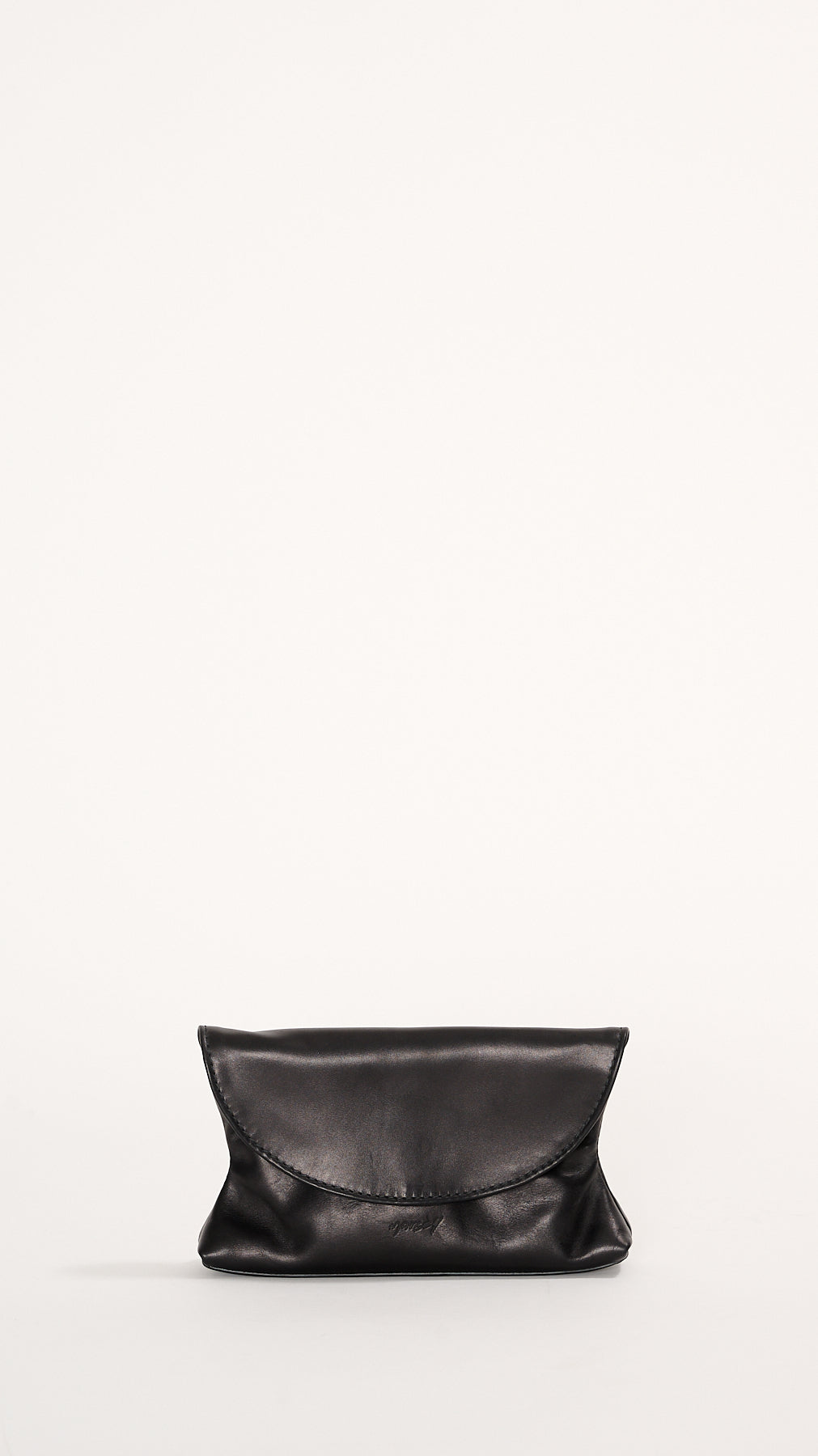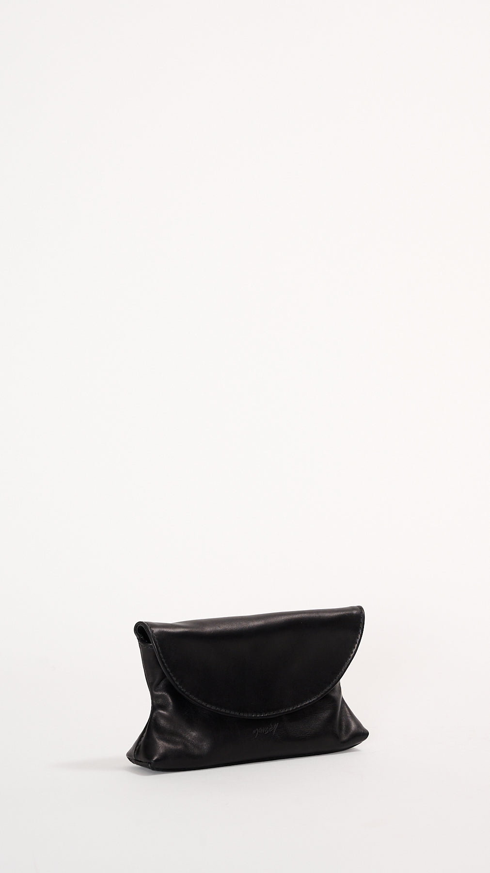 The Dromi 1 Pouch has a compact silhouette crafted from smooth black leather. The smallest in the Dromi family, it features a single compartment with a hidden zipper, fold-over top, and magnetic closure. Measures 16.5cm W x 9.5cm H x 3.5cm D.