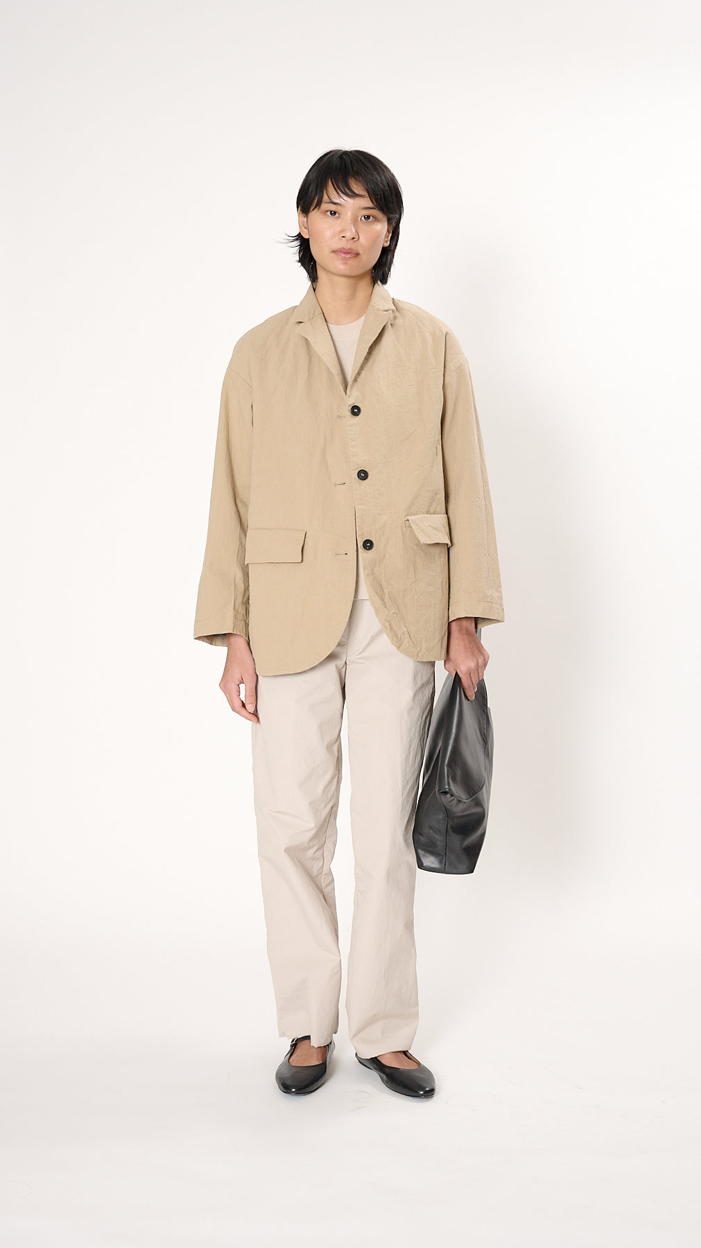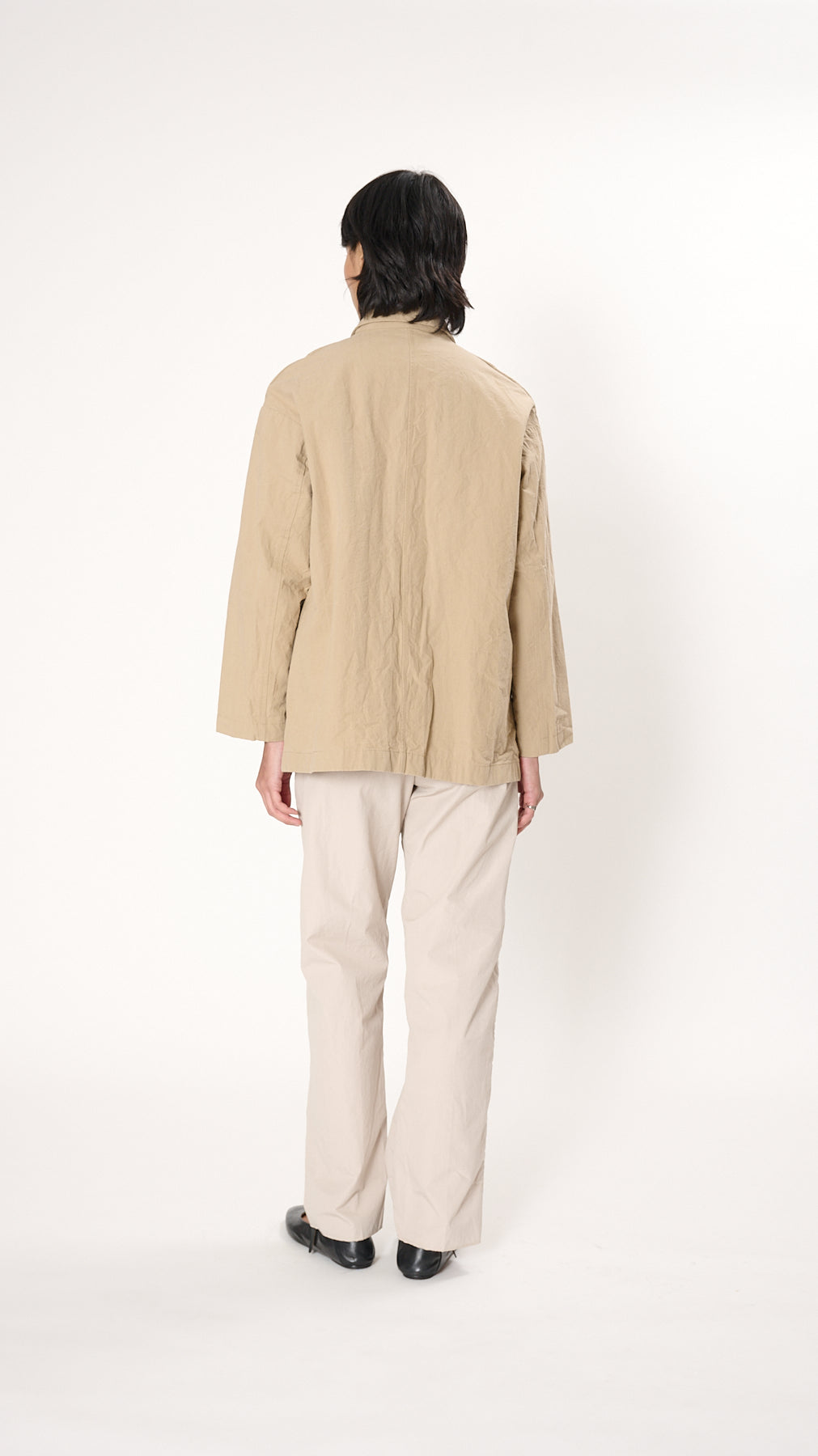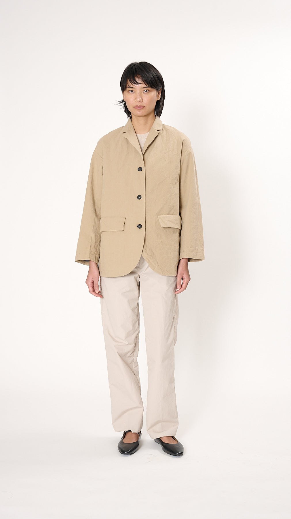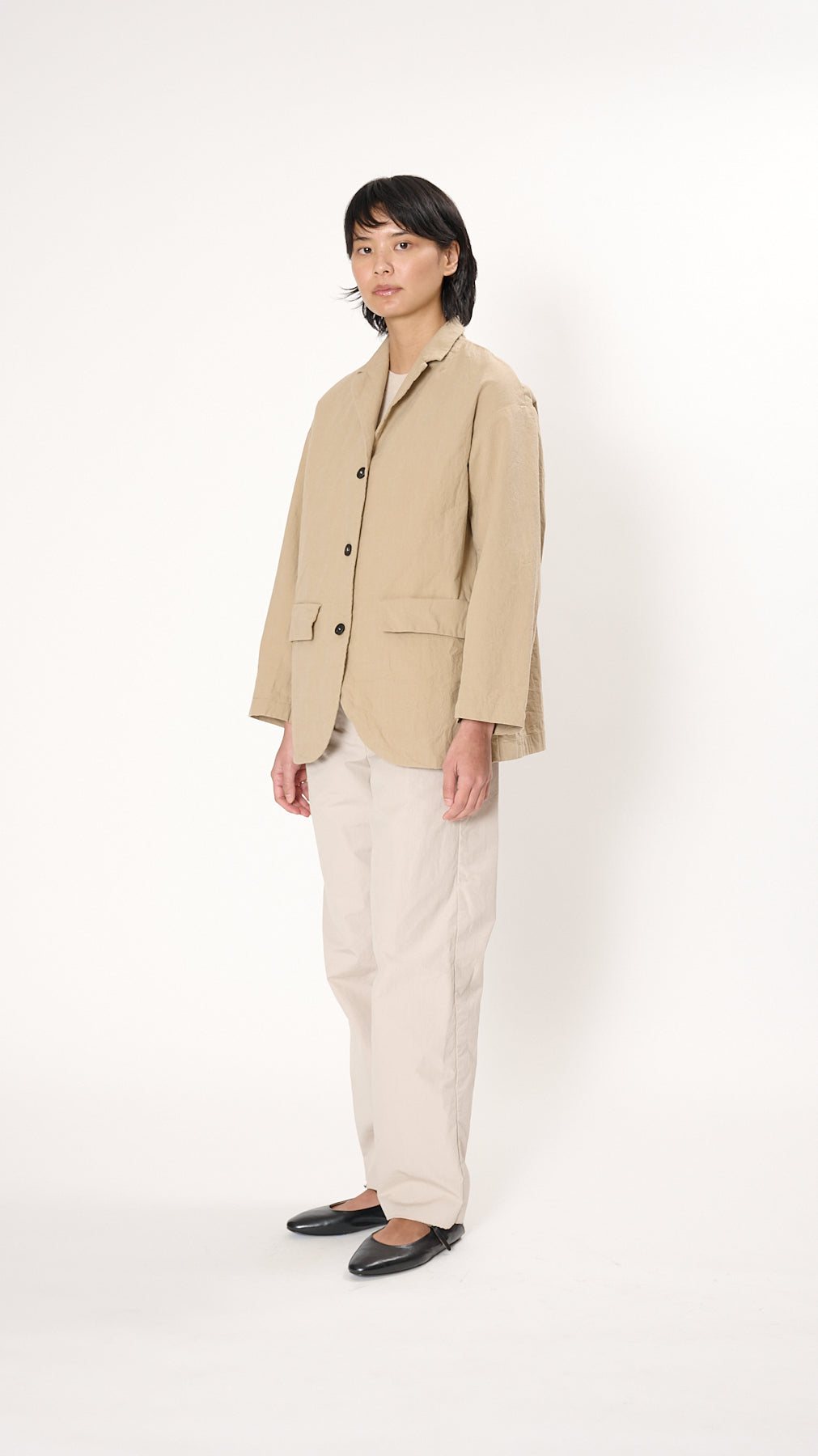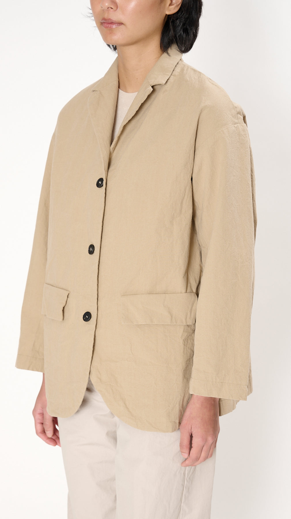 The Bella Jacket has a relaxed silhouette made of crinkled cotton. It features a notched collar, drop shoulders, a 3-button front, and two flap pockets at the front hip.