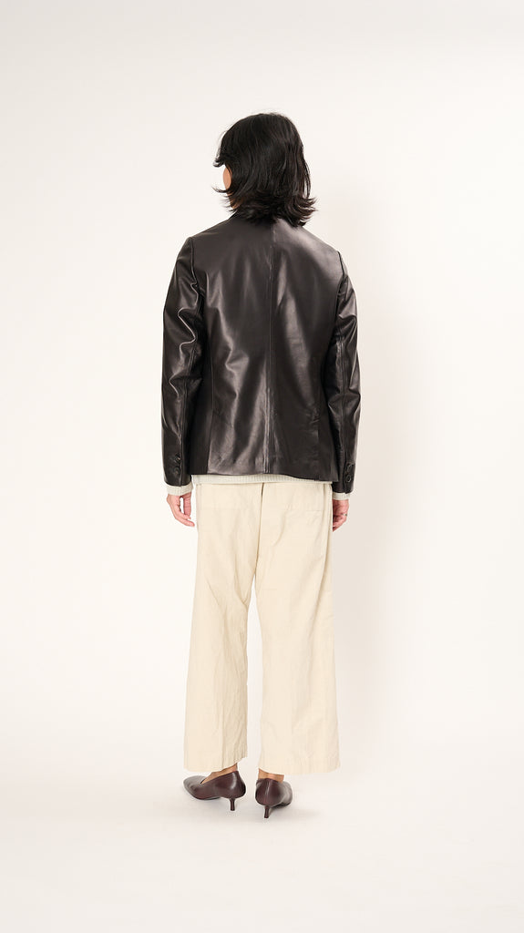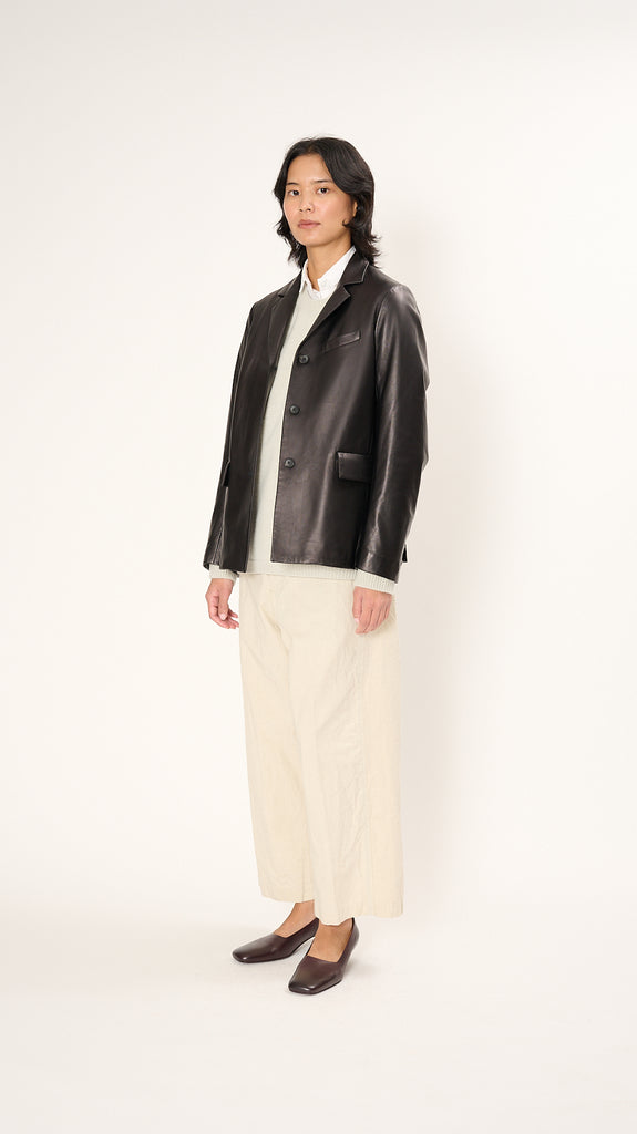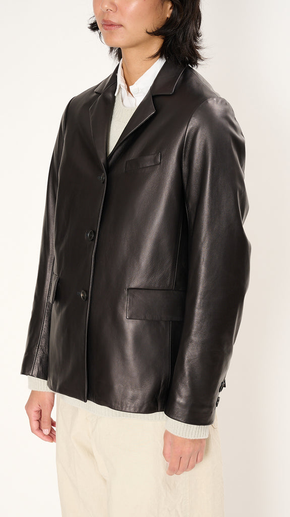 The Leather Giulia Jacket has a straight silhouette made of soft nappa leather and is lined with Bergfabel's signature cotton. It features a notch collar, a 3-button front, and flap front pockets.