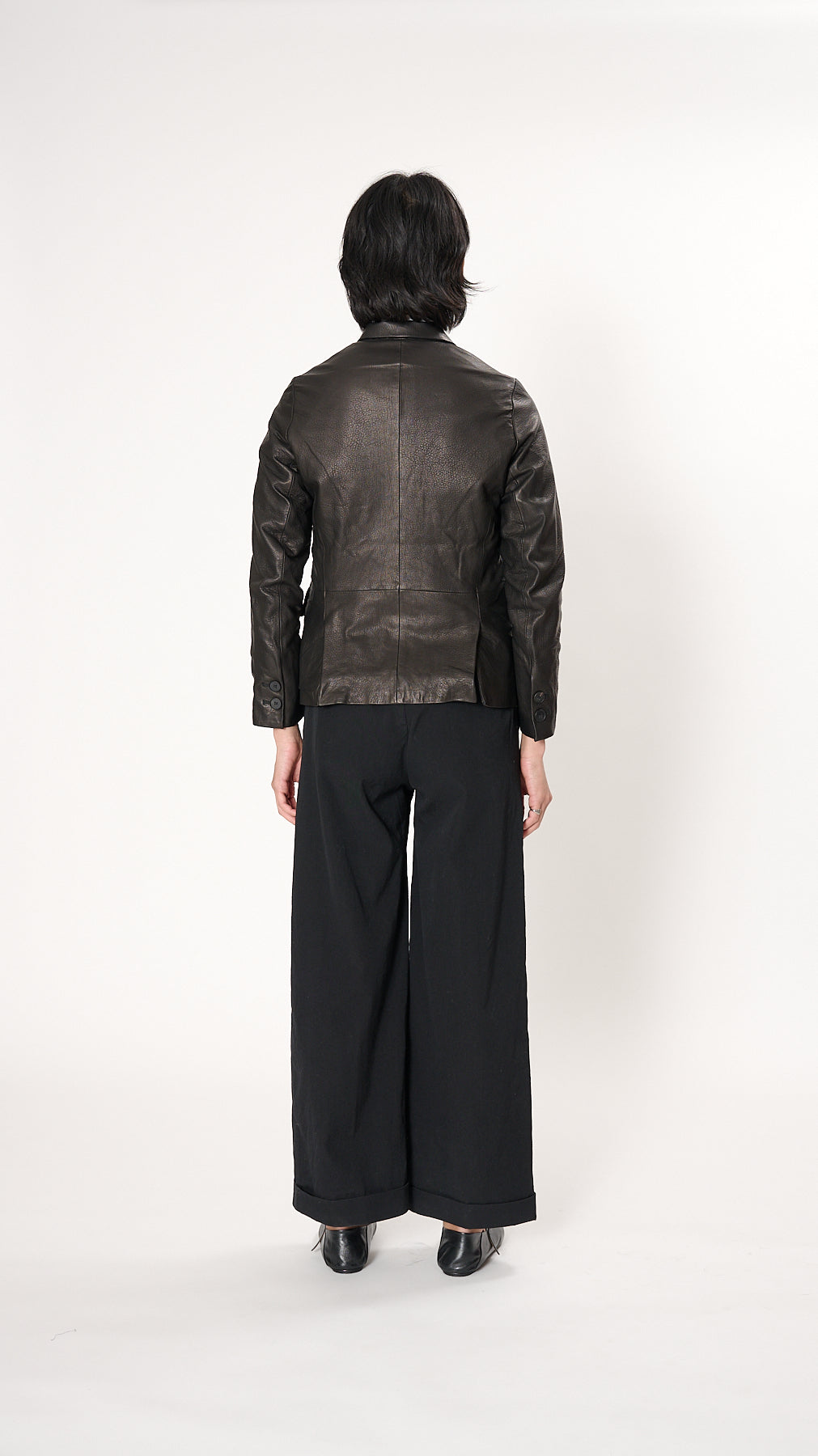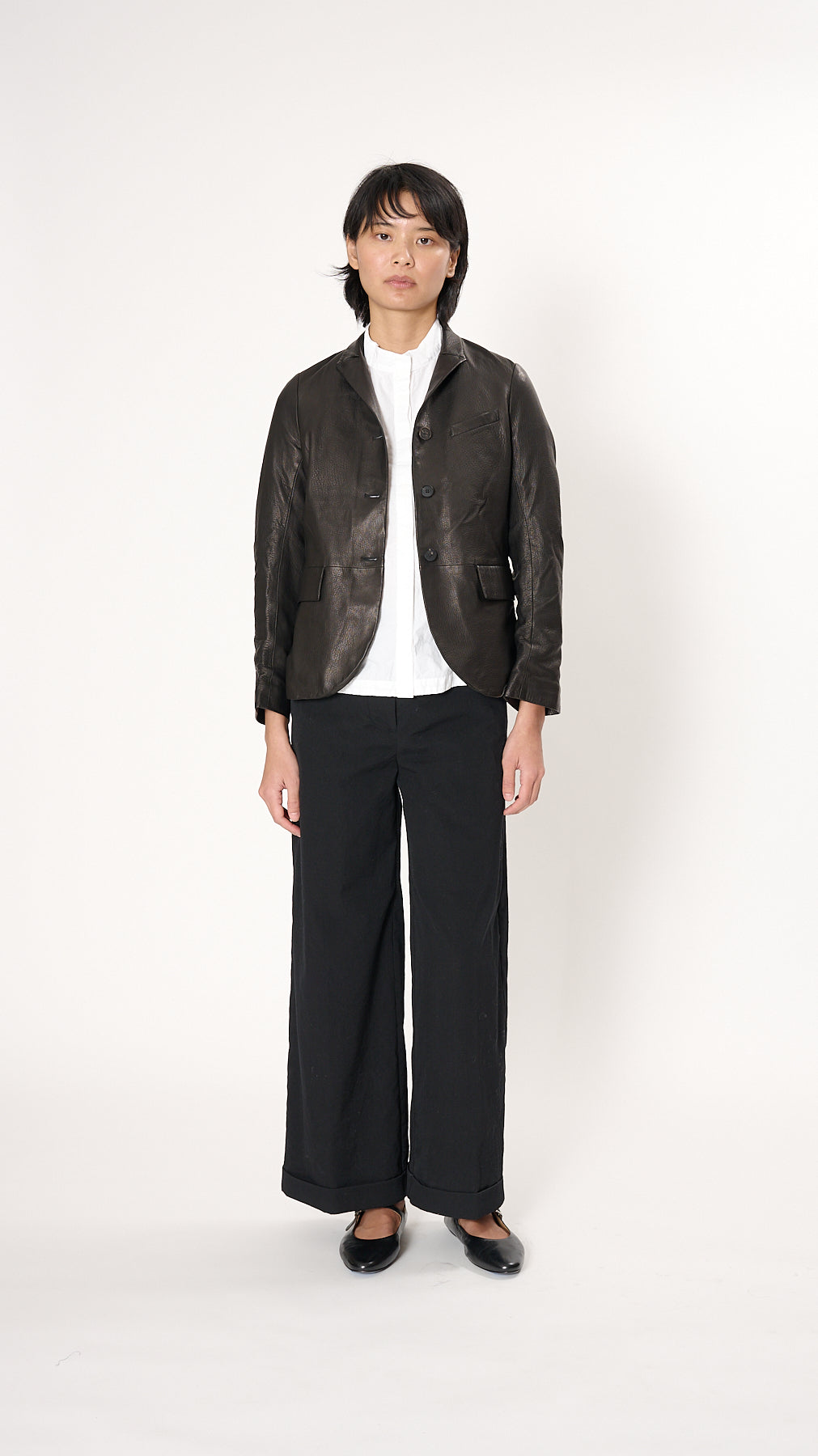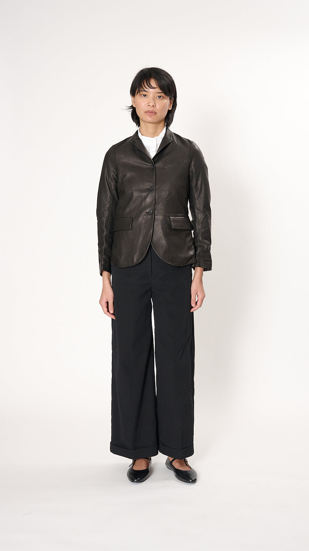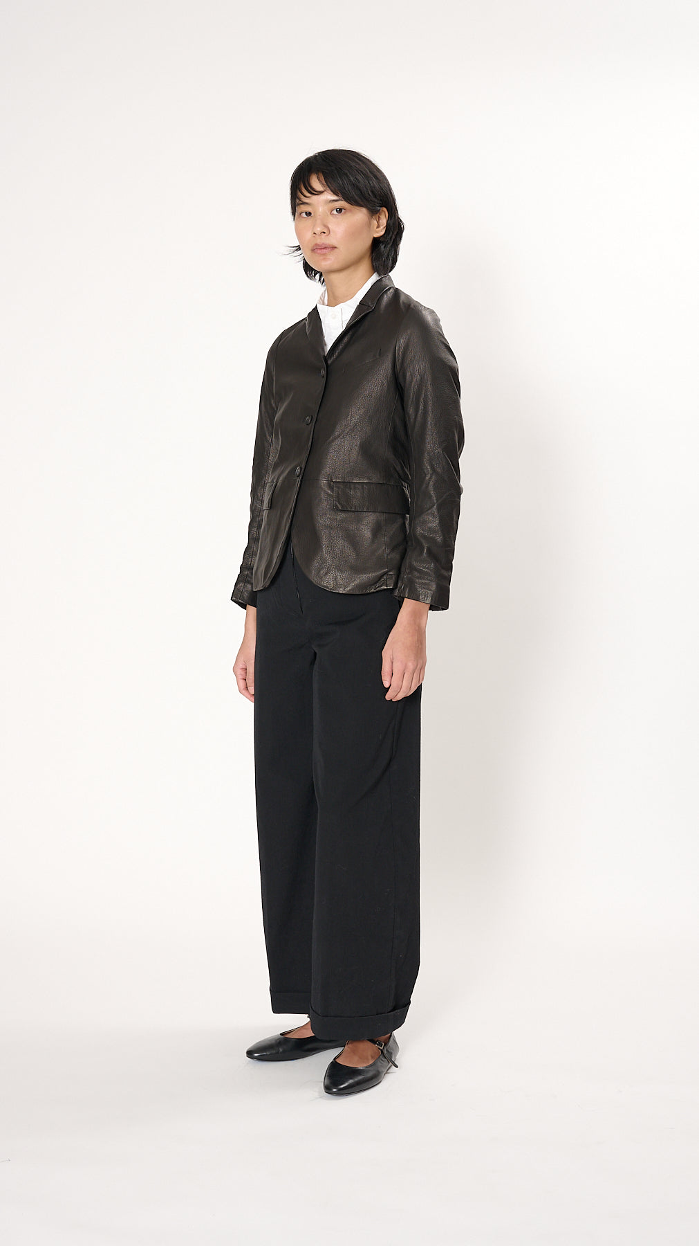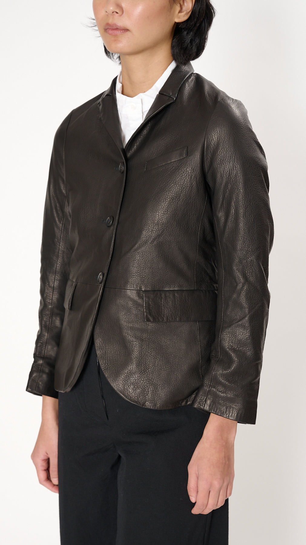 The Leather Bella Jacket has a hip-length, relaxed silhouette made of soft leather. It features a small notched collar, bracelet-length sleeves, a 3-button front, a single welt chest pocket, and two flap pockets at the front hip.
