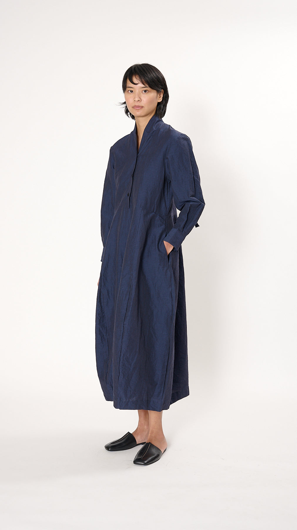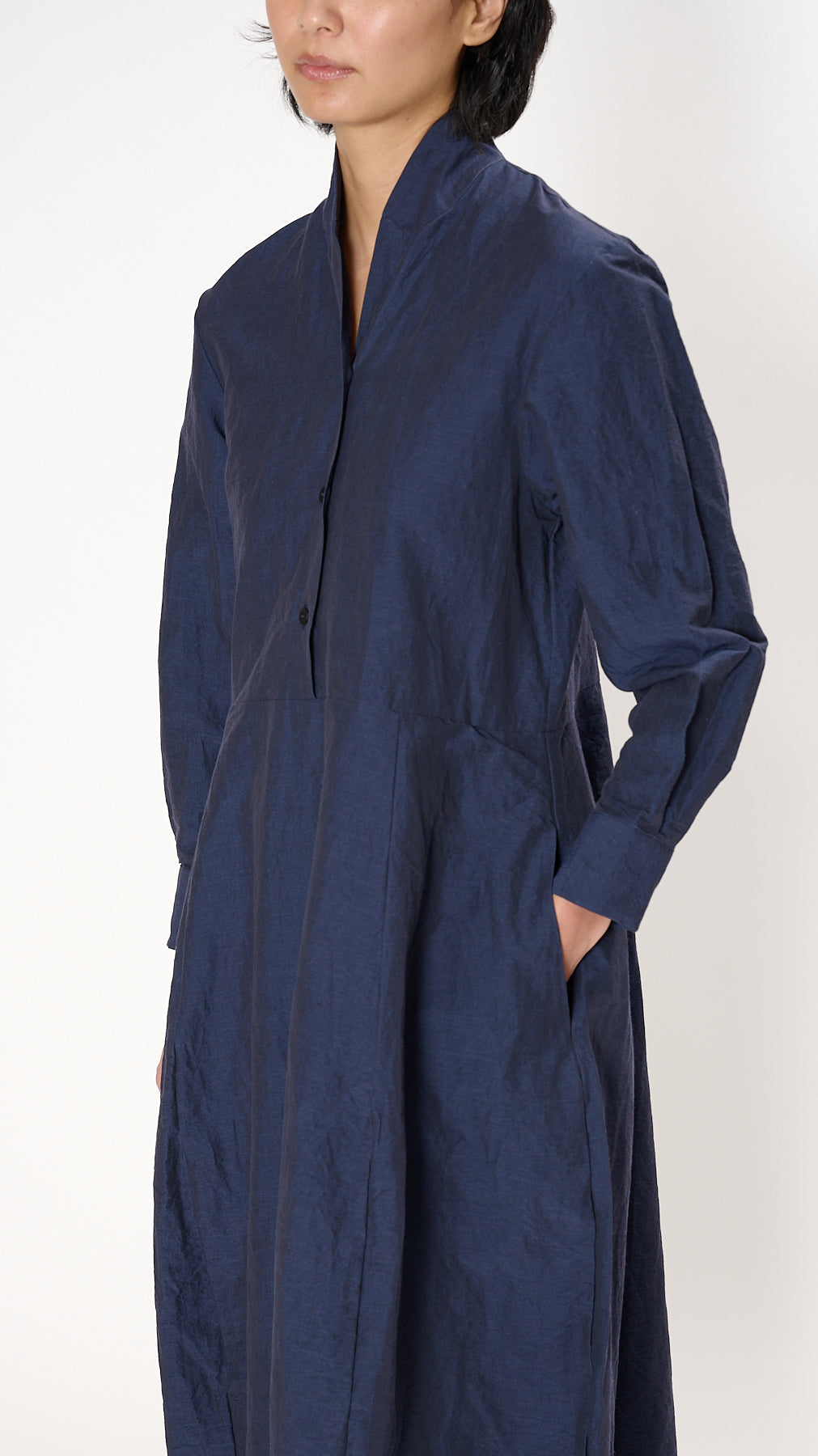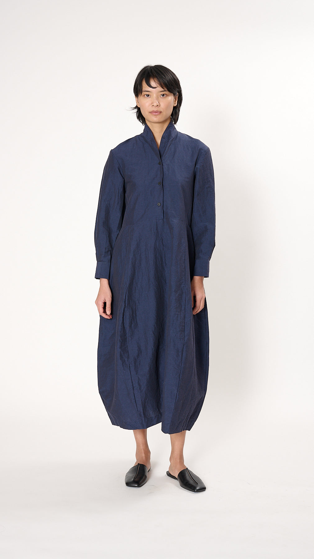 The Letty Dress has a mid-length, relaxed silhouette made of lightweight cotton. It features long sleeves, a stand collar, a three-button bodice, a lightly ballooned skirt, and concealed side seam pockets.