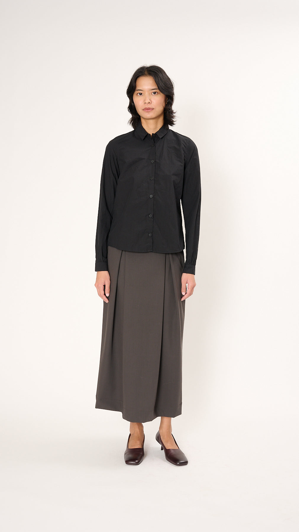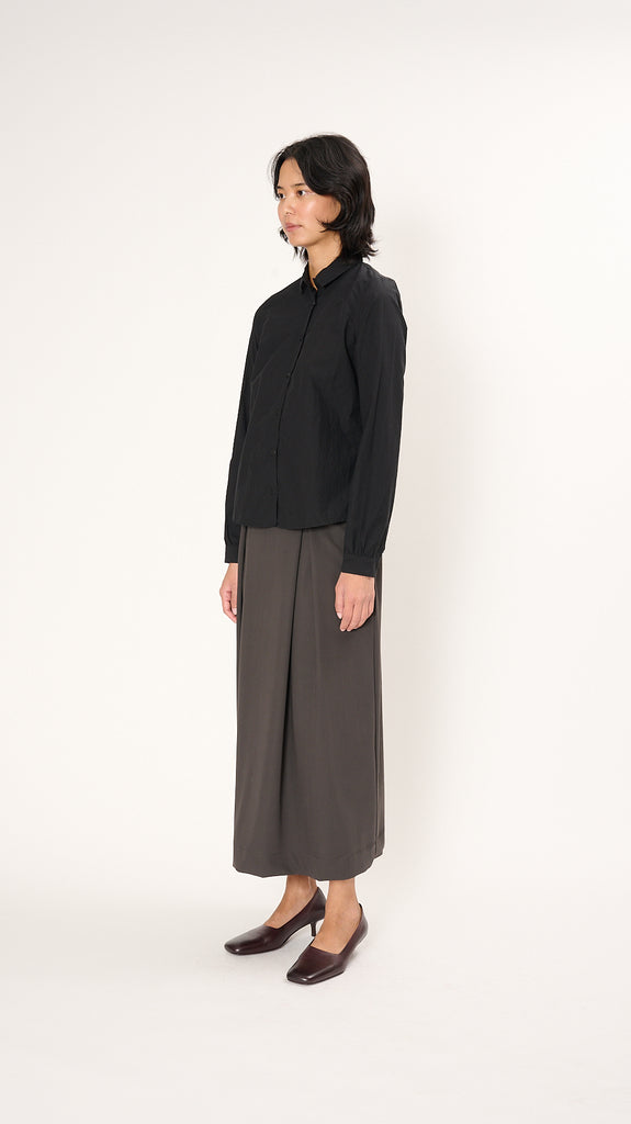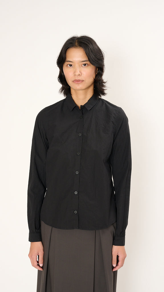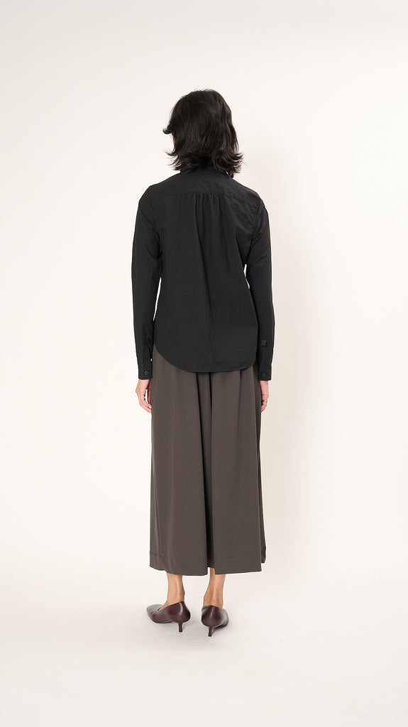 The Tyrol Shirt has a slim silhouette made of washed cotton. It features a classic collar, shell-button front, ruched sleeve cuffs, a lightly pleated back yoke, and a curved shirt hem.