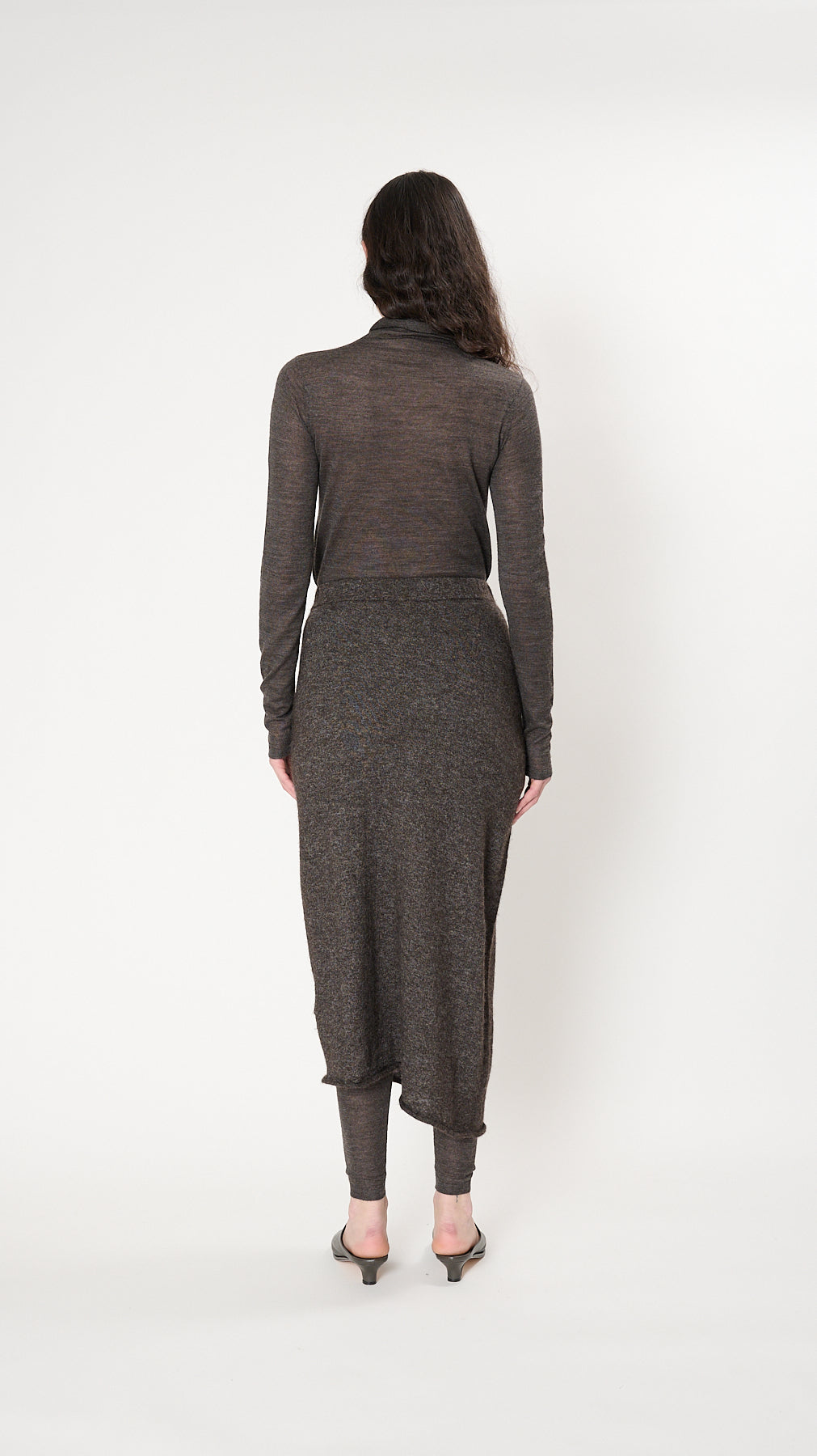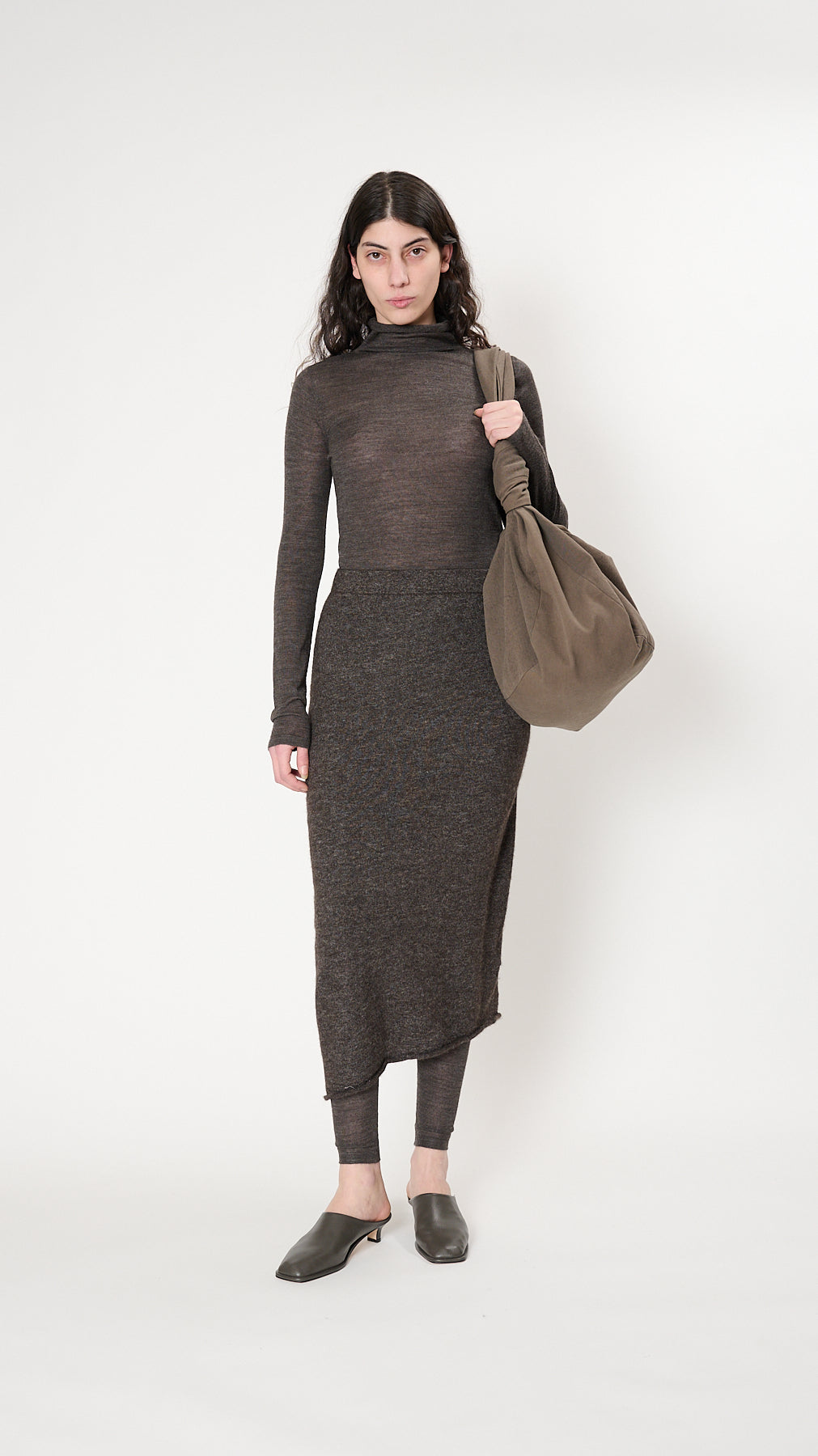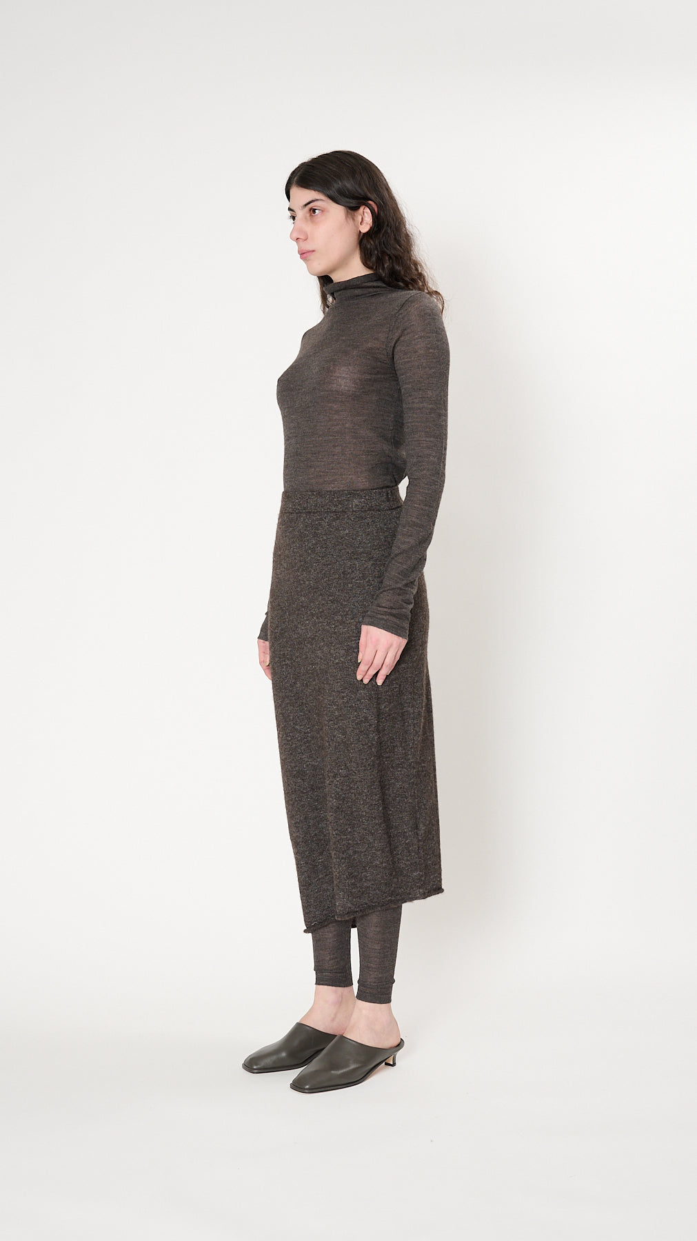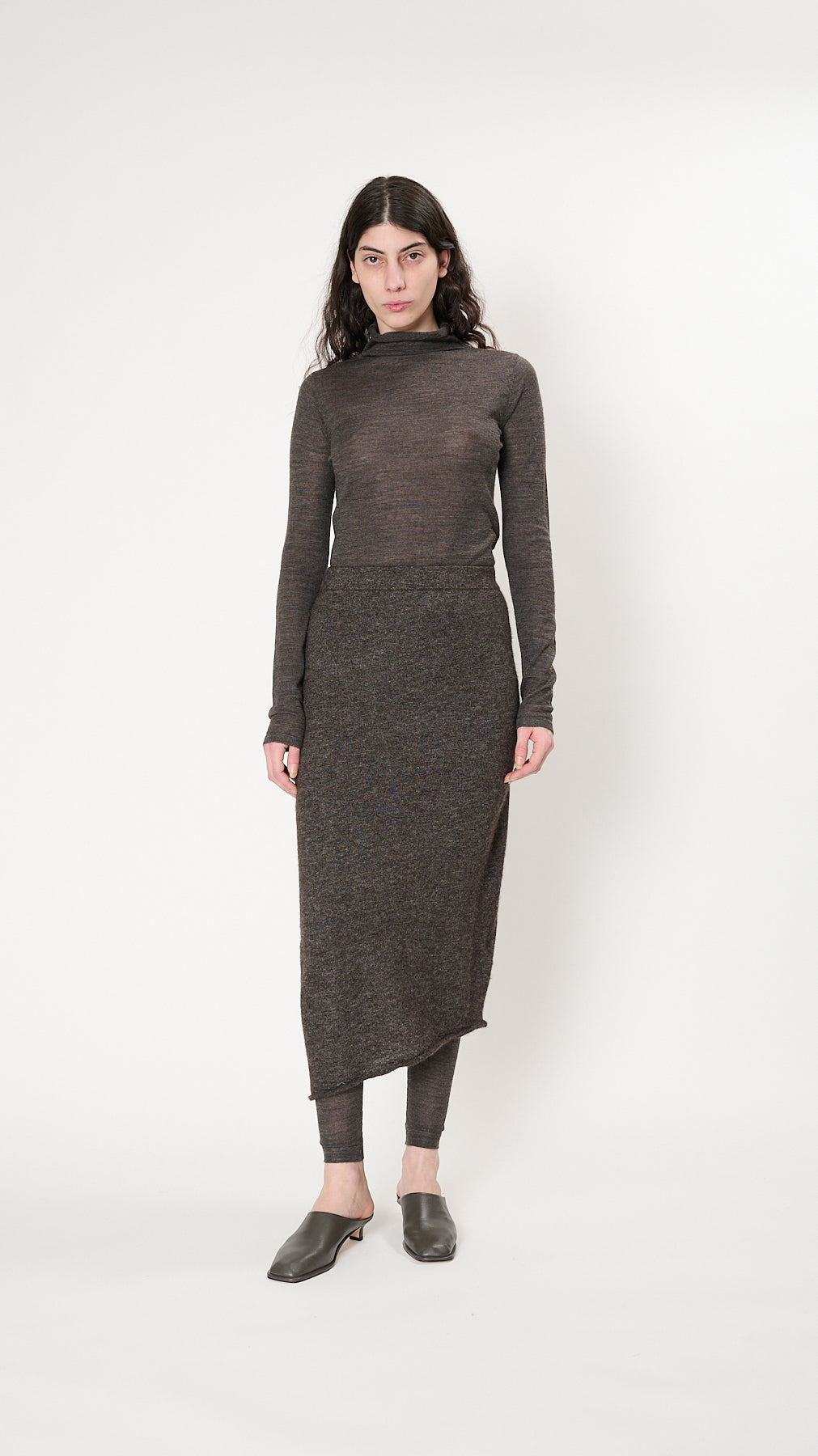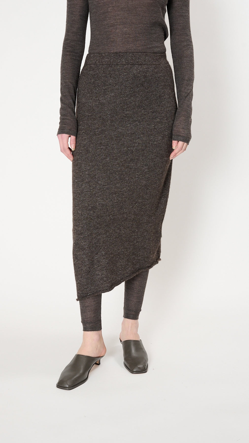 The Askew Skirt has an ankle-length, slim silhouette knit of fine, fuzzy alpaca-blend. It features a circular seamless construction, elasticized waistband, asymmetric hem, and rolled edges.