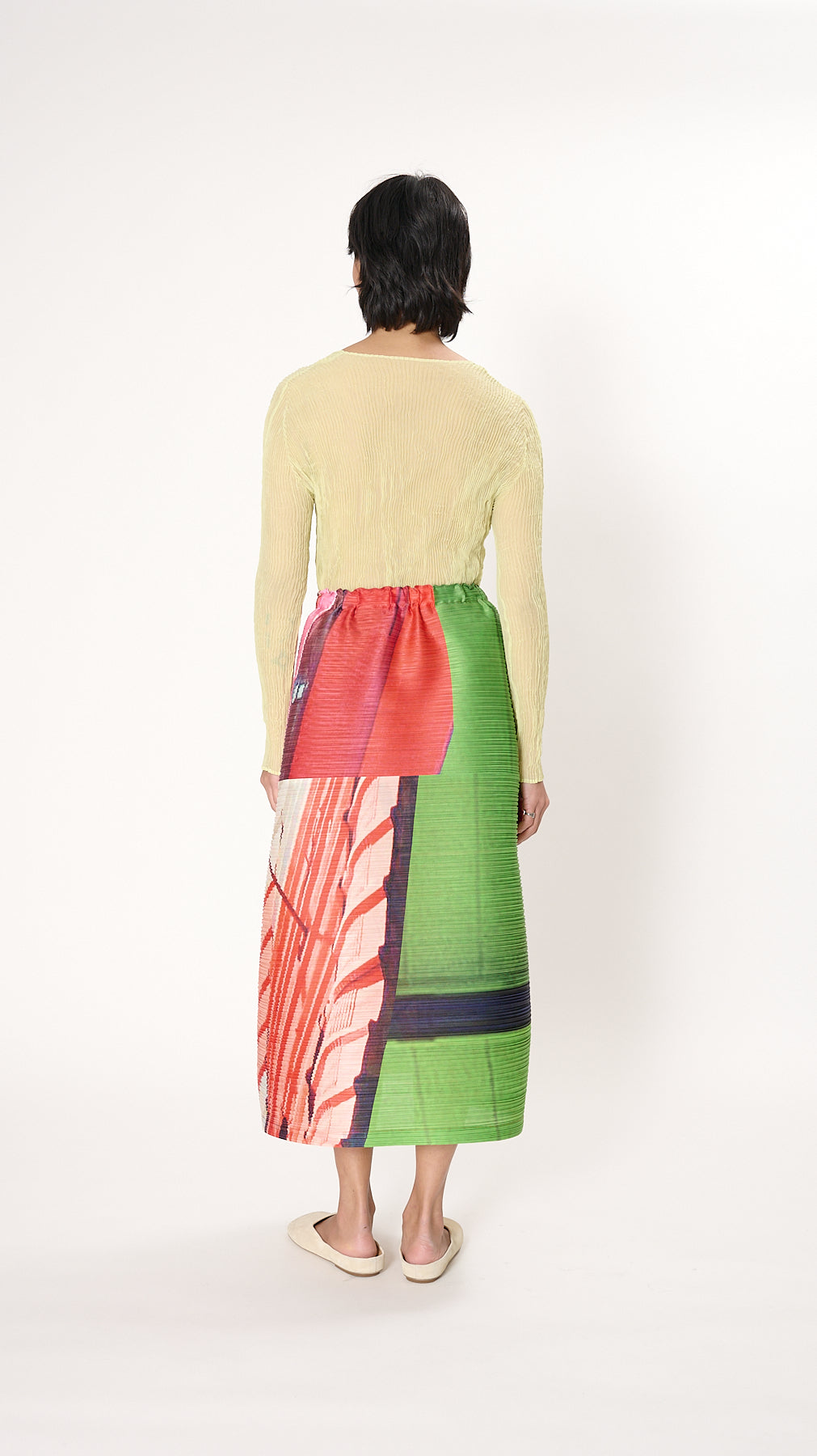 The City Collage Skirt has an voluminous silhouette made of Issey Miyake's classic pleating and is finished with an elastic waistband. The City Collage series features patterns made by combining photos into a collage to depict changing city scapes.