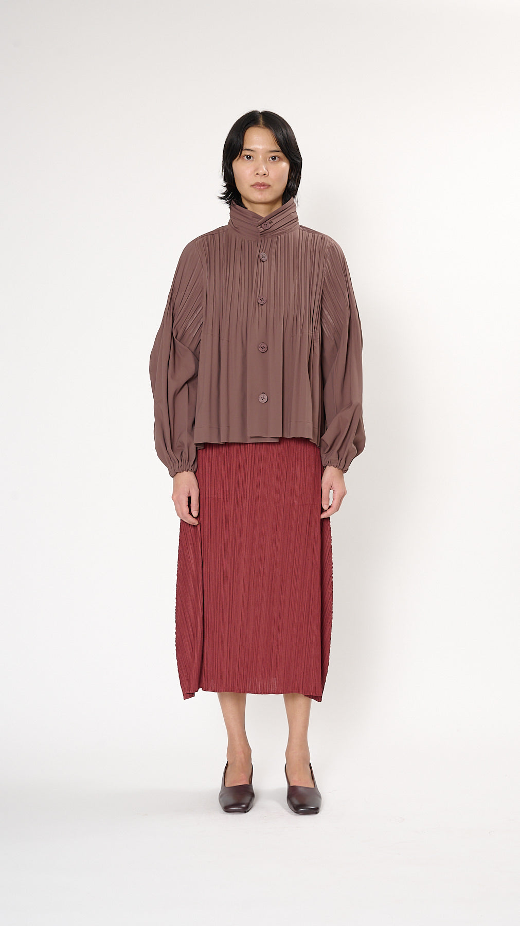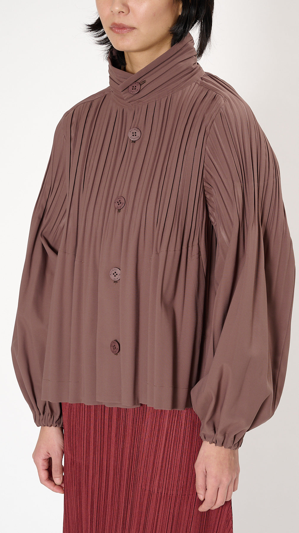The Smooth Coat has a hip-length, a-line silhouette with collarless styling, a button front, balloon sleeves, and side pockets. The Smooth Coat series features pleated outerwear made of thick, windproof fabric.
