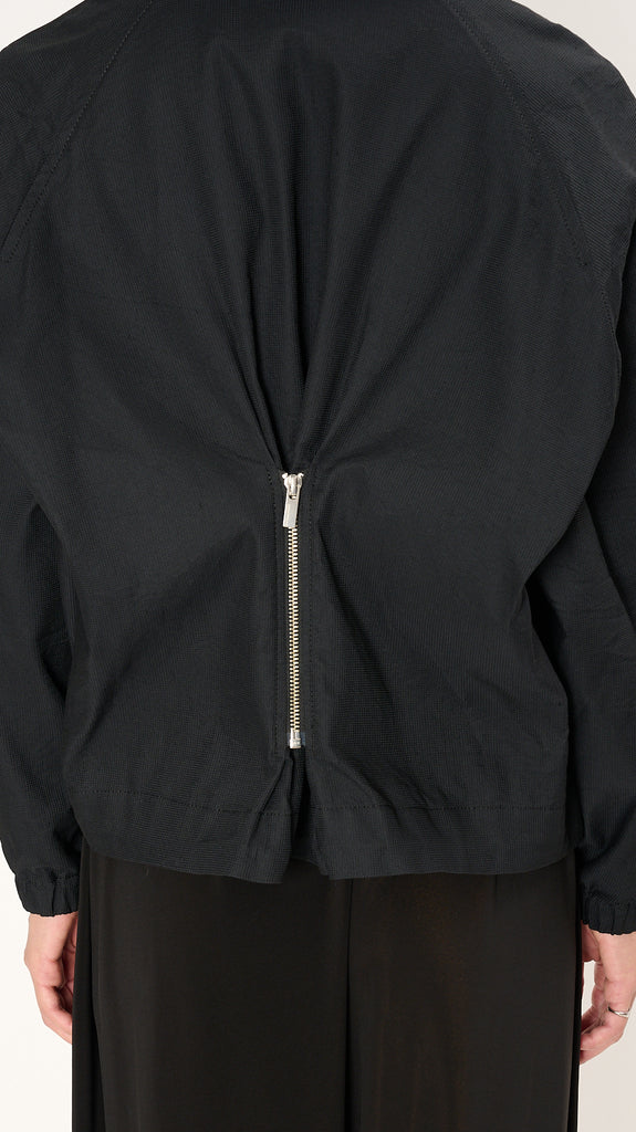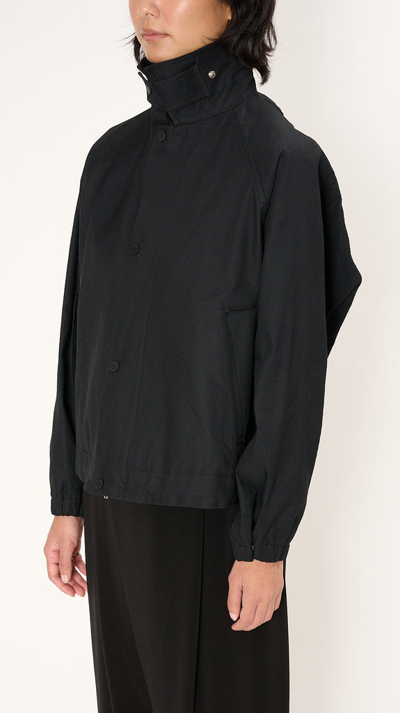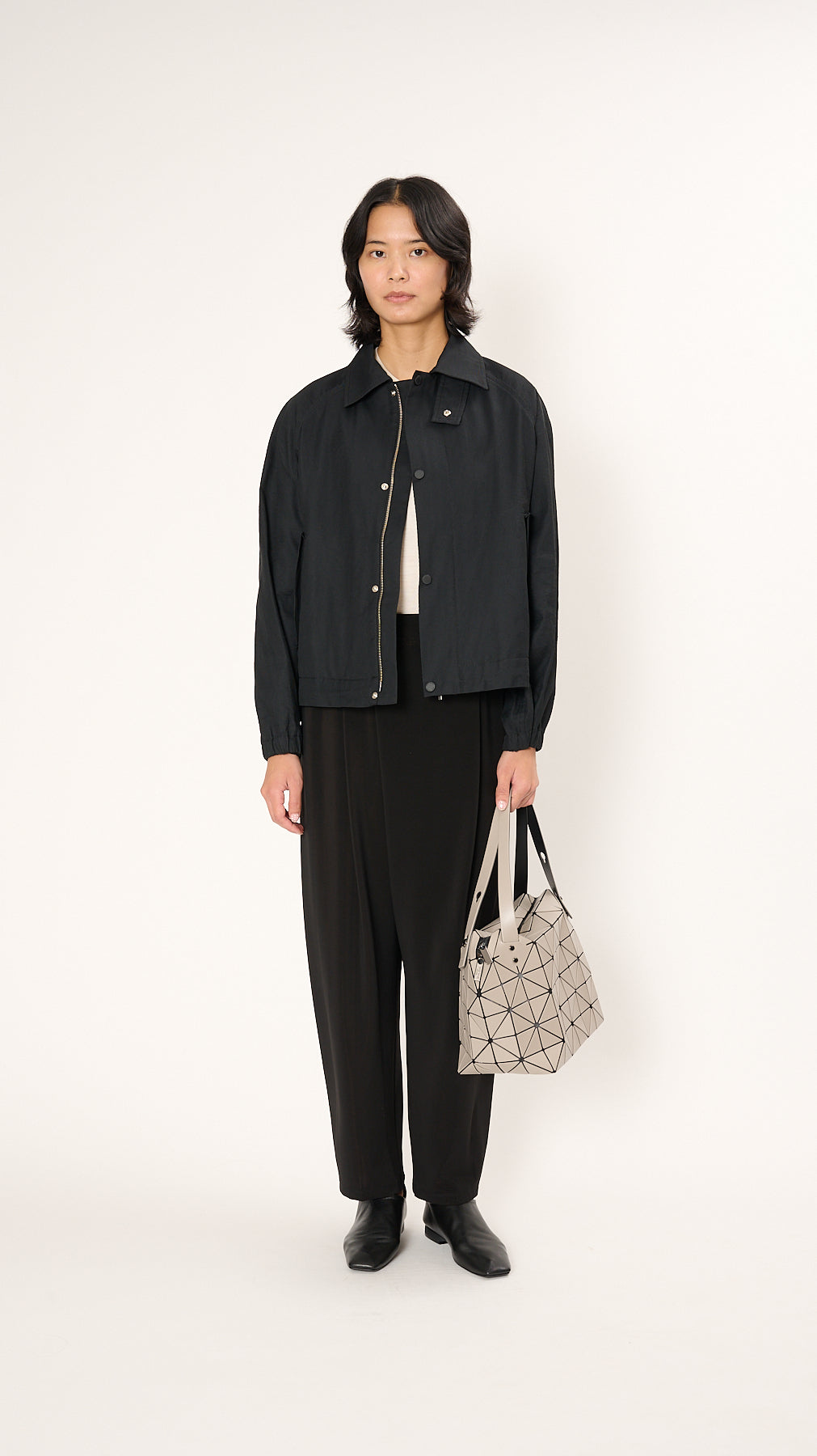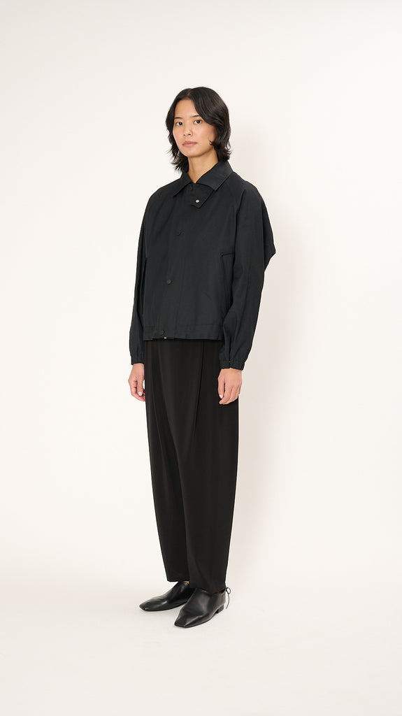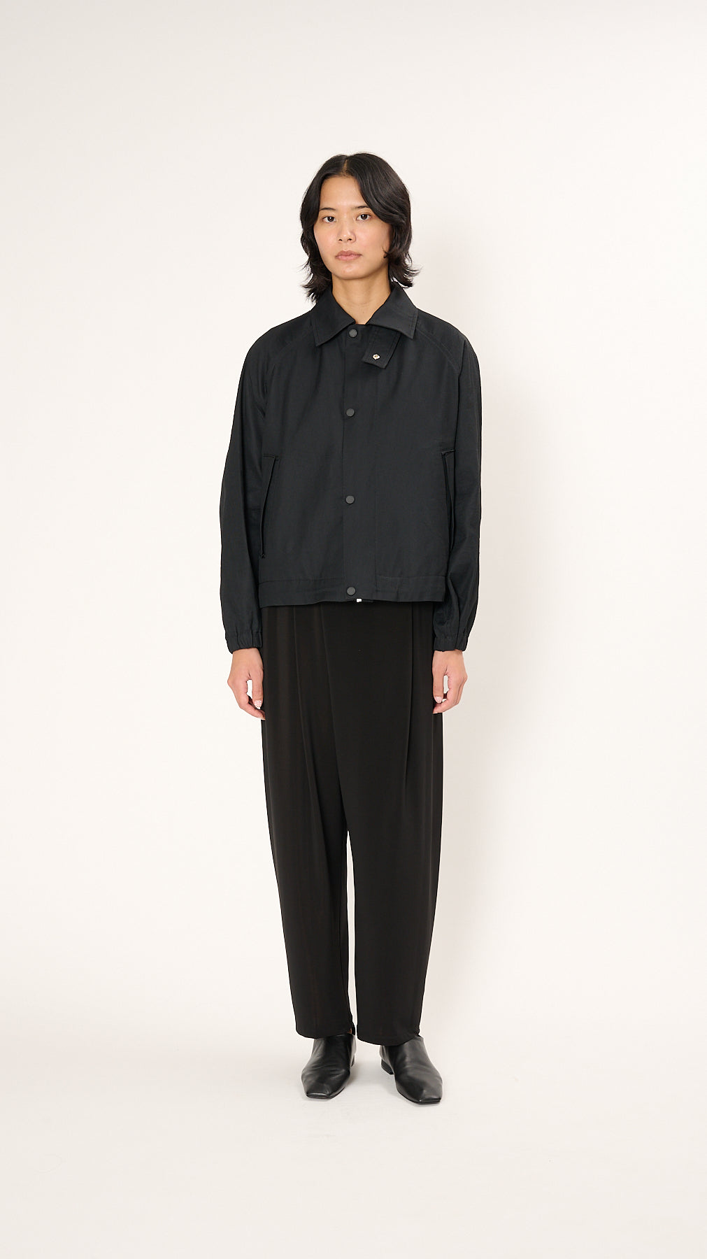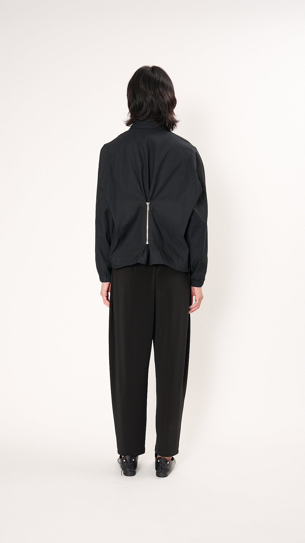 The Peekaboo Blouson has a relaxed silhouette crafted from a polyester and linen blend. It features a classic collar that can be buttoned into a stand collar, raglan sleeves, side pockets, a button front, and a back zip detail that transforms the silhouette.