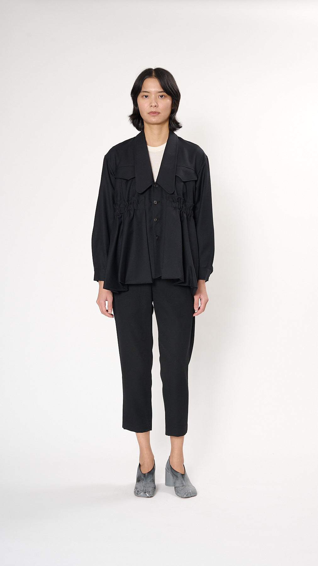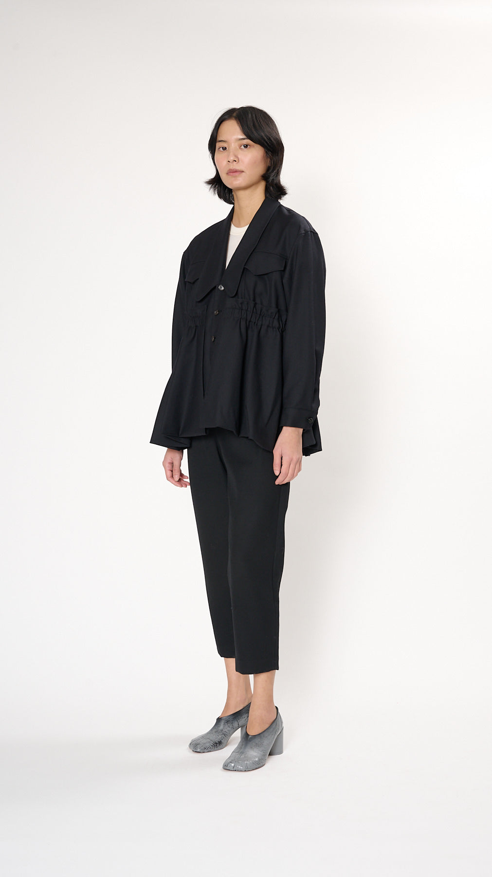 The Gathered Jacket has a relaxed silhouette crafted from a fine wool. It features a deep V lapel, button front, front flap chest pocket, and gathering around the waist.