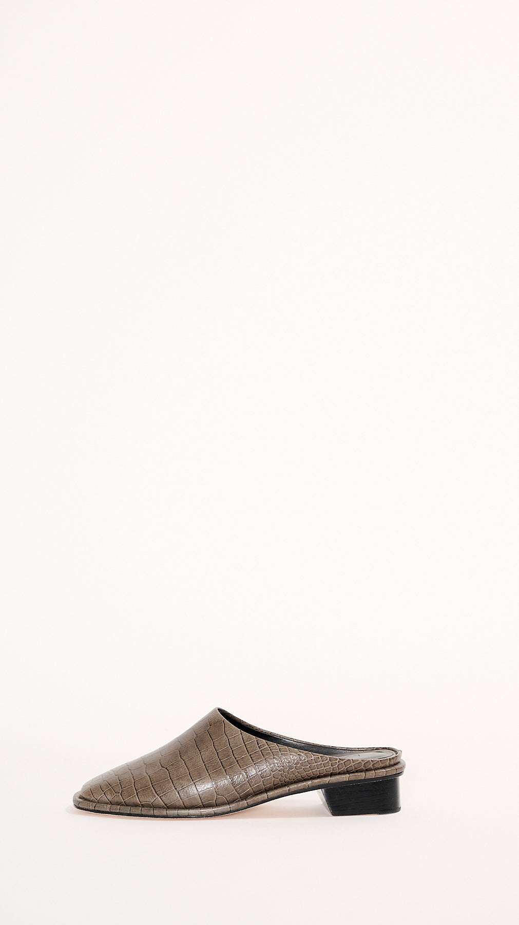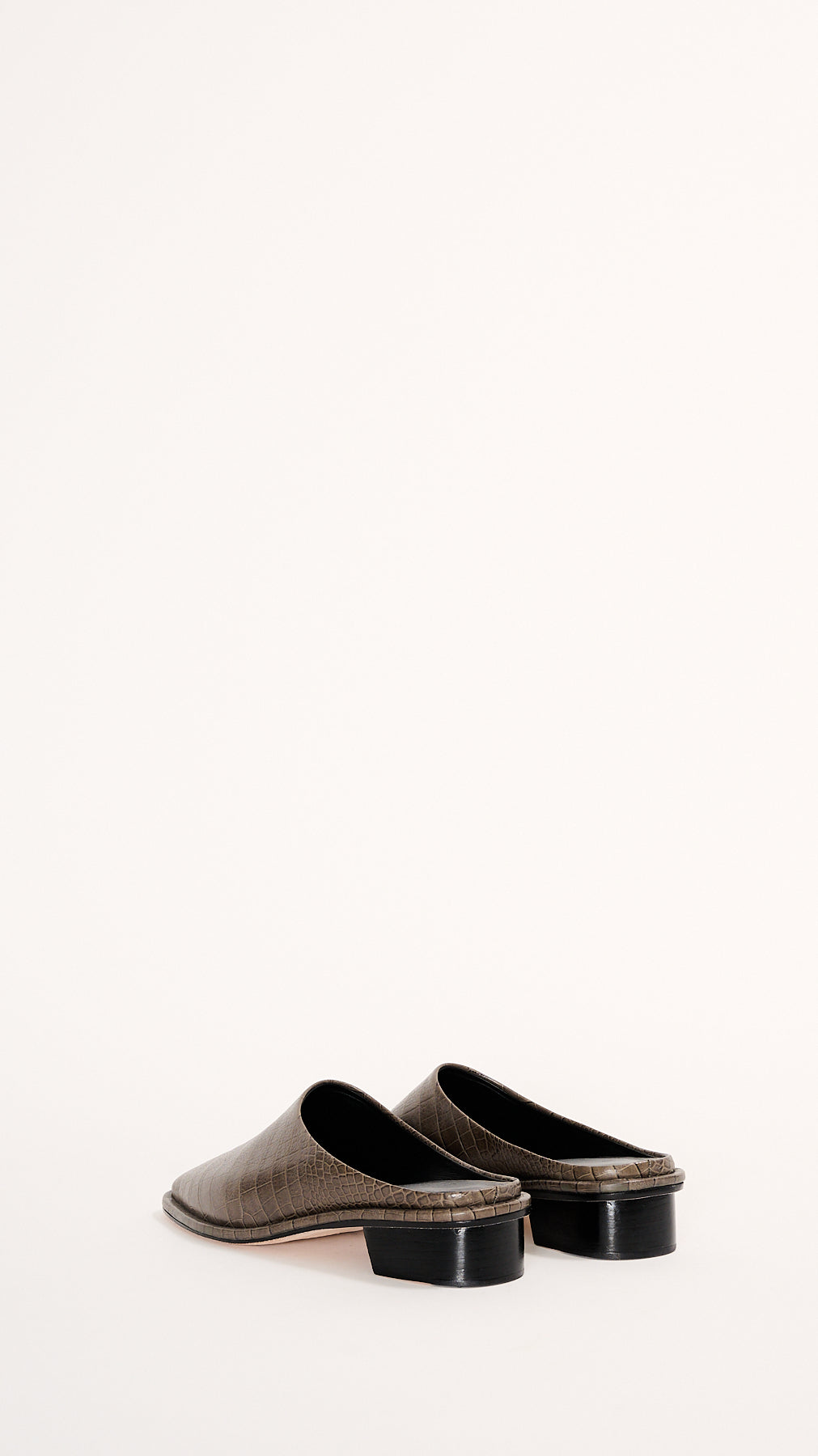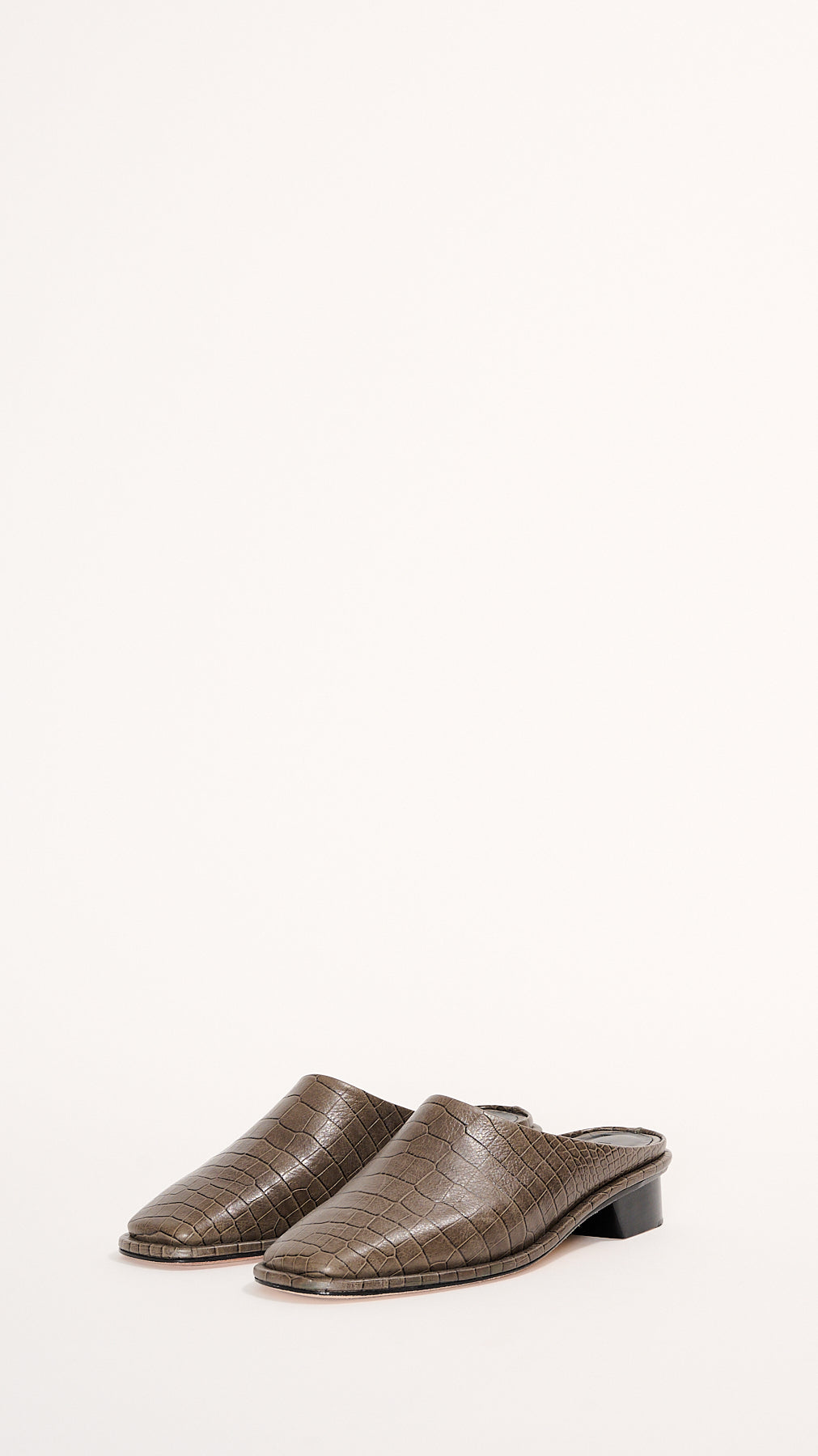 The Embossed Square Mule is an embossed leather shoe with a closed square toe and a handmade wooden heel. They feature a stitched sole and are made by hand.