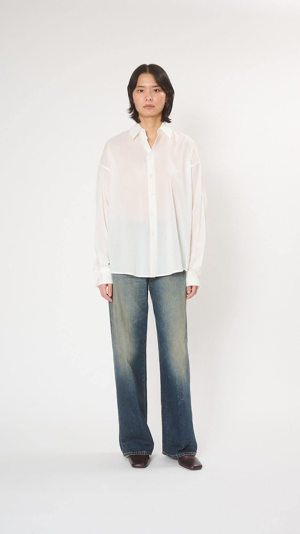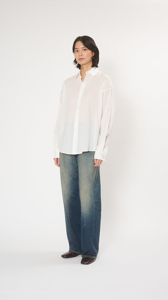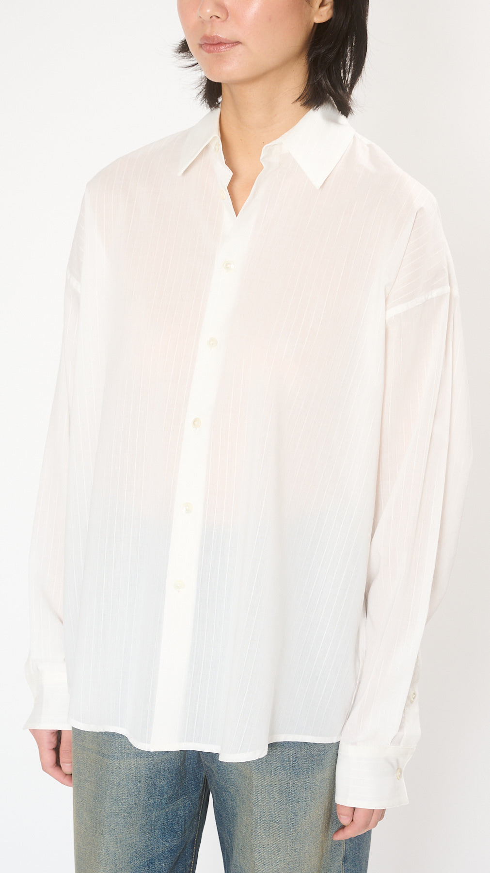 The Ribbon Stripe Uniform Shirt has a straight silhouette made of a Japanese cotton-cupro blend fabric. It features a classic spread collar, button front, button cuffs, and rounded bottom hem.