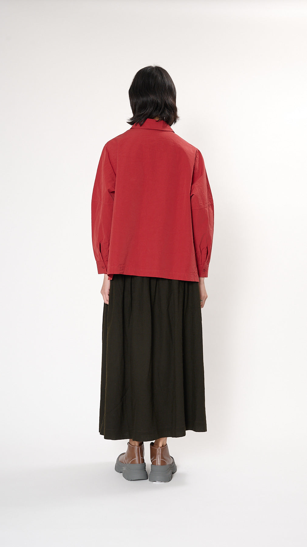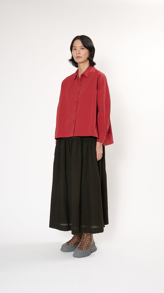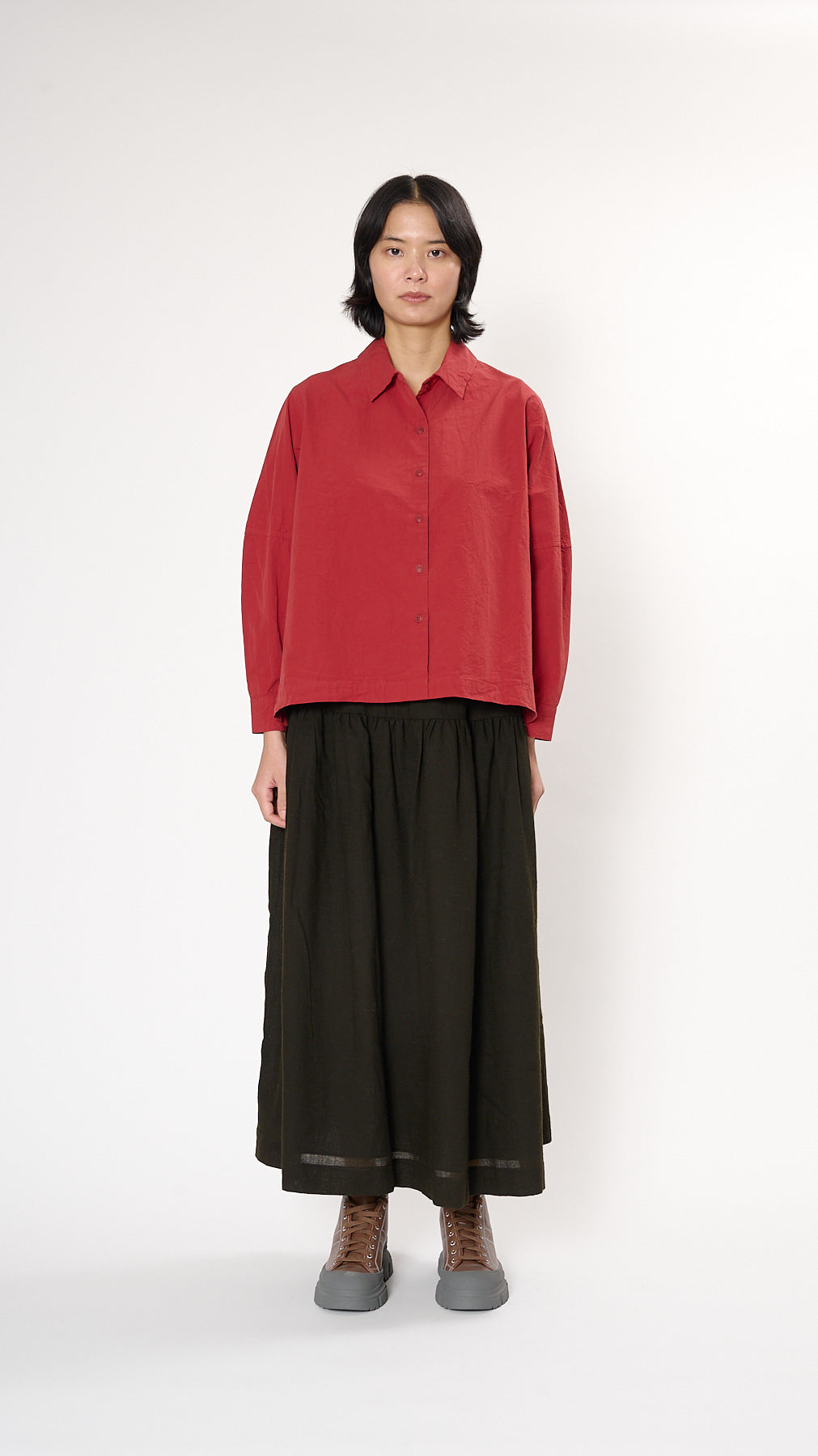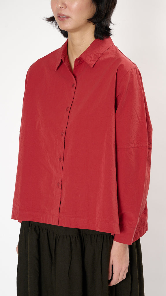 The Elena Shirt has a straight silhouette made of crisp, washed cotton. It features a classic collar, side slits with a longer back hem, and a back button placket. Finished with corozo buttons, buttoned cuffs, and subtle ruffle detailing.