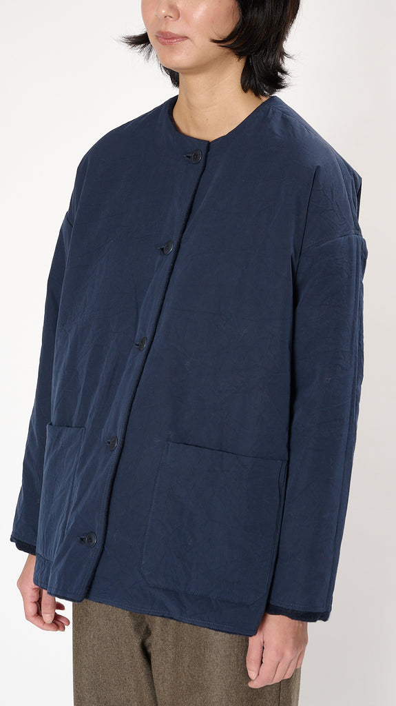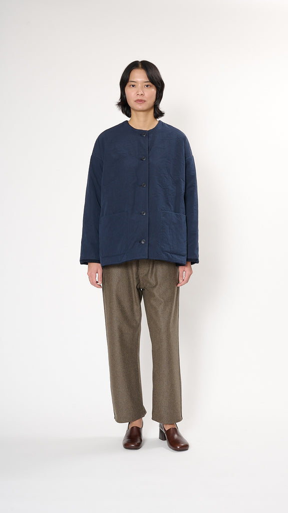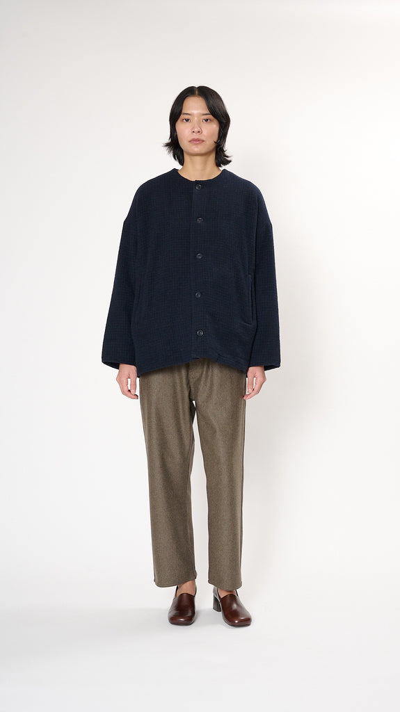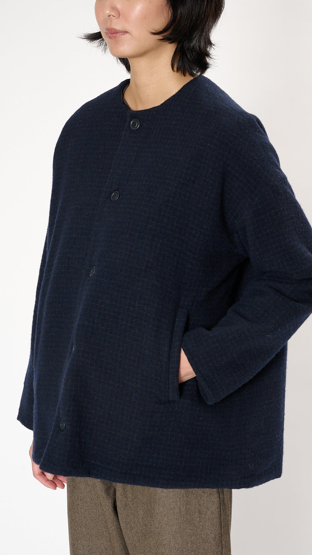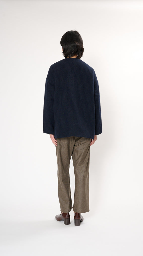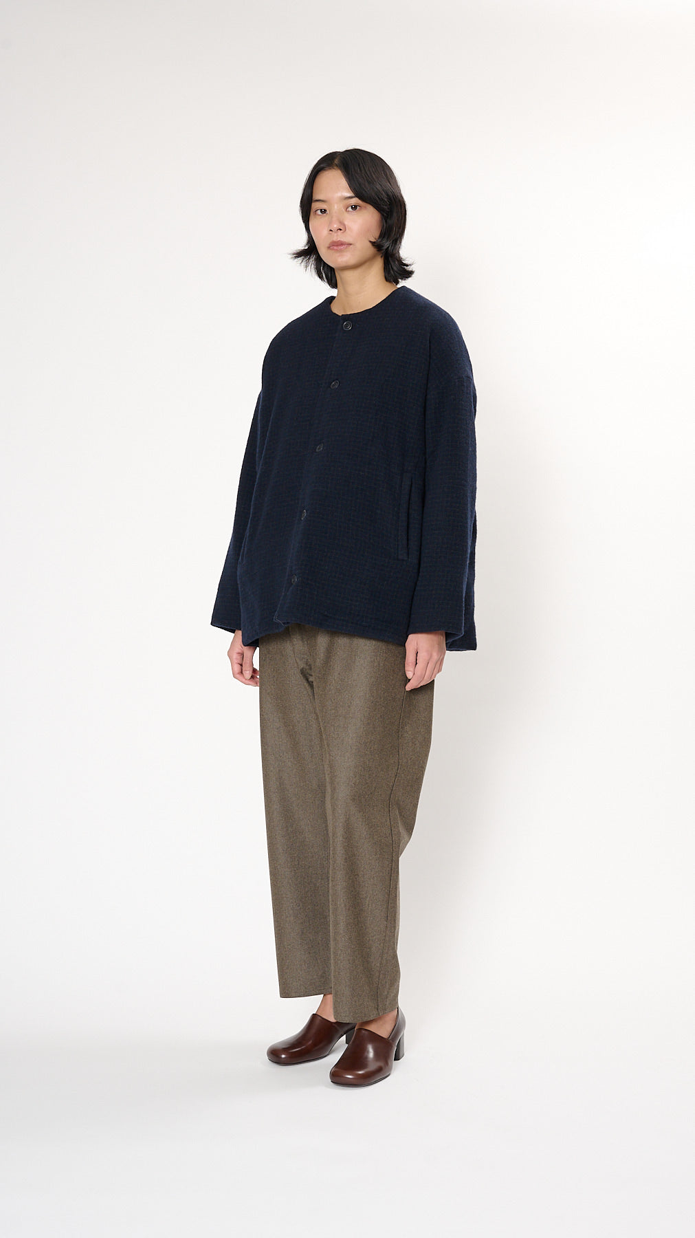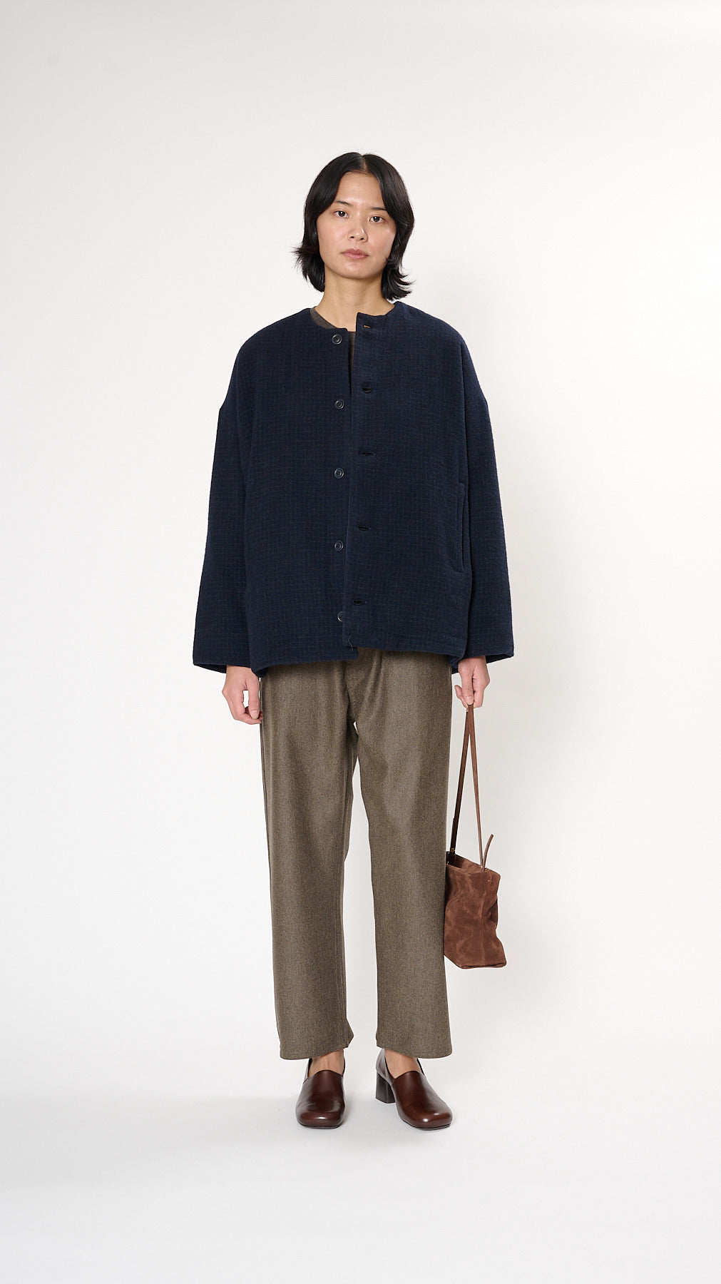 The Julie Jacket has a reversible boxy silhouette made in a miniature check print. It features a collarless, round neckline, a button front, slash pockets on the front and patch pockets on the cotton side.