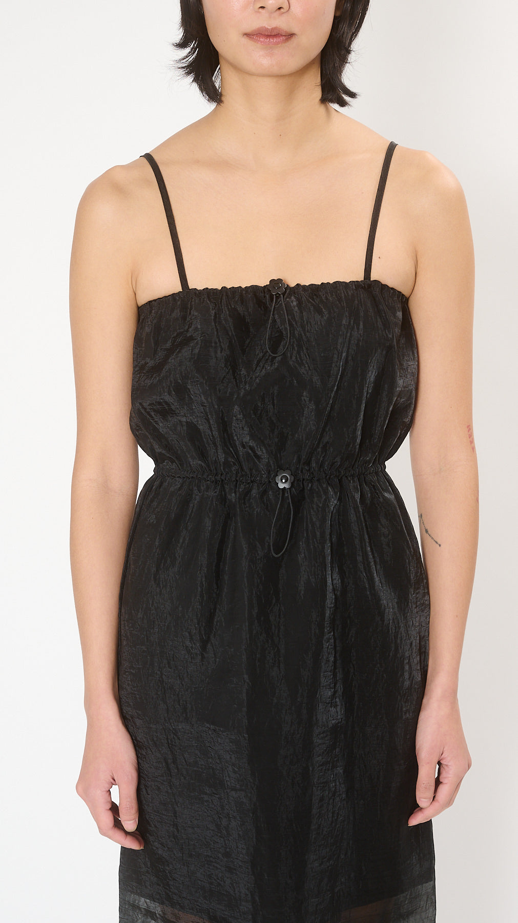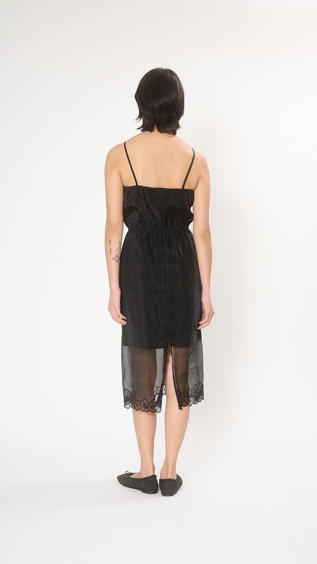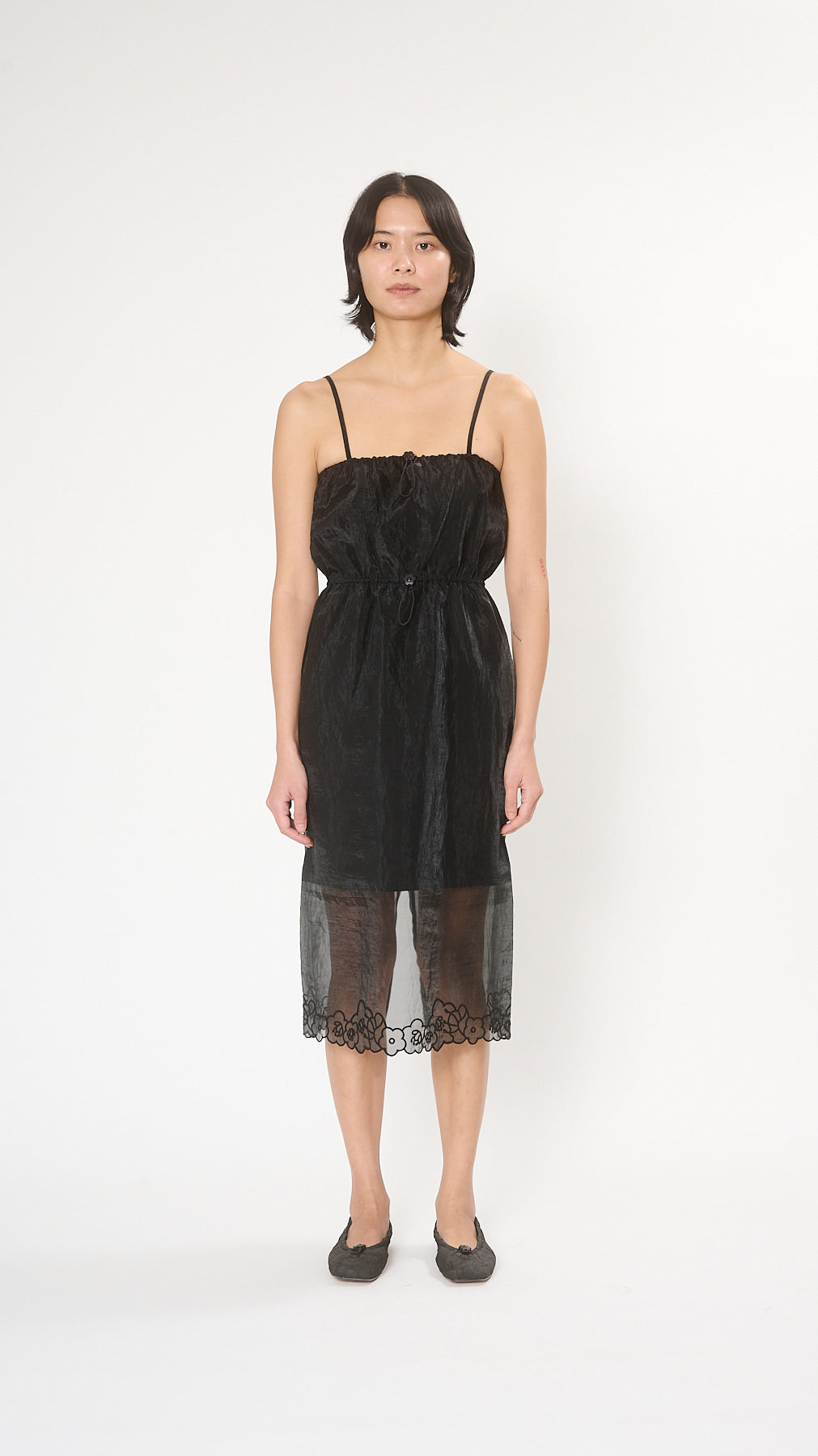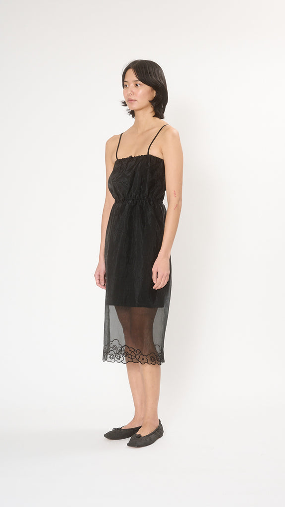 The Barr Dress has a mid-length, relaxed silhouette made of a sheer liquid myrtia. It features a floral motif hem, draw cord bust and waist, a tonal cupro slip lining, and a back hem slit.
