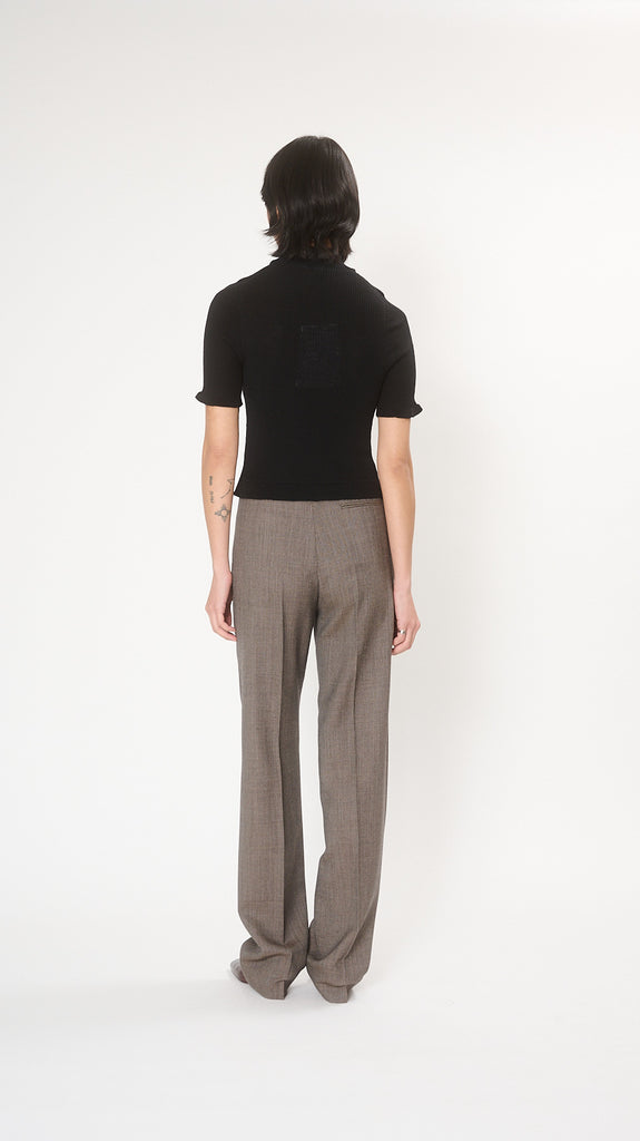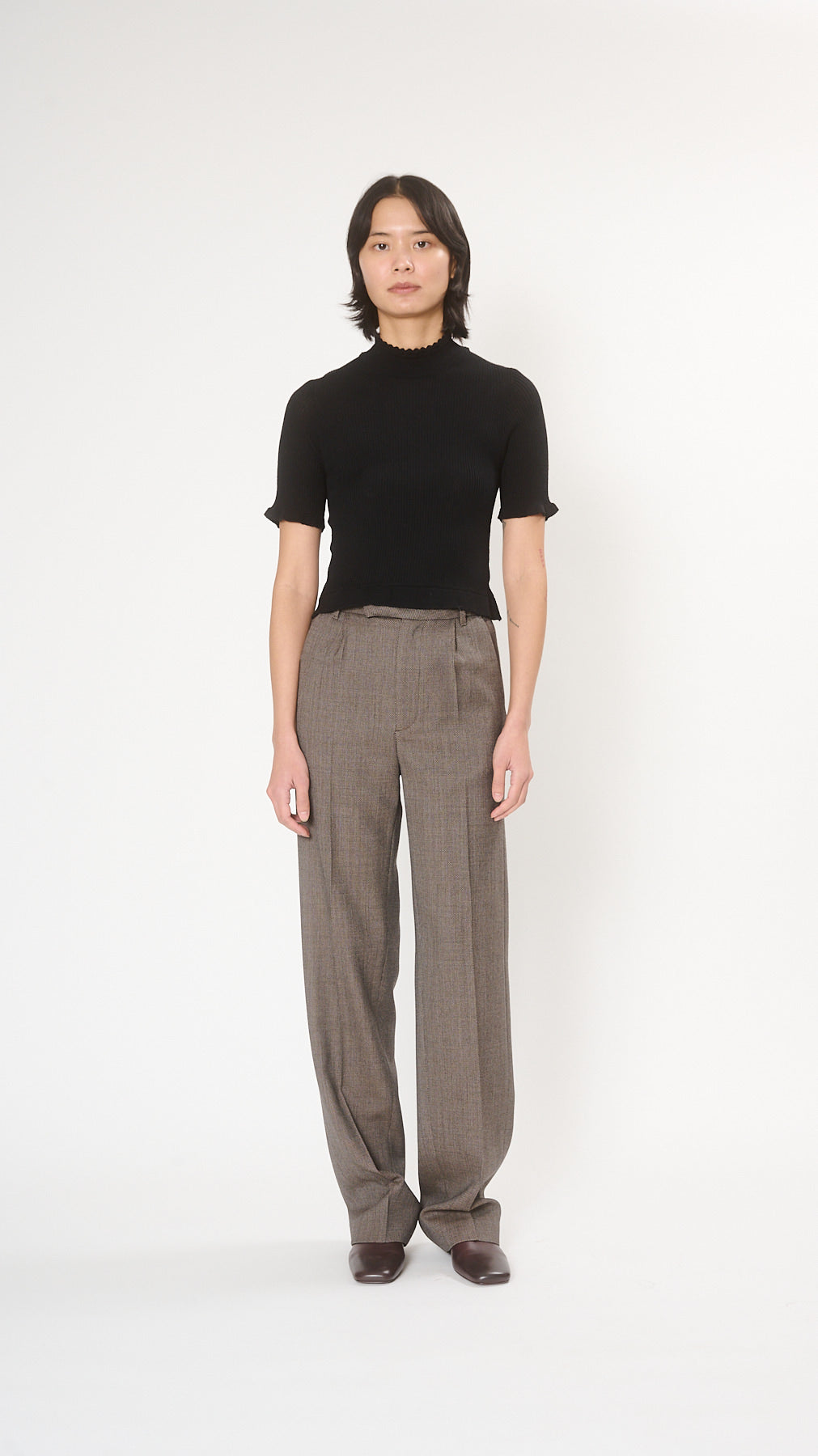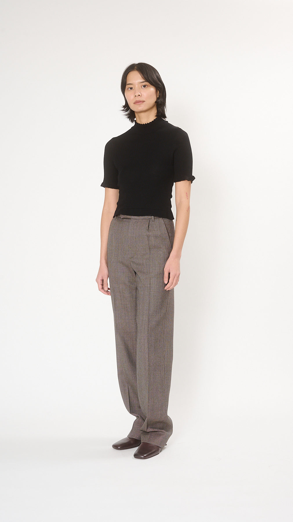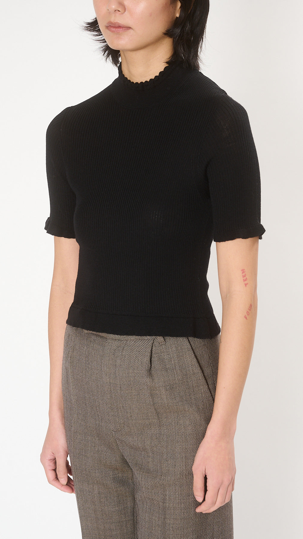 The Bentley Top has a cropped, fitted silhouette made of seamless knit merino wool. It features a scalloped mock neck, short sleeves, and signature ruffles at the hem and sleeves.