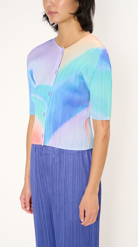 The Groove Cardigan has a slim pleated silhouette with elbow-length sleeves and a button front. The Groove collection features waves of colour, inspired by rhythmic waves.