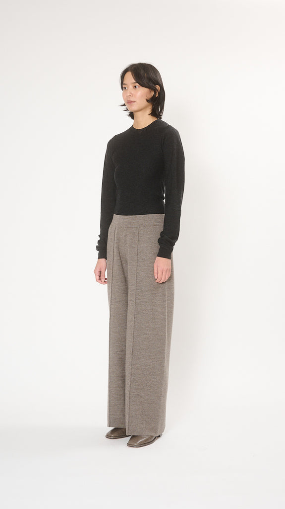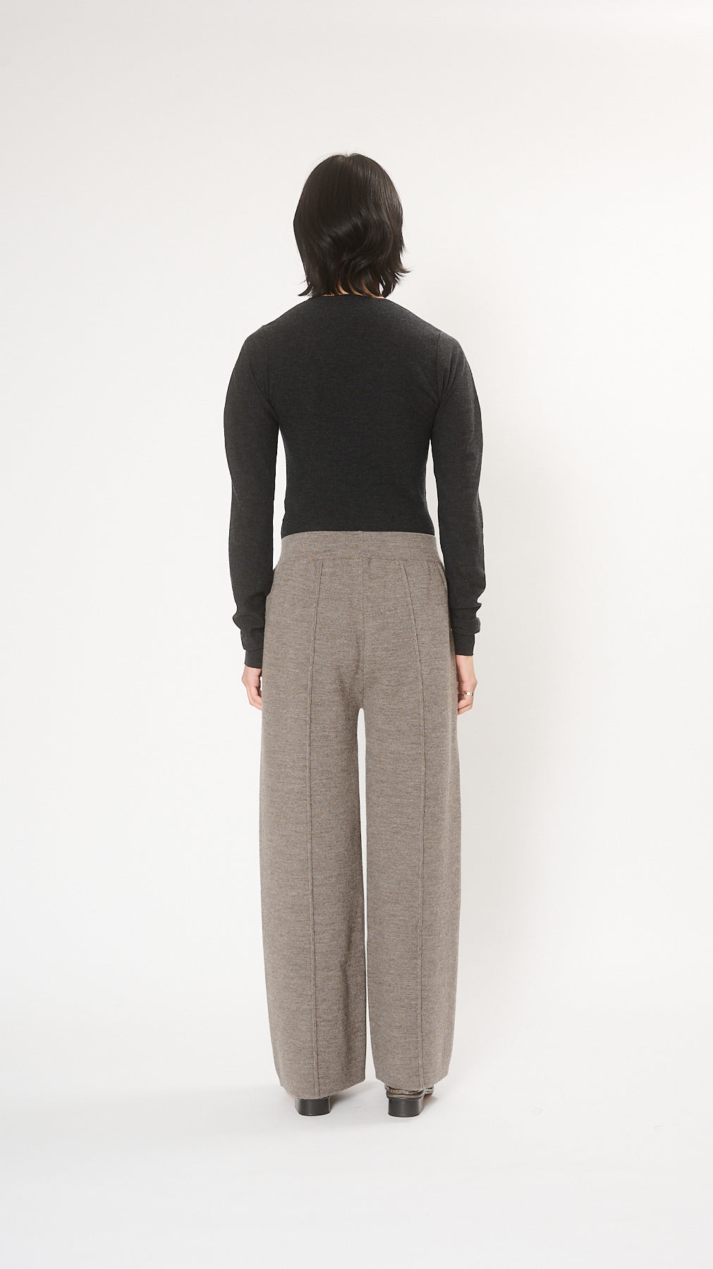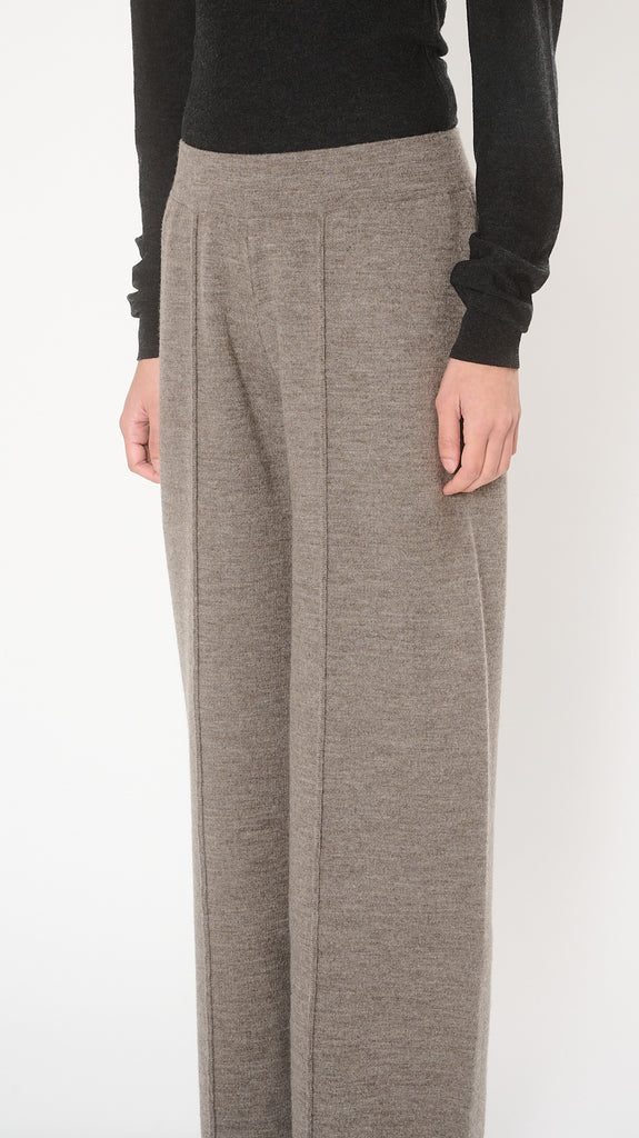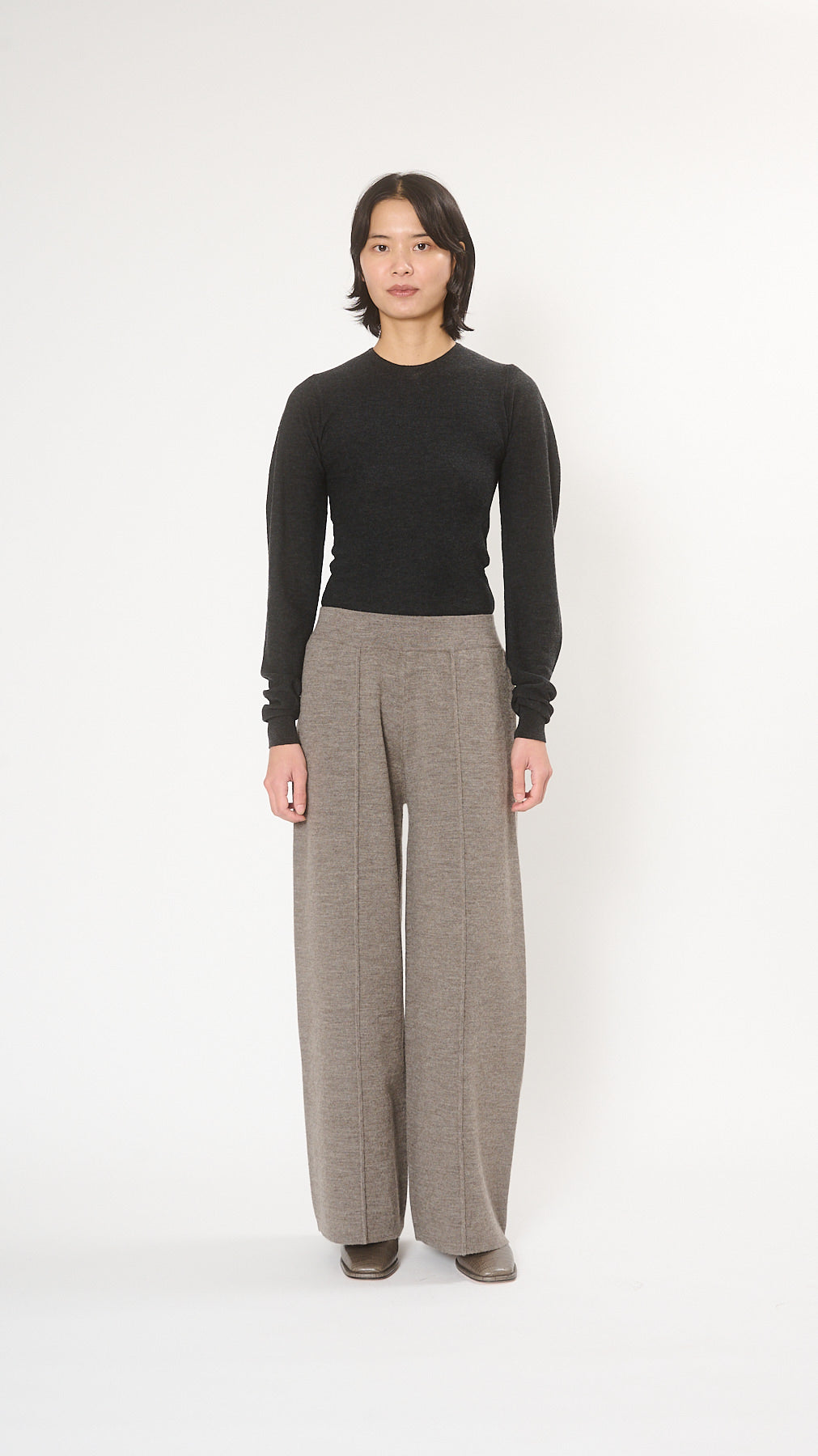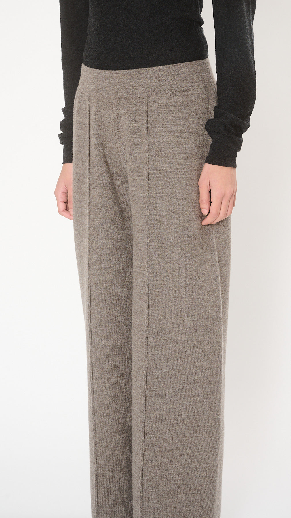 The Double Knit Trouser has a soft, wide-leg silhouette knit of merino-baby alpaca and cotton blend. It features an elastic waist and exposed seams.