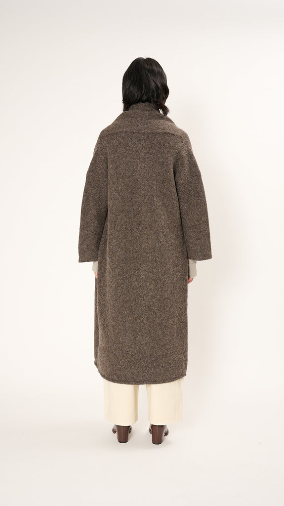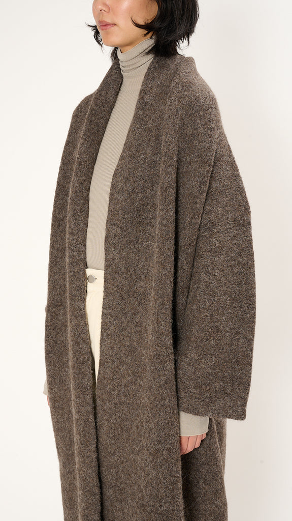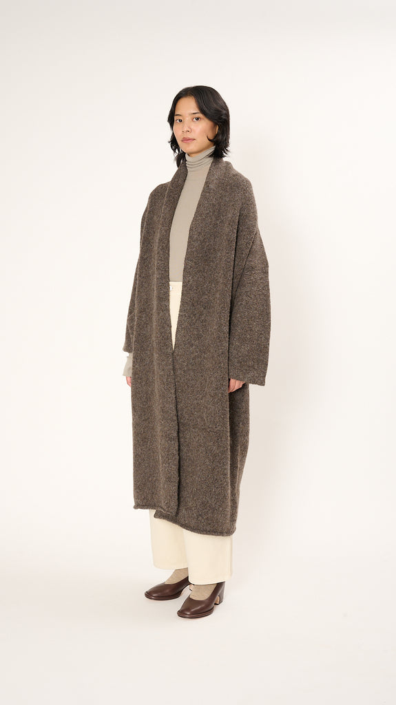 The Long Shawl Cardigan has an oversized fit and side seam pockets. It is part of the LM Essential Collection and is constructed from a softly felted alpaca.