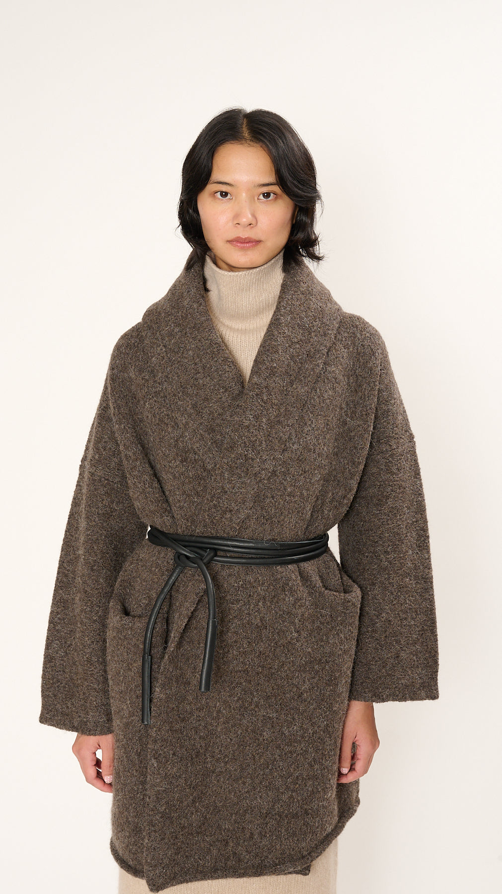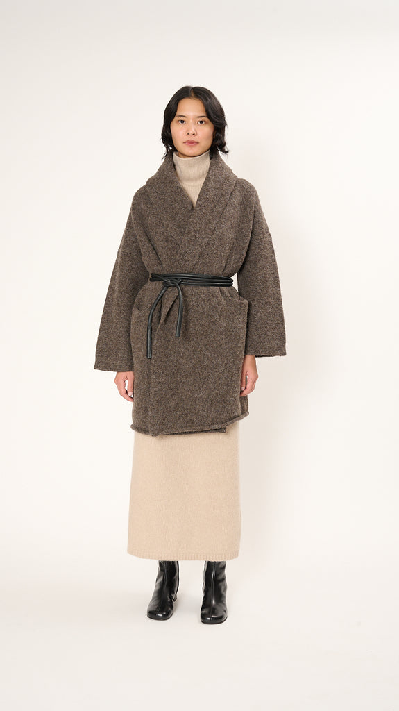 The Rope Belt has a long, wrappable style with a self-tie closure made of vegetable-tanned leather. It features a natural cotton core and hand-stitched finishing.