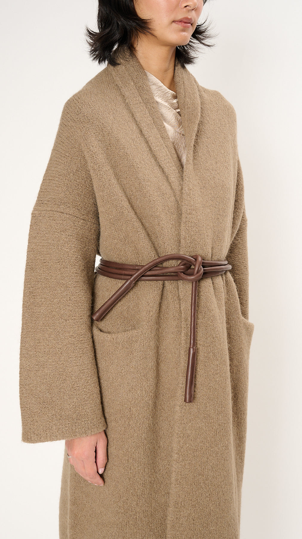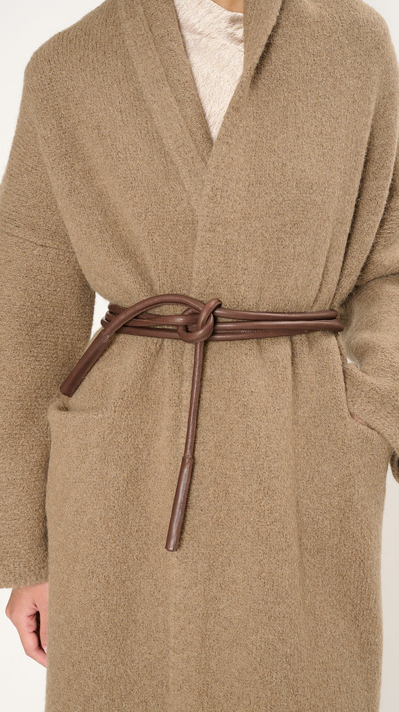 The Rope Belt has a long, wrappable style with a self-tie closure made of vegetable-tanned leather. It features a natural cotton core and hand-stitched finishing.