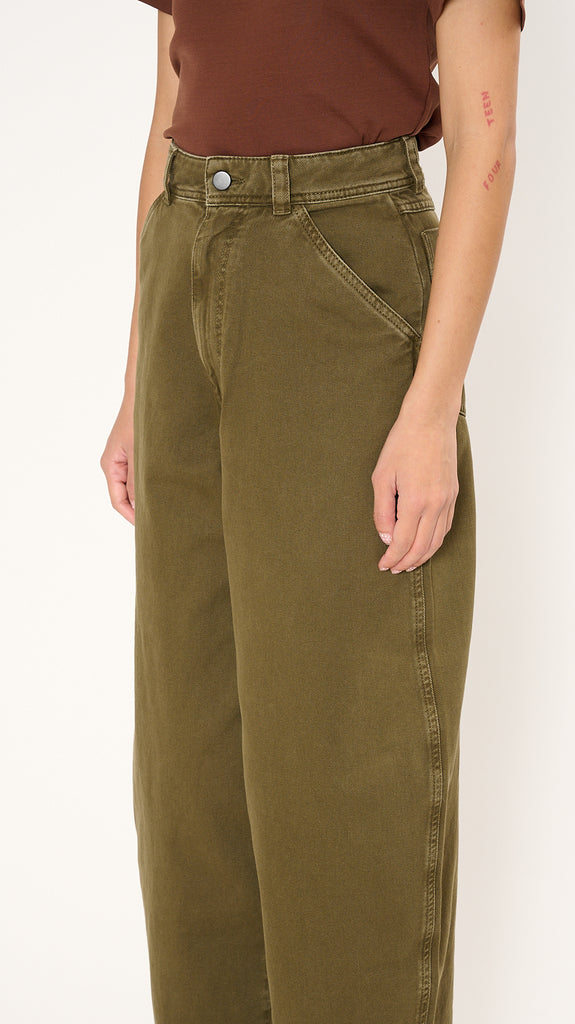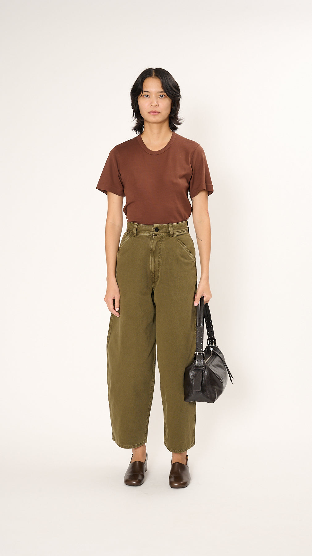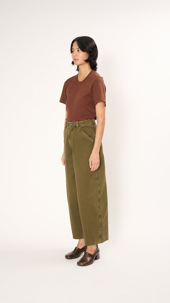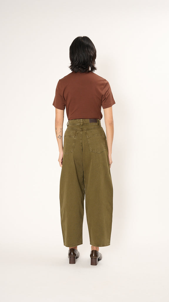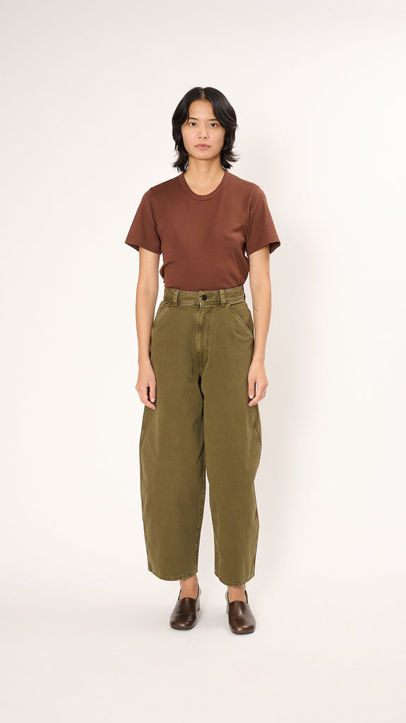 The Large Pants have an oversized silhouette made of garment-dyed medium denim. They feature belt loops at the waistband, a hidden button closure with metal buttons, Italian side pockets, a ticket pocket, and back patch pockets.