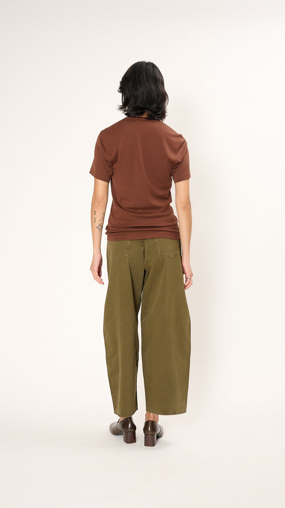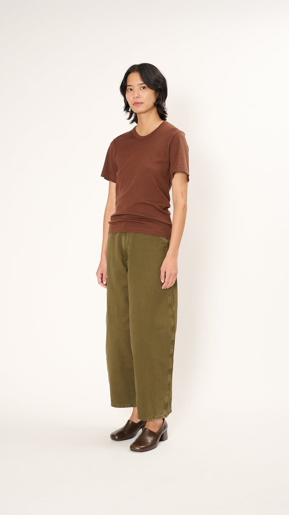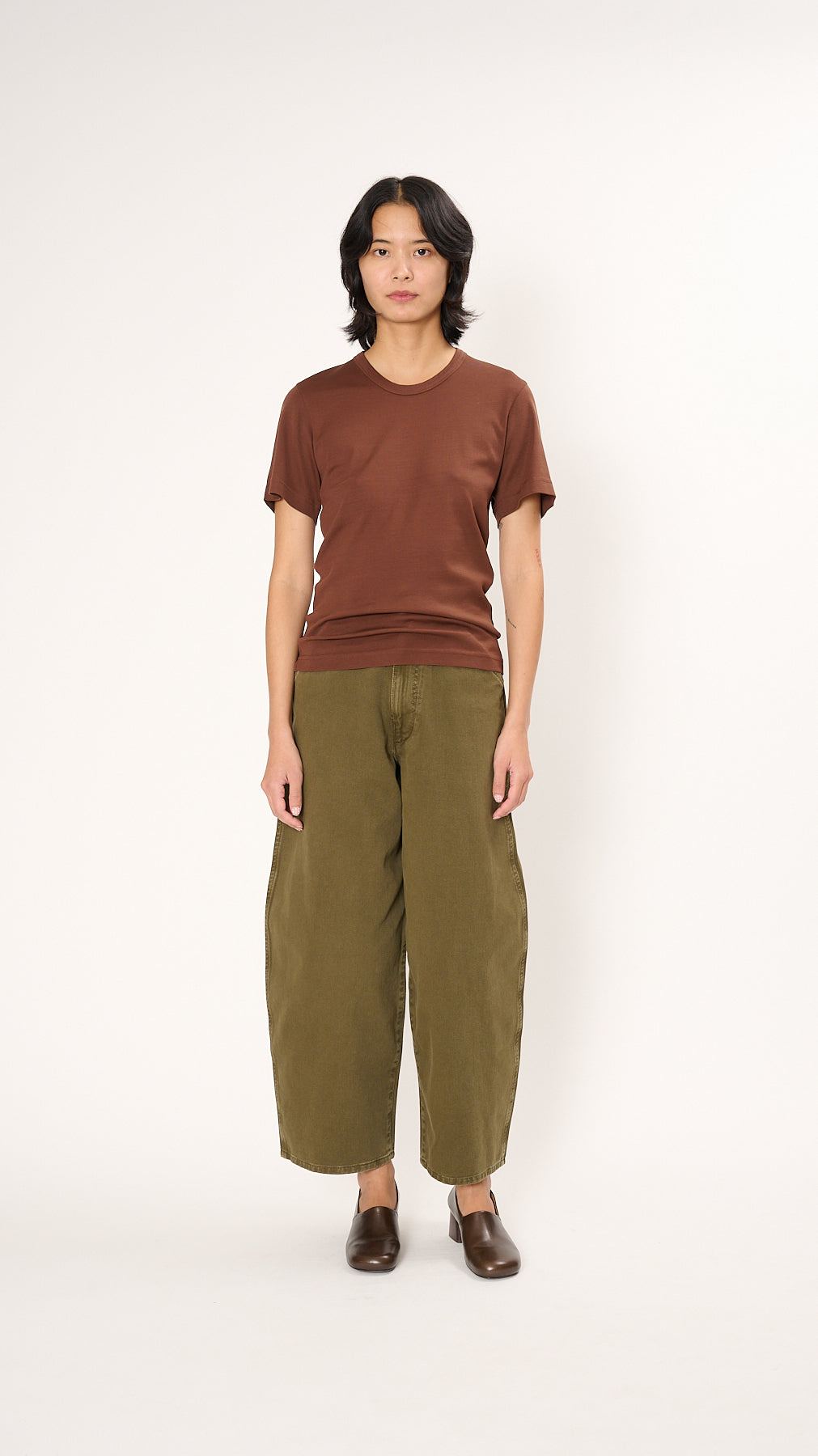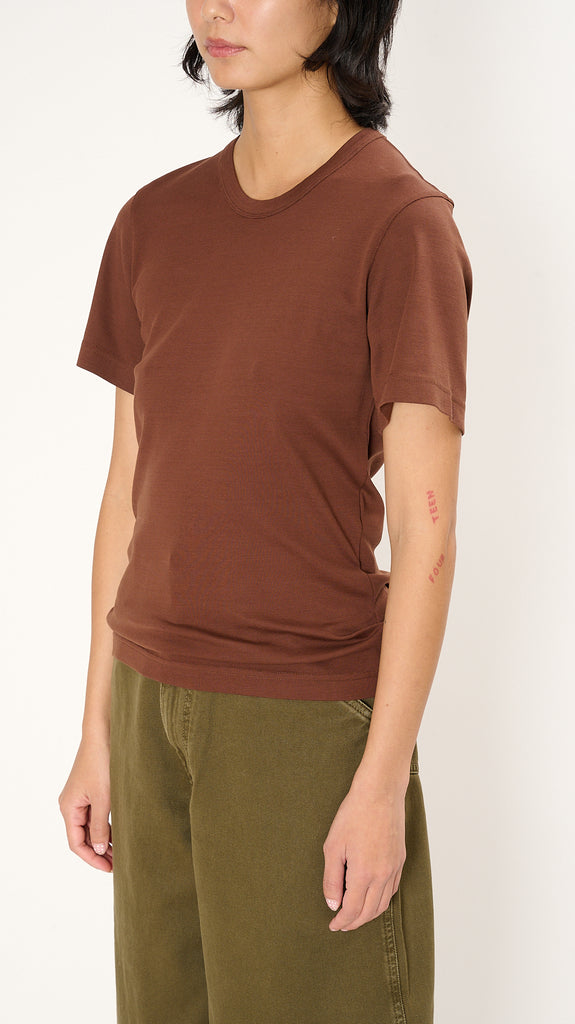The Rib T-Shirt is a Lemaire signature t-shirt with a loose silhouette made of a mid-weight rib jersey. It features a ribbed scoop neck, drop shoulders, and flat lock finishing.