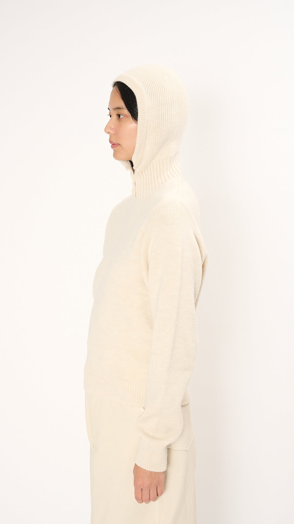The Sweater with Hood has a straight silhouette in an alpaca wool blend. It features a front-buttoned ribbed knit hood and long sleeves, and is finished with rib-knit trim for a clean, structured edge.