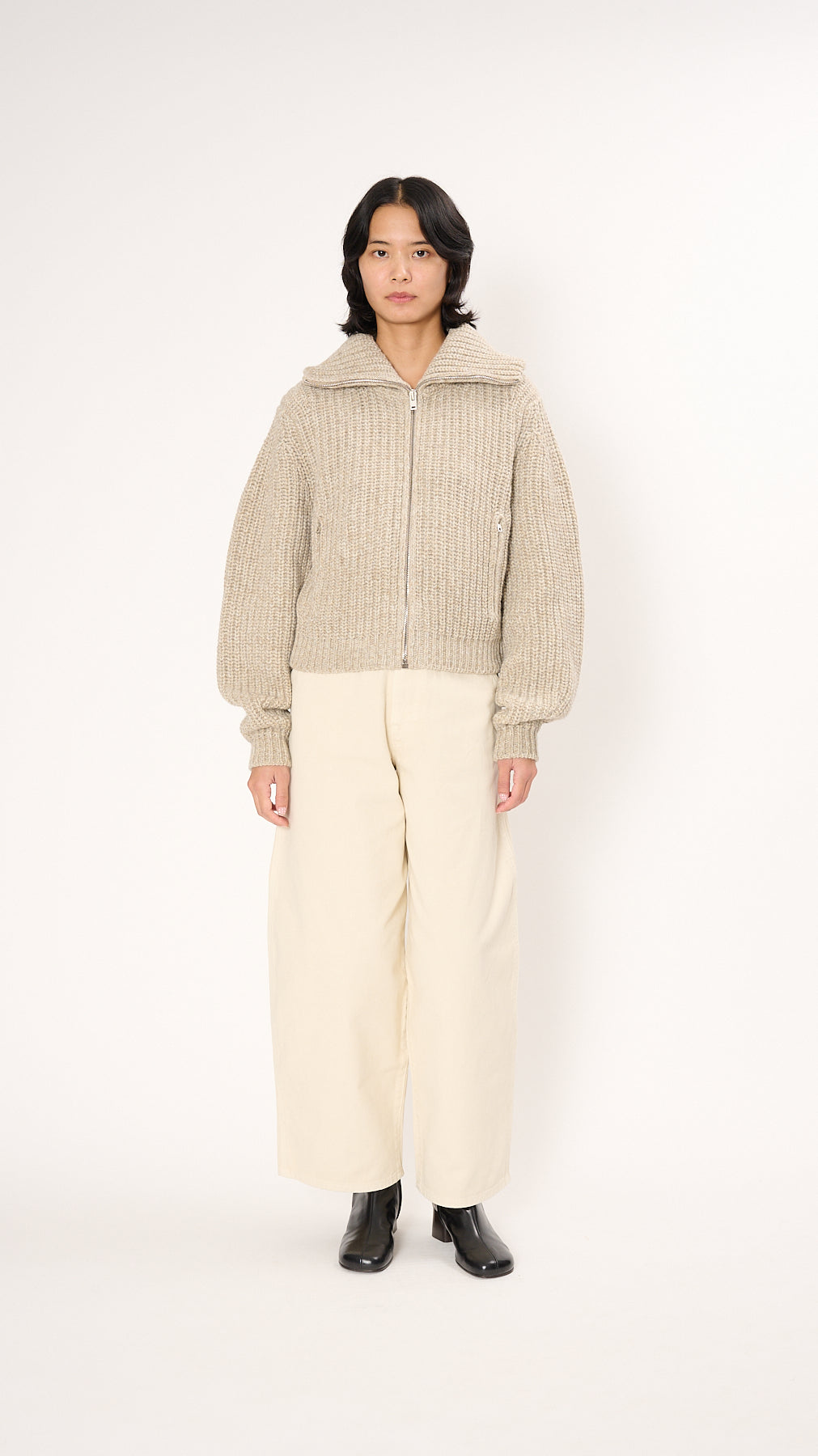 The Zipped Cardigan has an oversized silhouette in alpaca wool and yak. It features a stand-up collar, long sleeves, a metal zipper closure, and zipped side pockets. Finished with rib-knit trim, this short-length style combines warmth with relaxed, modern proportions.