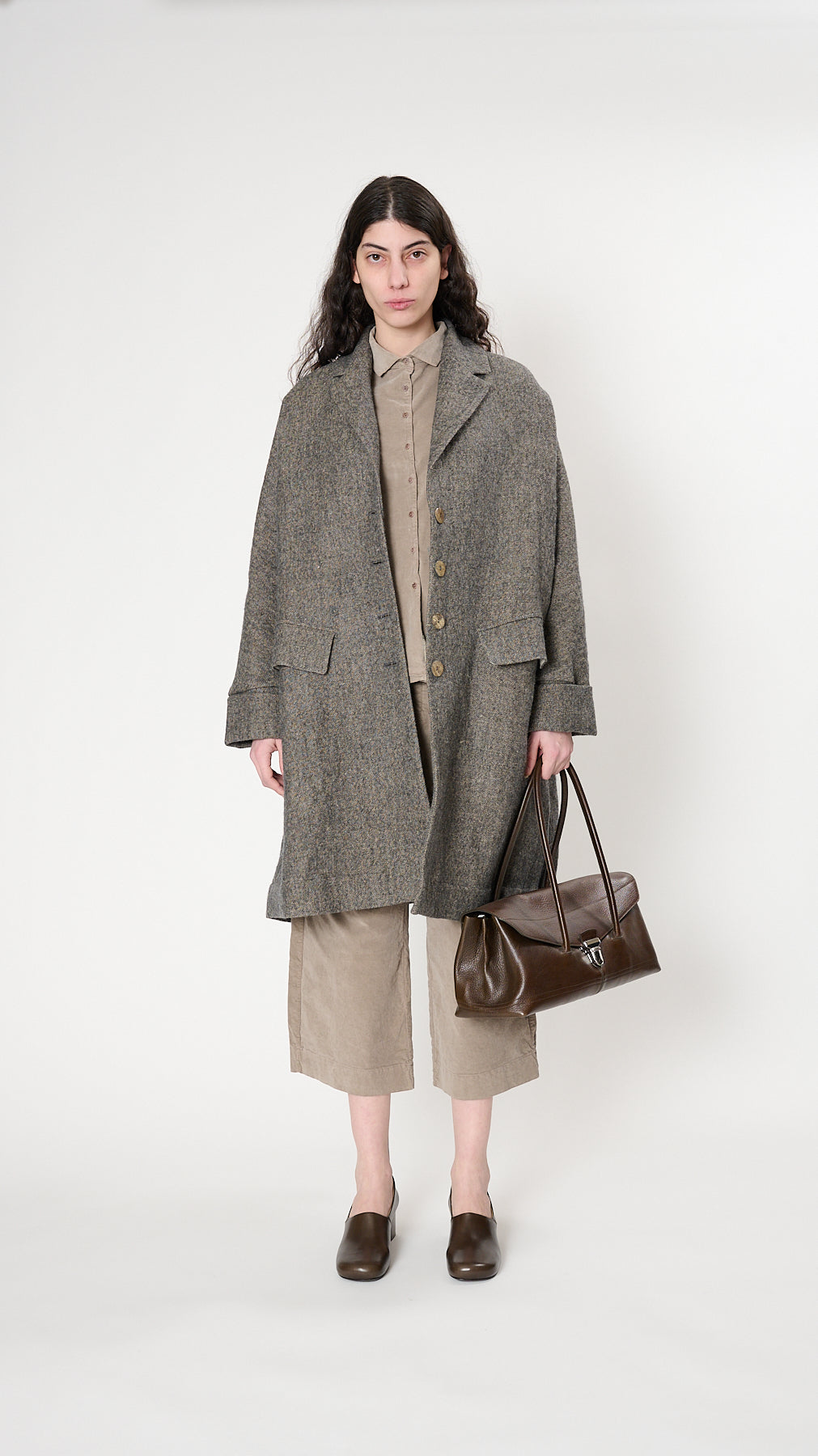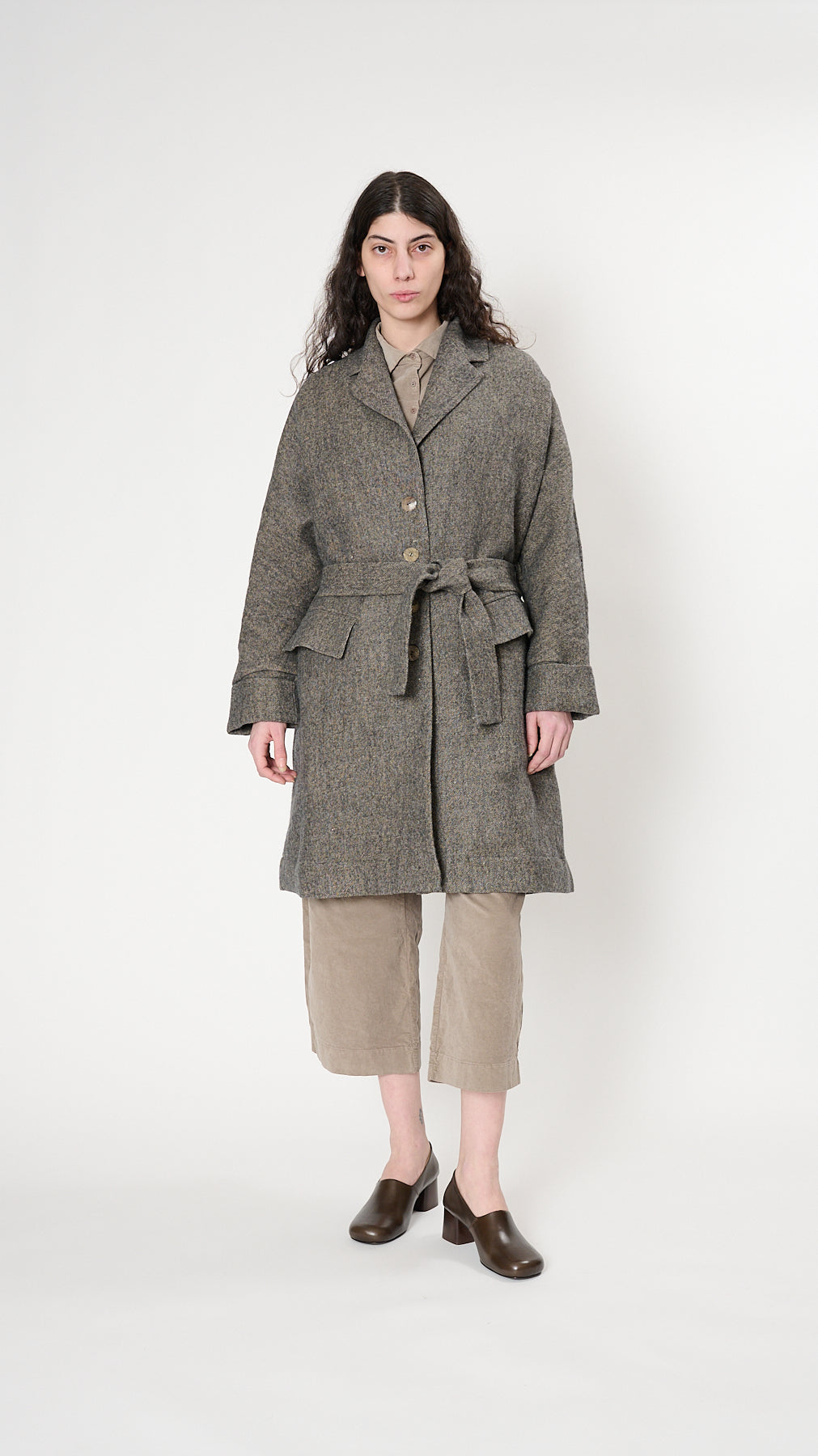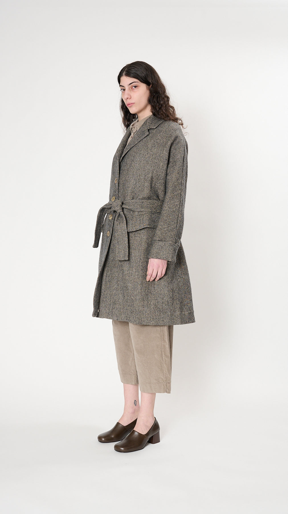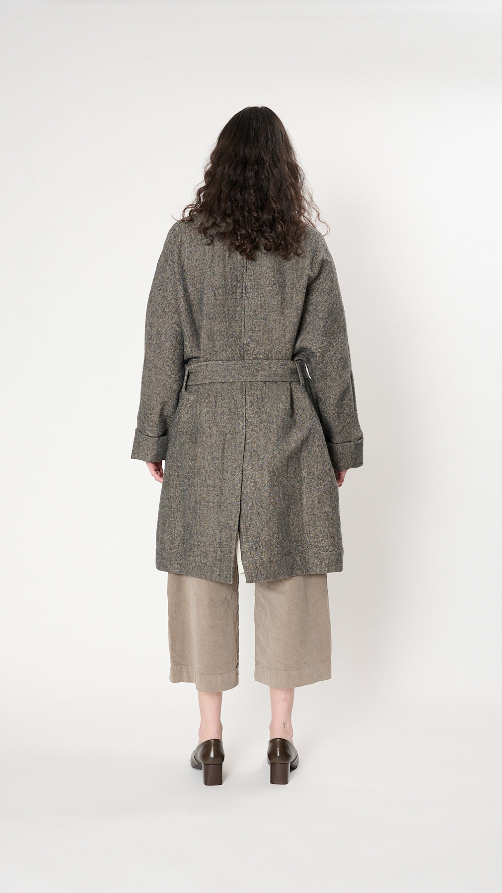 The Wrap Coat has a relaxed, wide silhouette crafted of a marled hemp-wool blend. It features a classic collar, button front, raglan sleeves with cuffs, flap hip pockets, and a self-tie belt.