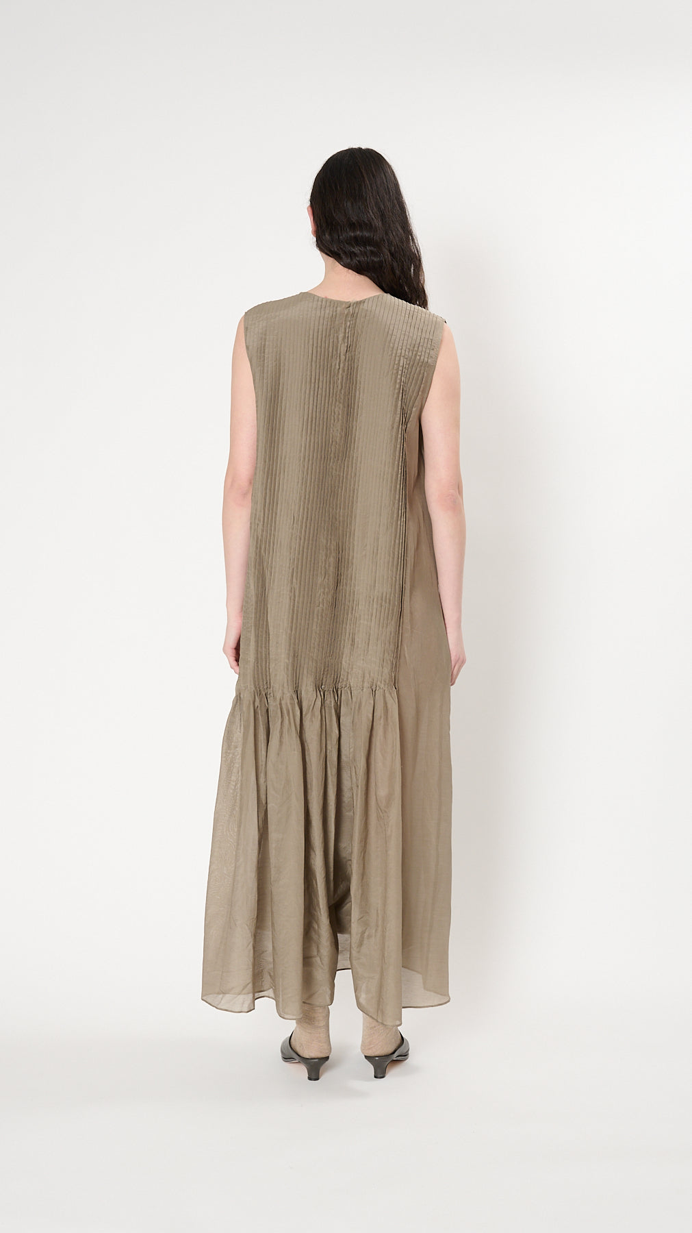 The Sheer Pleat Dress has a relaxed silhouette crafted from a sheer cotton-silk blend. It features hand-folded and sewn pleat panels with a keyhole and button back neck closure.