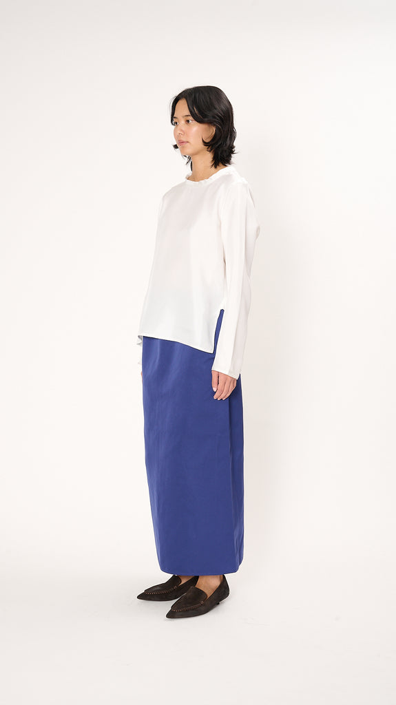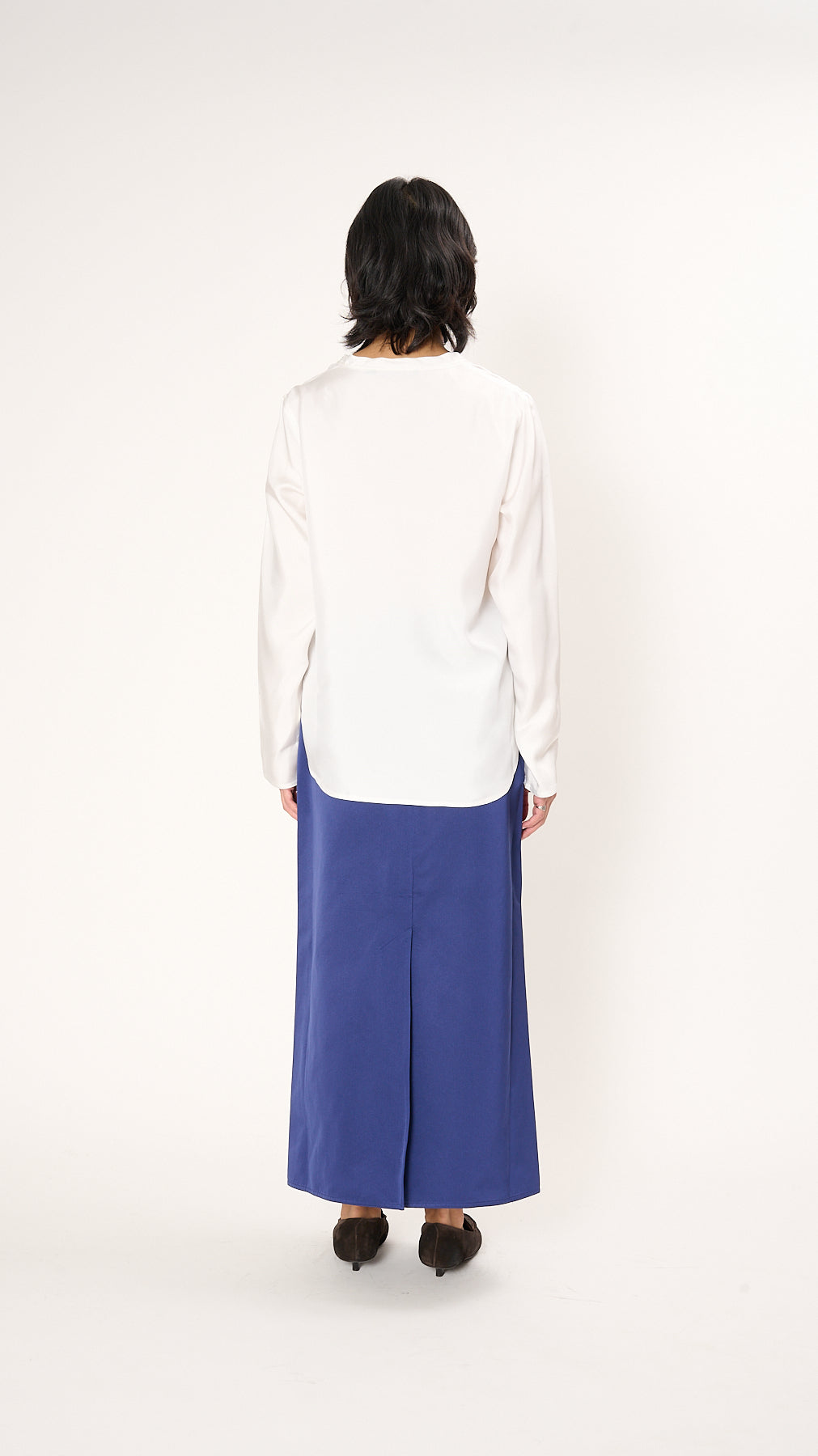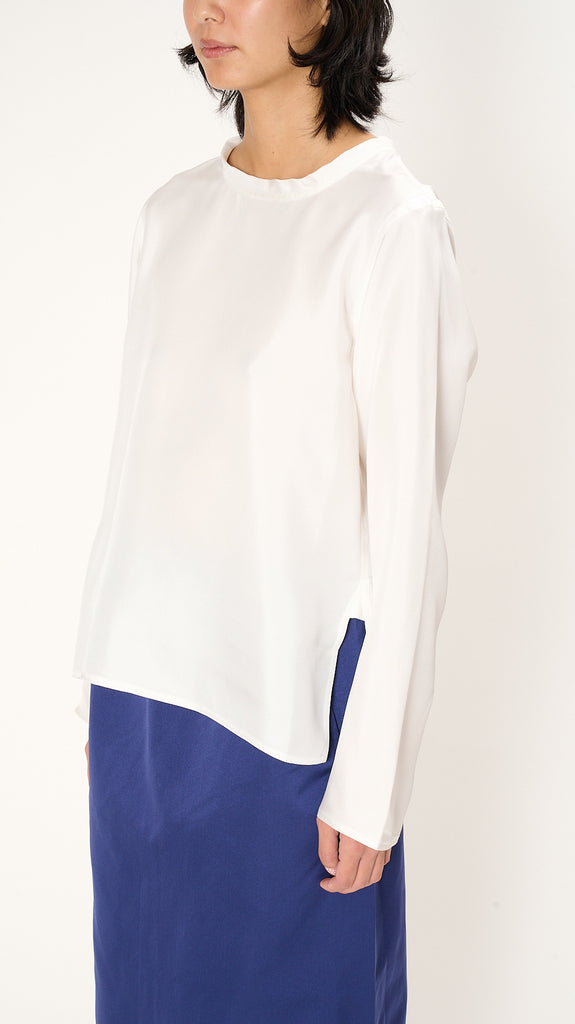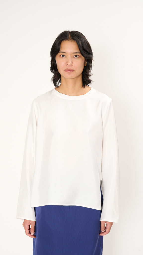 The Bach Long Sleeve Shirt has a relaxed silhouette made of natural silk. It features a round neck, long sleeves, and a softly curved hem.