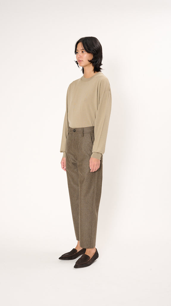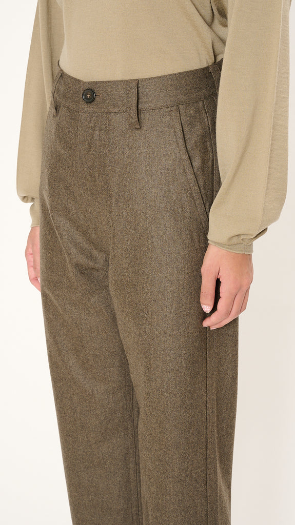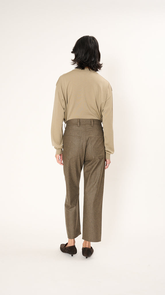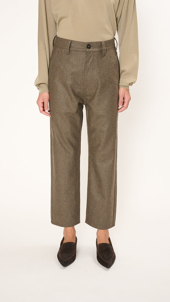 The Pan Pants are a mid-rise with a straight, cropped leg. They feature a slightly dropped crotch, button and zip fly, belt loops, slant front pockets, and patch back pockets.