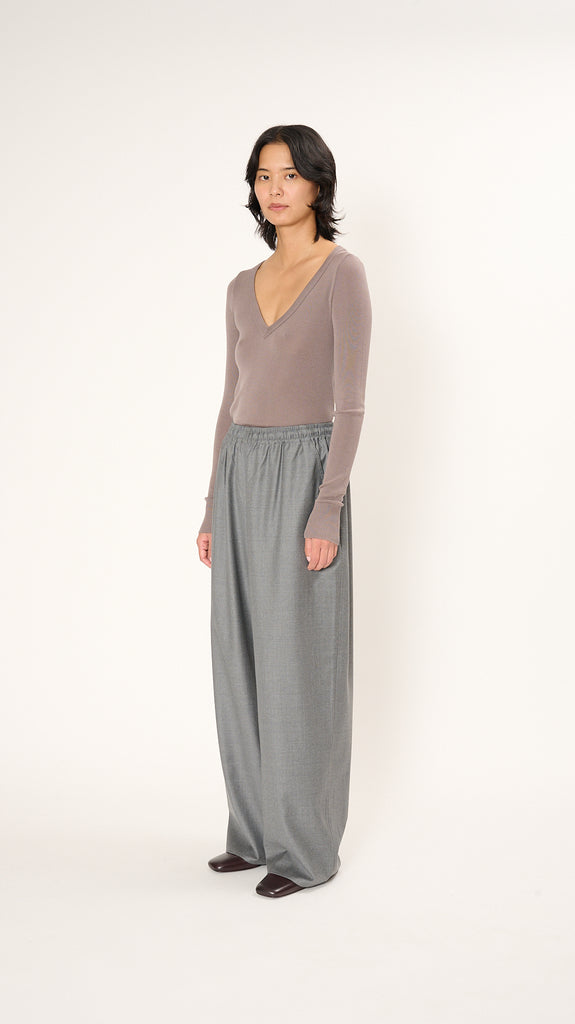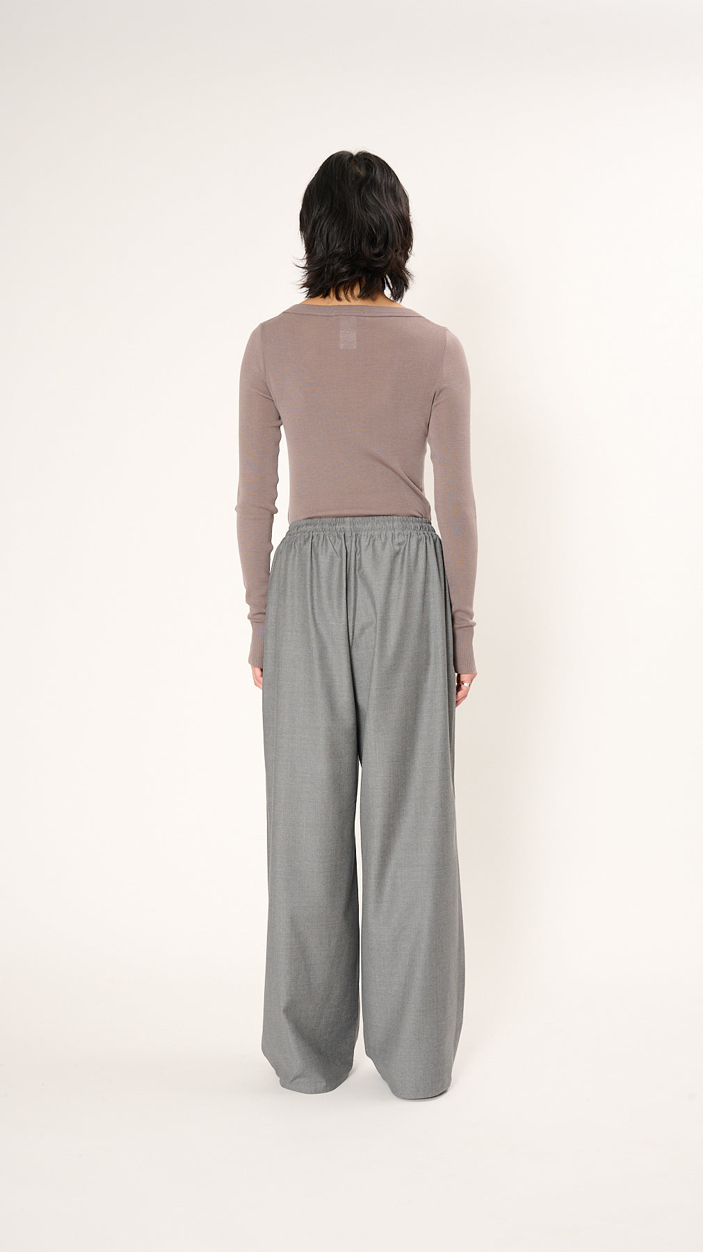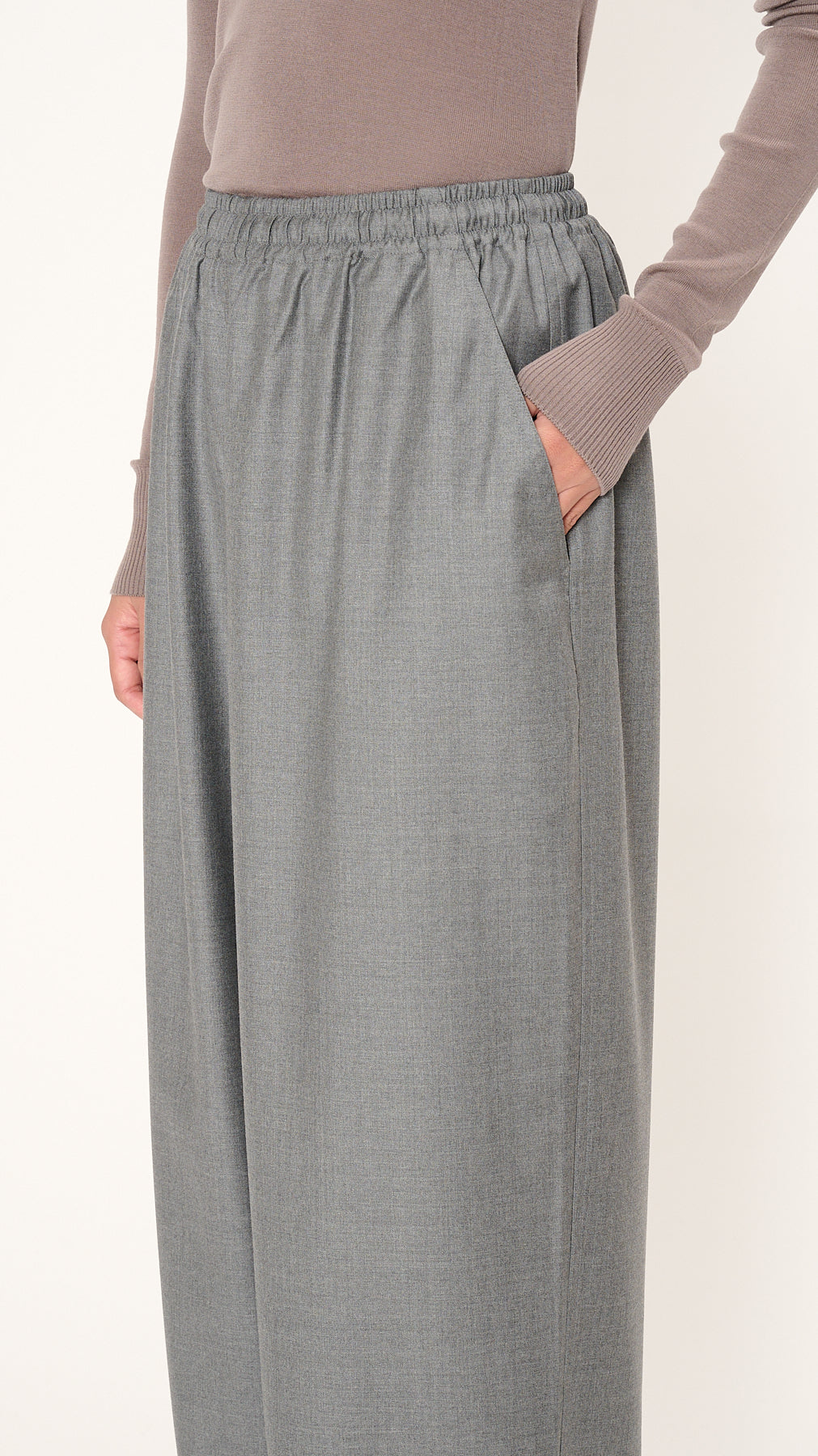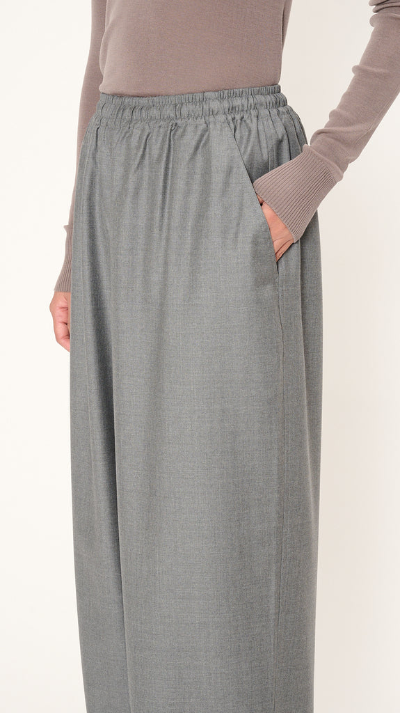 The Pasch Pants have a wide, straight-leg silhouette made of fine wool. They feature an elastic waistband with an internal drawstring and side pockets.