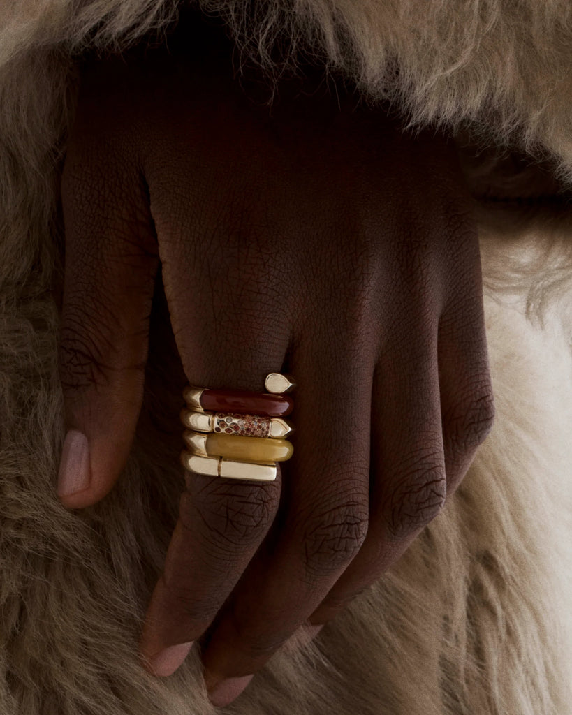 The Oera Coil Ring features an 18k yellow gold tube, interrupted by carnelian, which asymmetrically wraps around the finger with one end scattered with set sapphires and brown diamonds. Inspired by Ianna's Knot, the ancient Mesopotamian symbol of fertility and protection, the Oera Collection is the brand's first.